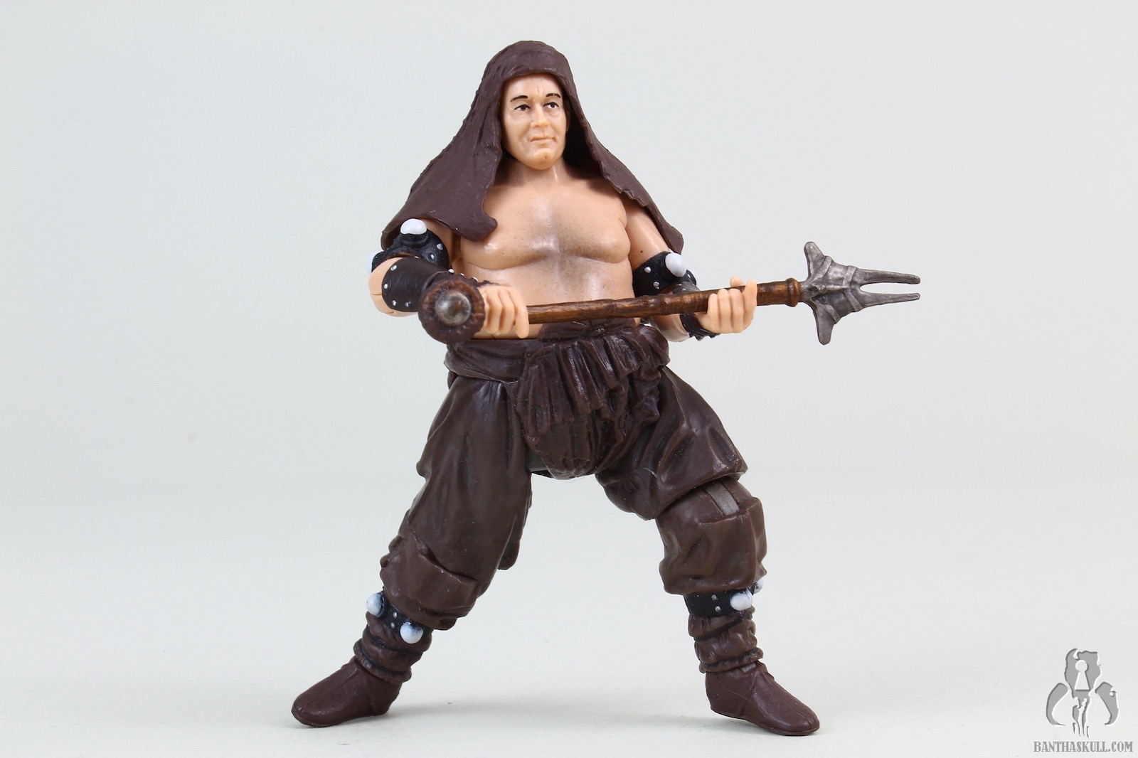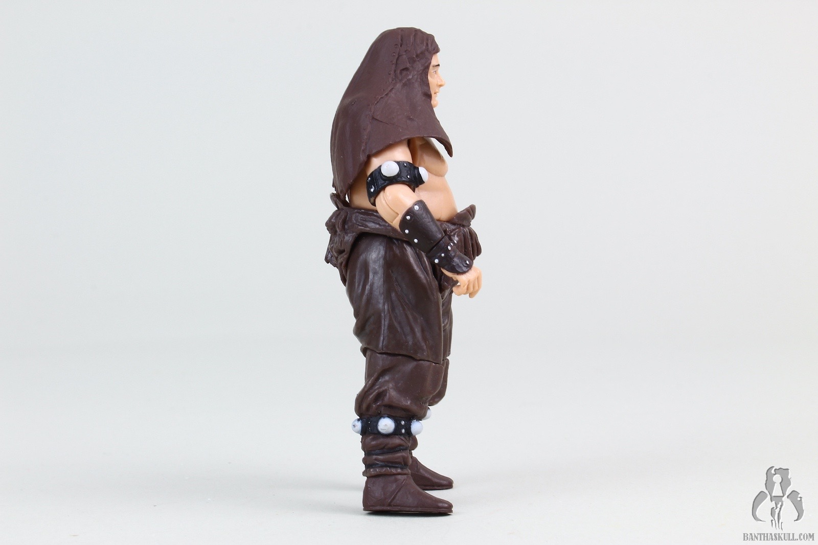 The biggest difference is in the articulation. Here you might say that 5POA is sufficient for a character that lacks any kind of dynamism. But I say that the super-articulation makes this a real action figure, and allows you to alter Malakili’s stance, and even put him into a fighting pose. I mean, wrangling a rancor isn’t easy, and I don’t think Jabba would hire a keeper that had no knees or ankles. I’d say such a guy would be more rancor food than rancor keeper. The hips and knees aren’t as rangey as most other SA figures, but it does the job. One slight complaint is that the removable cowl will easily bump off if you try to articulate the shoulders to far above the horizontal. It’s not terrible, and I guess preferable to a non-removable piece, which is what the POTF2 version sports.