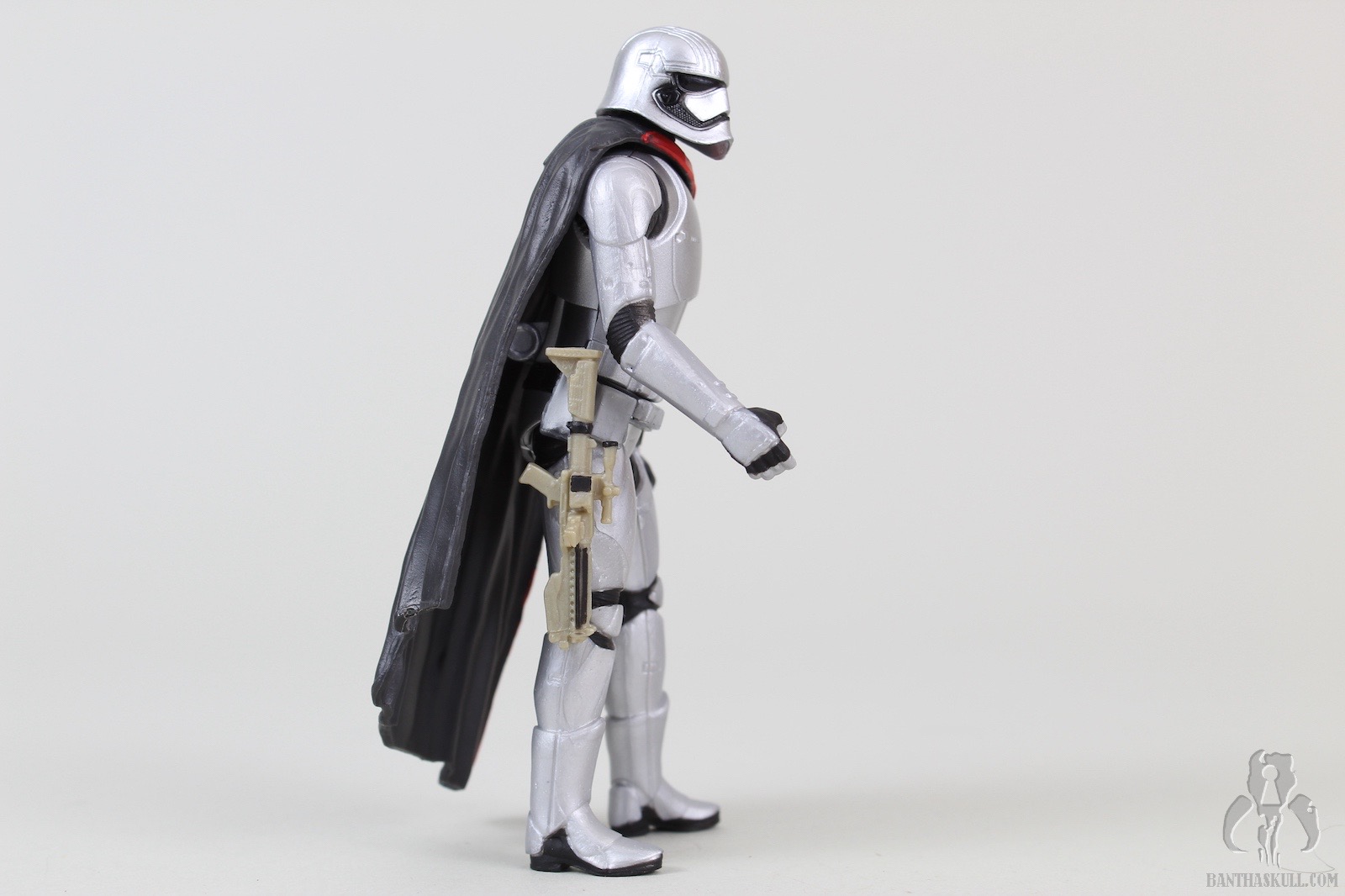 Then we have Phasma, a near-straight repack of the TFA basic version. The figure itself isn’t bad at all. It looks good, with a very nice sculpt, and some simple but accurately applied paint detailing. Like FO stormtroopers, Phasma has the “hip-notch” holster, so her weapon can be stowed at her side. The plastic cape looks nice, and is removable. The joints are solid, she holds the weapon fairly well (sans THWG), and she looks good on the shelf. One thing that my sample has an issue with is standing up straight. She has to be pose hunched over a bit, which is annoying. I assume this is mostly due to the center of balance needing to accommodate the huge accessory.