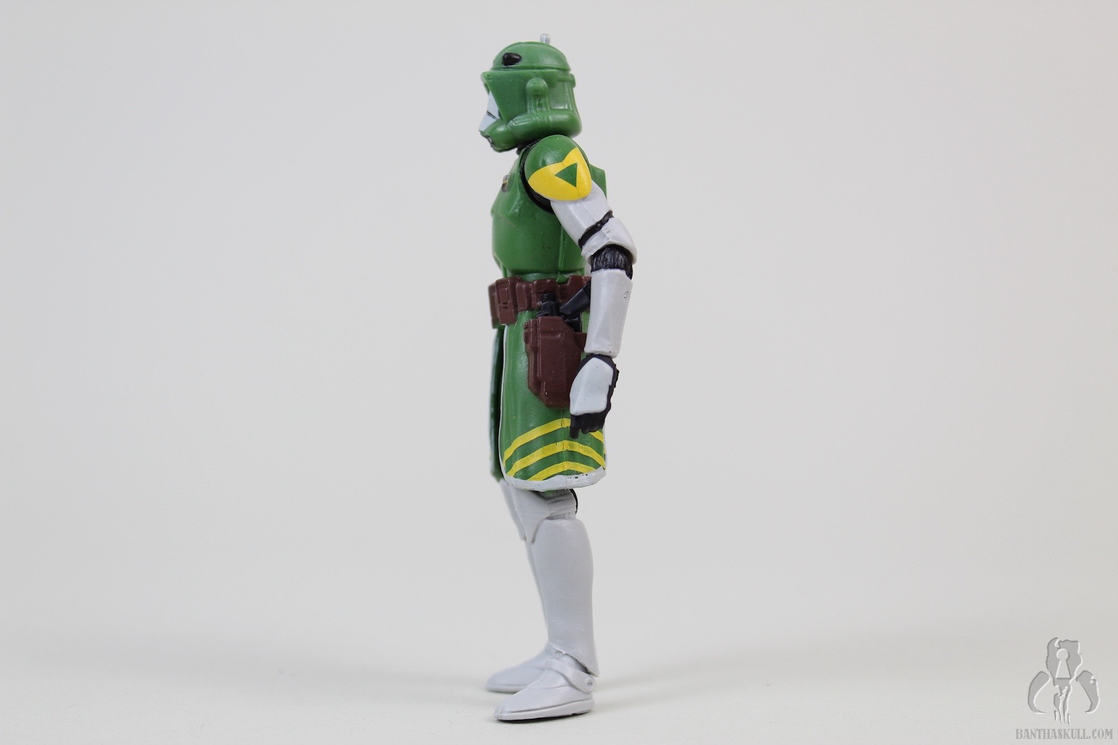 This is a pretty good figure. It’s a quality sculpt, with a lot of detail throughout, although there’s not much that’s mind-blowing. The helmet is similar to the style that Cody uses, with the “brow shield”. He also has a sculpted kama. The rest of the figure is fairly standard for clones. He’s got 14 points of articulation, but some of those points are notable. The wrists are of the “ball-jointed” variety, or perhaps, more accurately, a swivel/hinge combo. This is great as it allows for subtle pose variations, particularly when holding weapons. While that’s a positive, there are a couple of negatives as well. The waist is a simple swivel joint, instead of the ball-jointed chest that many armored troopers have had in the past. Also, the hips are swivel, rather than the more appropriate ball-joints, so this does hinder a lot of action poses that might otherwise be possible. Finally, the ankles are of the type that don’t fully roll inward or outward, so again, wide leg stances are hindered because the feet can’t always stay flat and stable. The soft plastic kama is sculpted in such a way that it allows the legs to move fairly freely, but the hips are limited anyway because they’re only swivel joints.