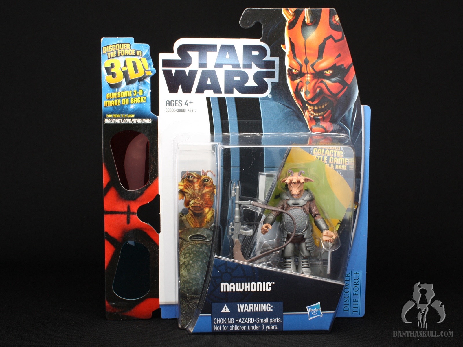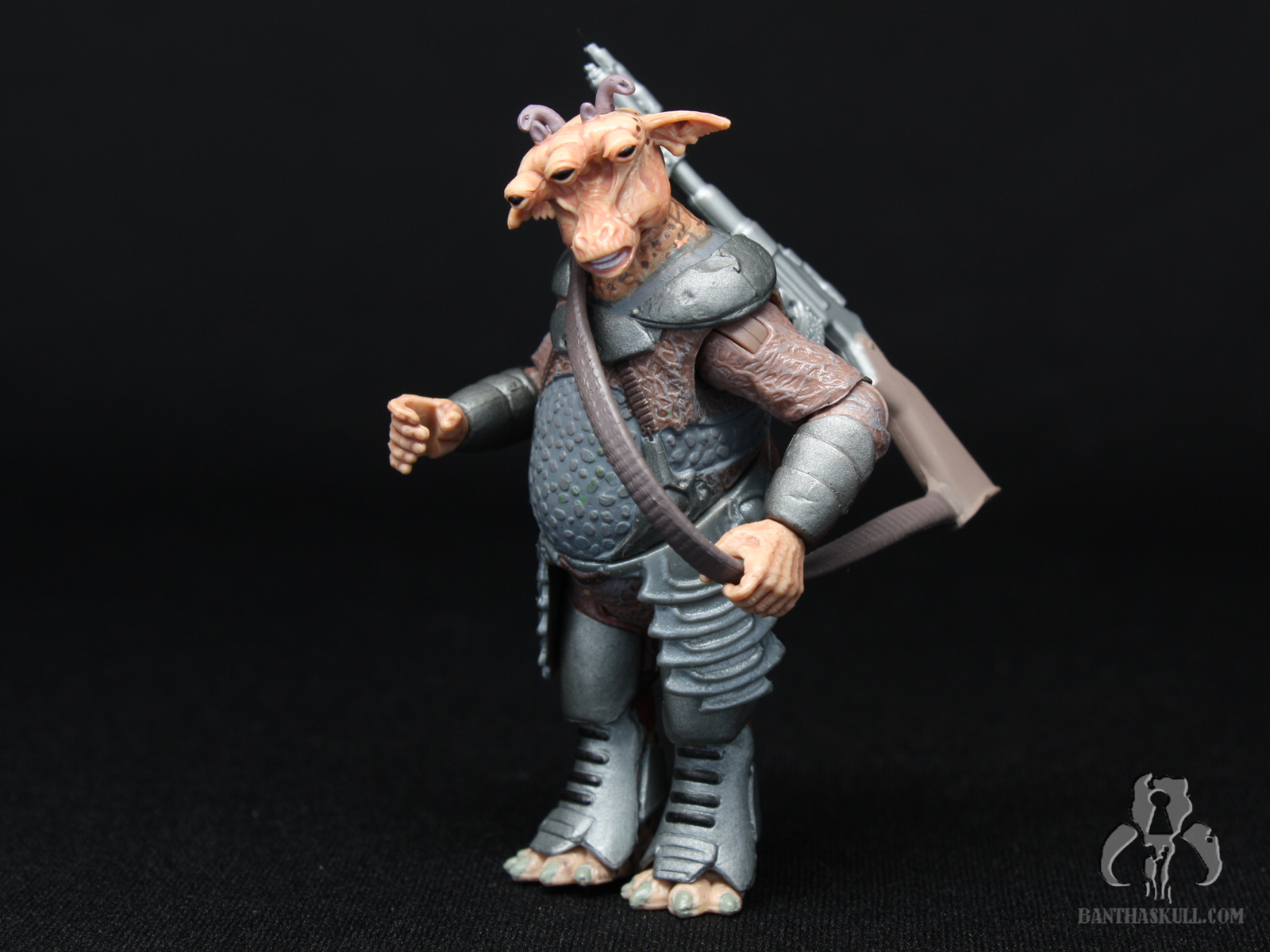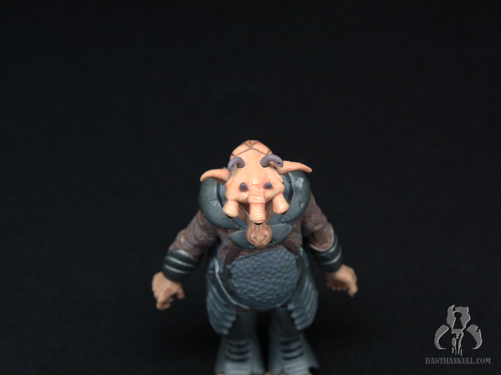 According to Wookieepedia Mawhonic tops the charts at 1.22 meters tall. In ‘merican that means “pretty dang short, I tell you what.” Alternatively, that’s 4 feet tall. In the Star Wars line where 6’ is scaled down to 3.75” that means the figure should stand 2.5” tall. The Mawhonic figure measures just a hair taller than that. So my initial impression that this figure was tool small, was wrong. It’s pretty close to being exactly in scale. It’s the older Episode I line figures you might pose him with that are out of whack.