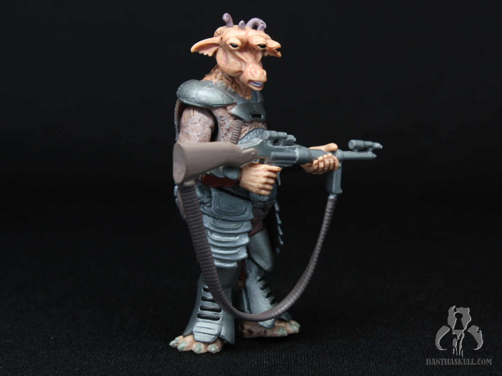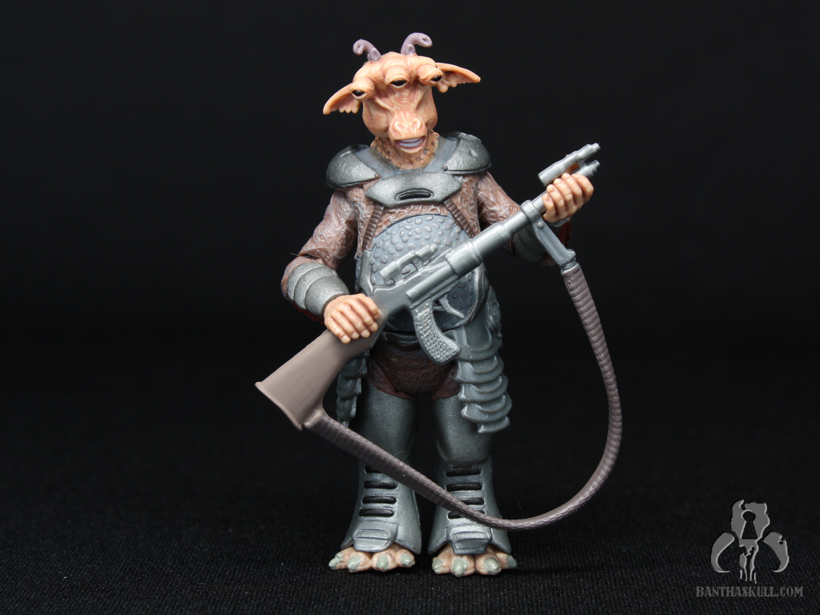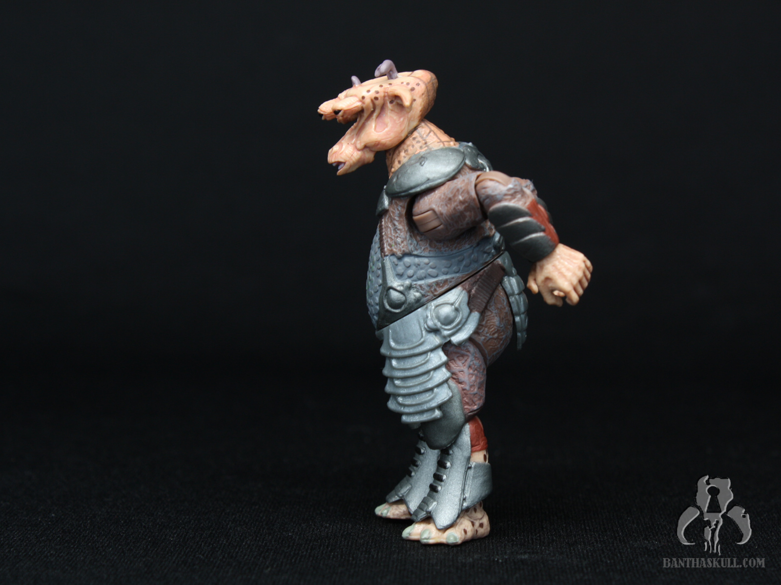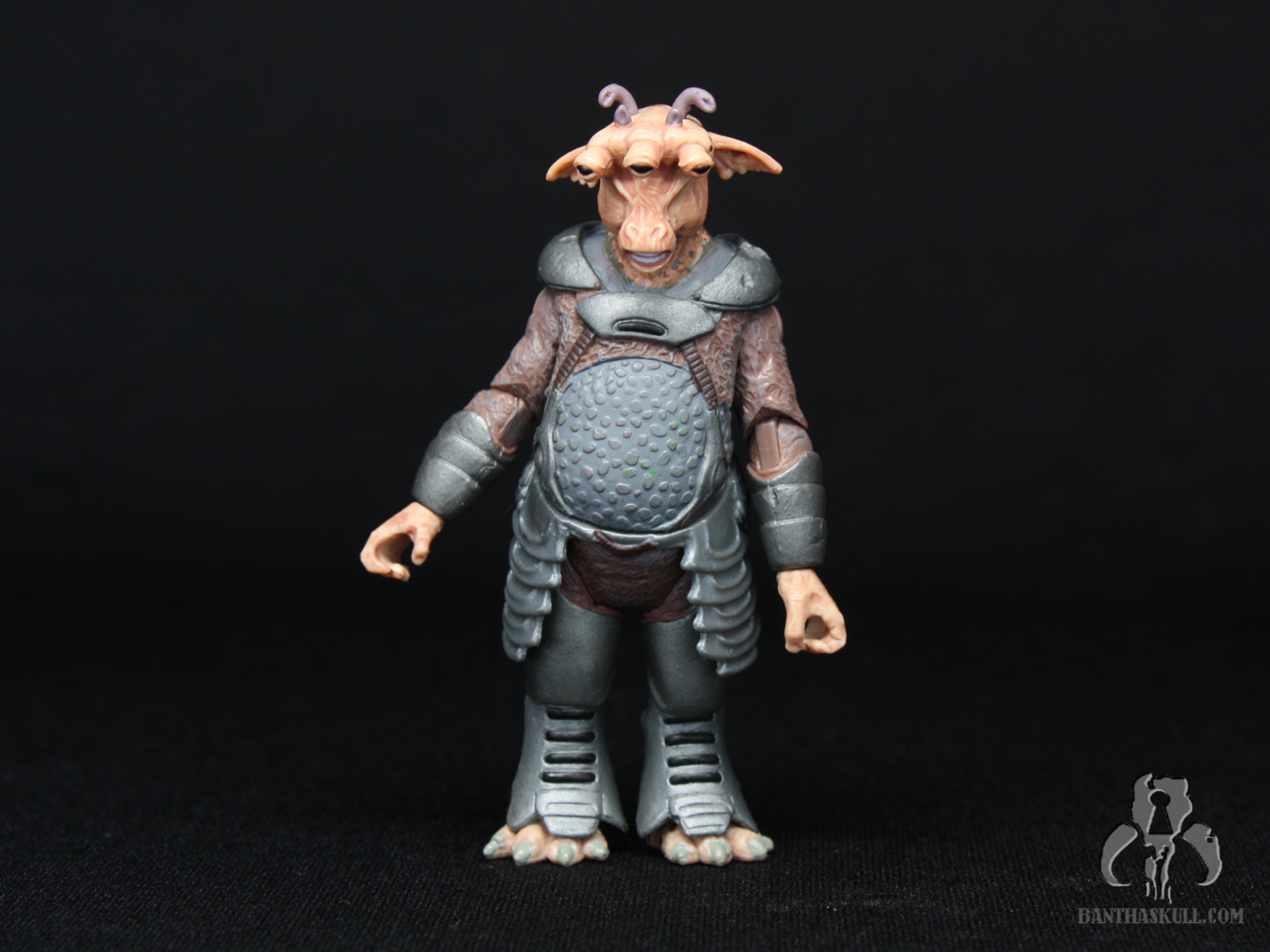 According to Wookieepedia Mawhonic tops the charts at 1.22 meters tall. In ‘merican that means “pretty dang short, I tell you what.” Alternatively, that’s 4 feet tall. In the Star Wars line where 6’ is scaled down to 3.75” that means the figure should stand 2.5” tall. The Mawhonic figure measures just a hair taller than that. So my initial impression that this figure was tool small, was wrong. It’s pretty close to being exactly in scale. It’s the older Episode I line figures you might pose him with that are out of whack.