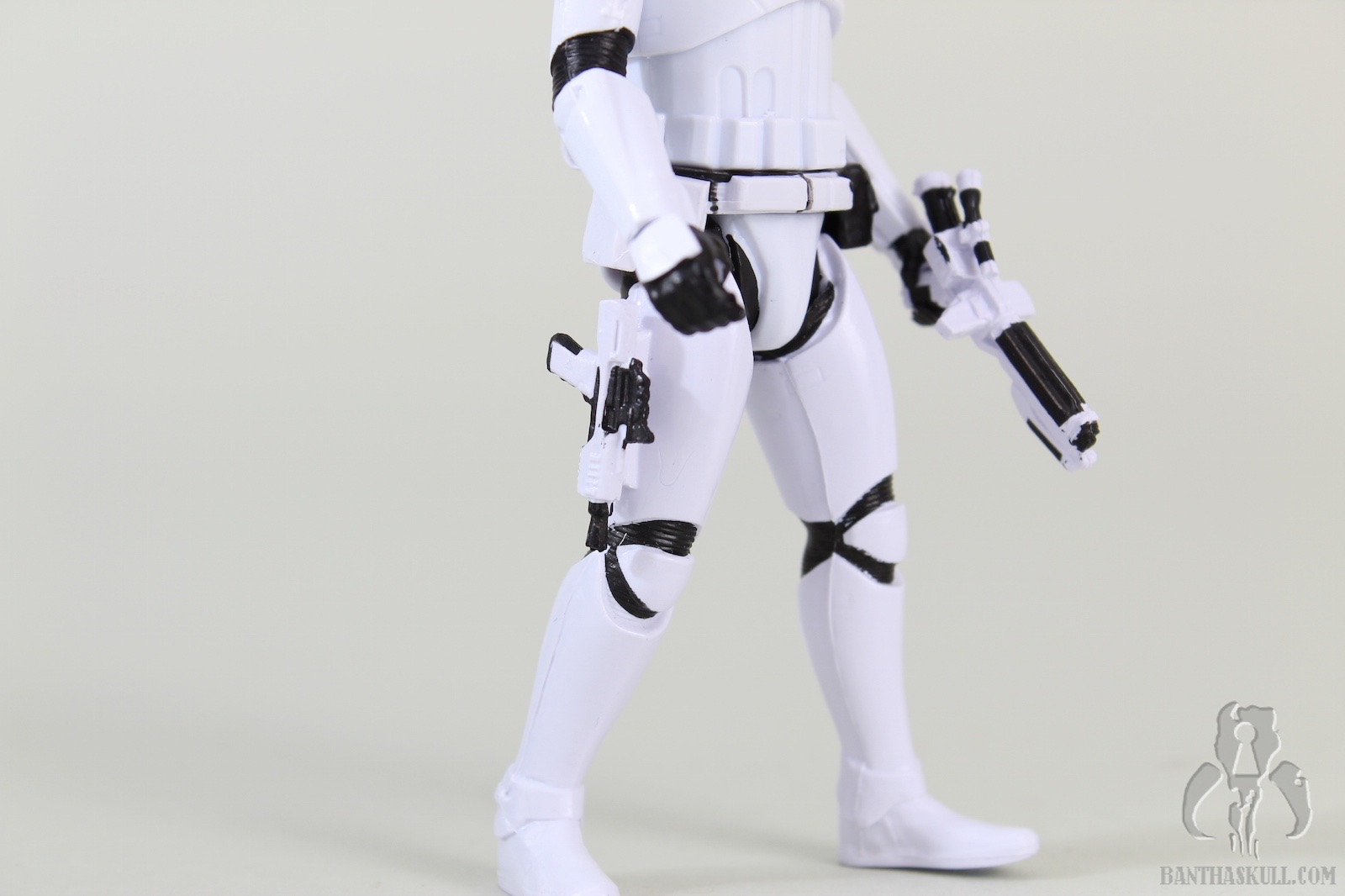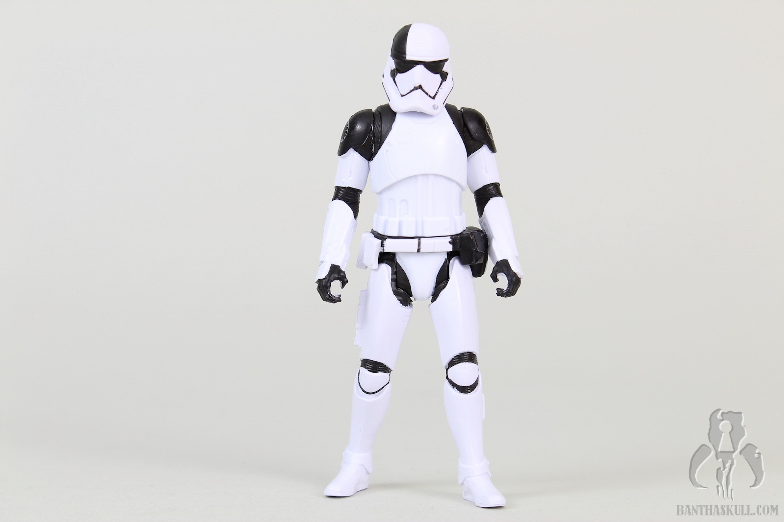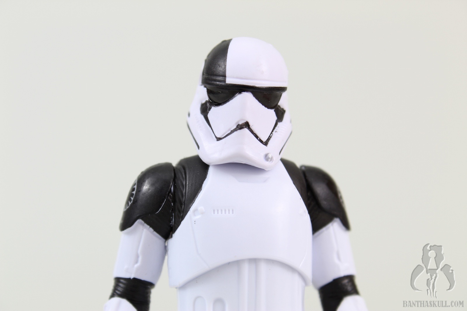 The Executioner Stormtrooper is a repaint of the TLJ First Order Stormtrooper. It has black markings on the shoulders and helmet, and First Order emblem tampos on each shoulder. The figure has the “holster” slot on the right thigh, which can accommodate either of the blasters that are included. The trooper’s grip on either gun is a little loose for my liking, which seems to be the case for this mold in general. The electro-staff is in two parts. The main part is the pole itself, with the “unlit” electro axe head. The second part is the “lit” axe head, with blue electric effect. It attaches to the side of the unlit axe head to complete the look. Like the blaster, the trooper’s grip on the staff is loose, and of course, a two-handed grip is impossible with a 5POA figure.