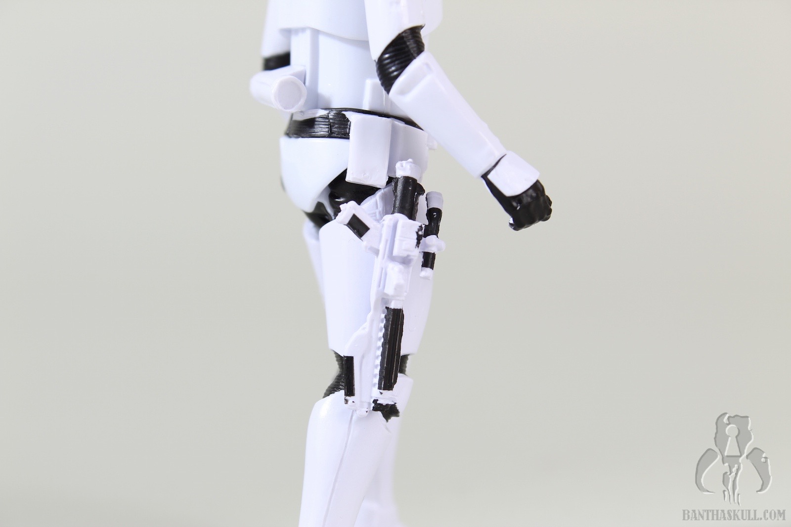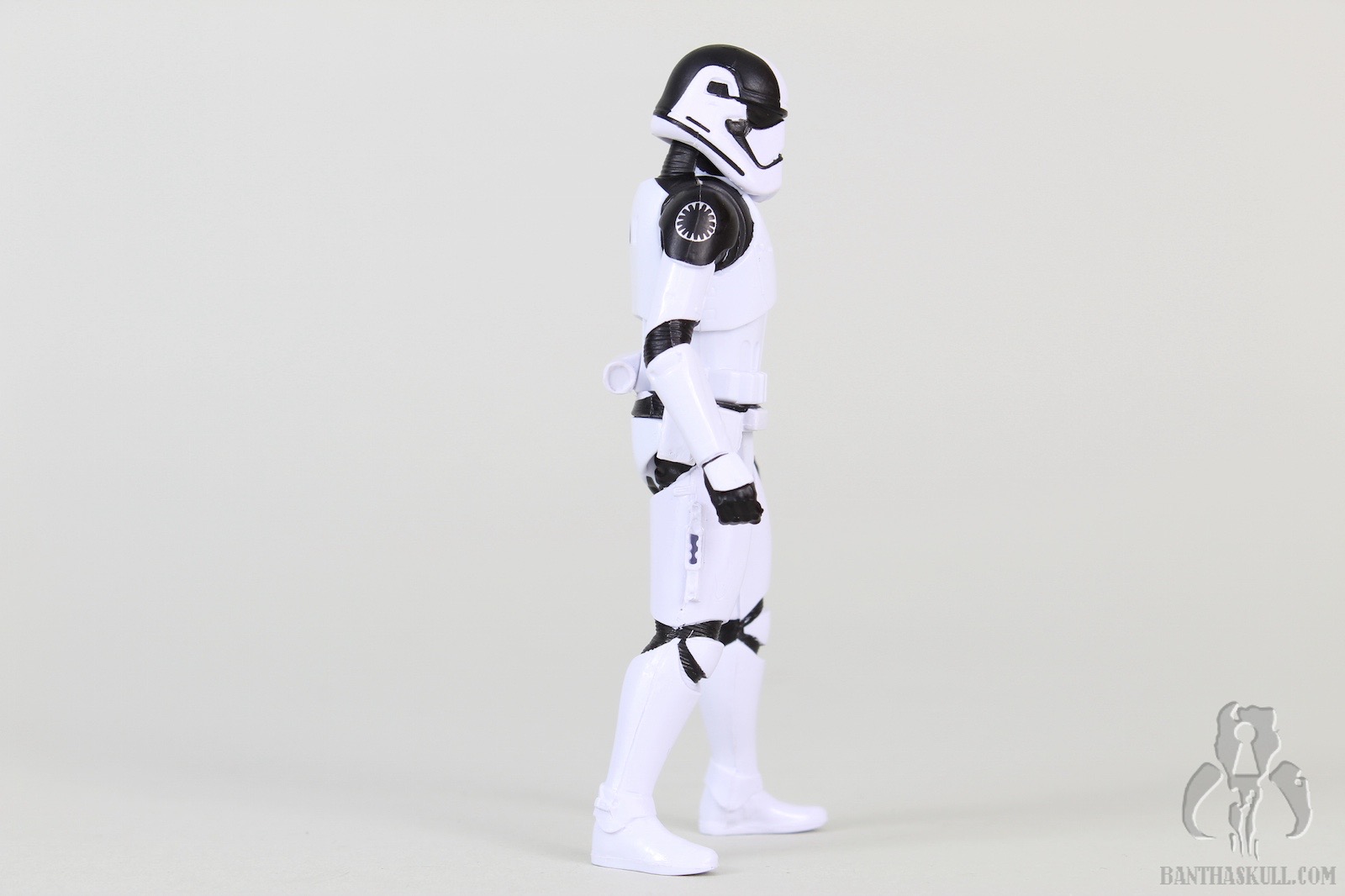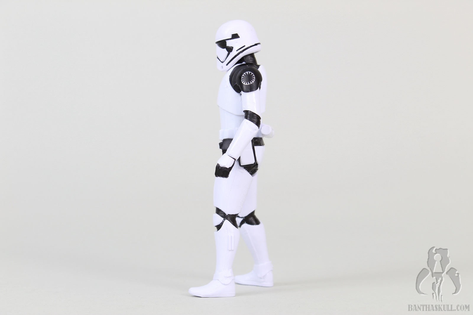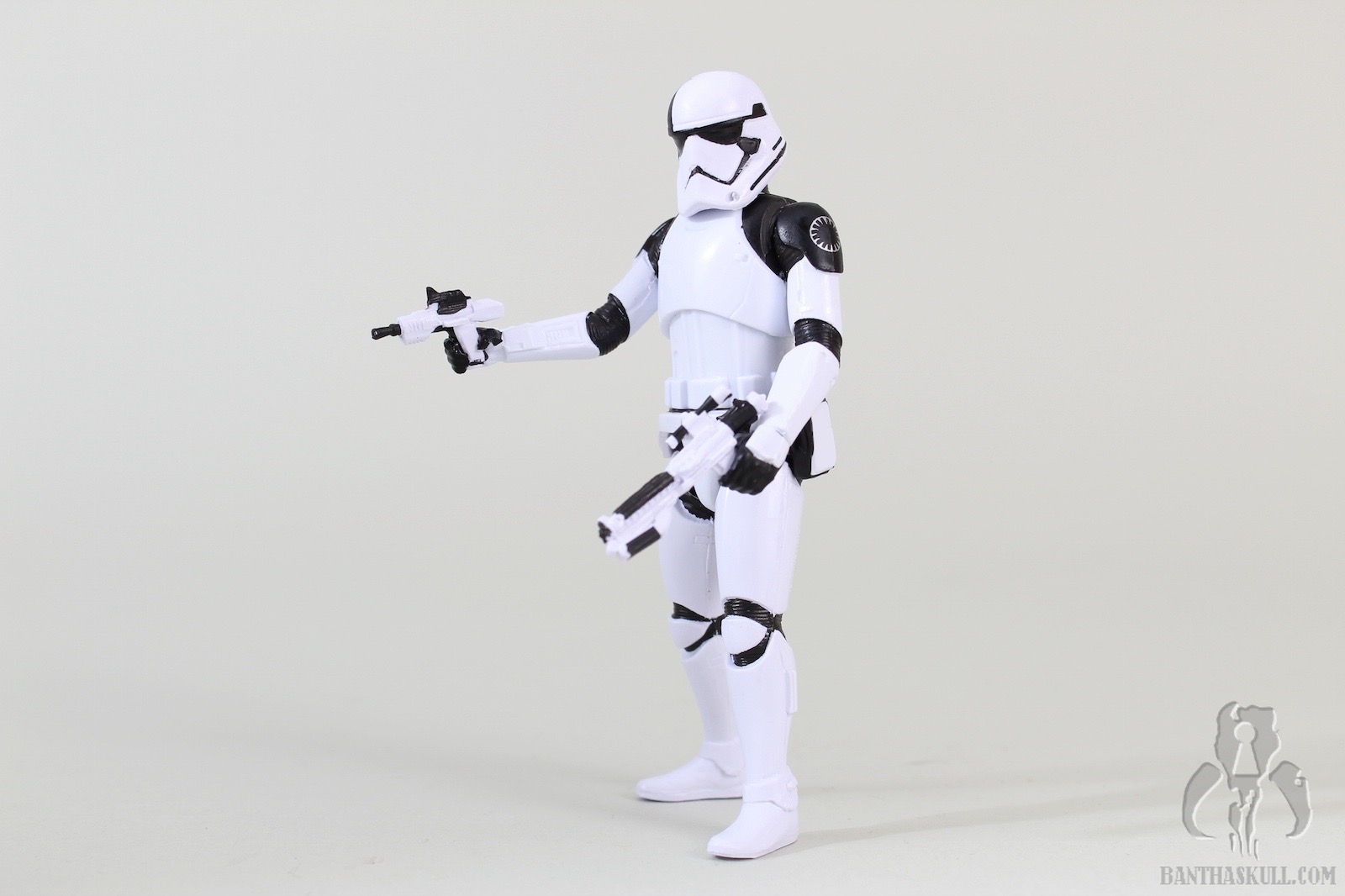 The Executioner Stormtrooper is a repaint of the TLJ First Order Stormtrooper. It has black markings on the shoulders and helmet, and First Order emblem tampos on each shoulder. The figure has the “holster” slot on the right thigh, which can accommodate either of the blasters that are included. The trooper’s grip on either gun is a little loose for my liking, which seems to be the case for this mold in general. The electro-staff is in two parts. The main part is the pole itself, with the “unlit” electro axe head. The second part is the “lit” axe head, with blue electric effect. It attaches to the side of the unlit axe head to complete the look. Like the blaster, the trooper’s grip on the staff is loose, and of course, a two-handed grip is impossible with a 5POA figure.
