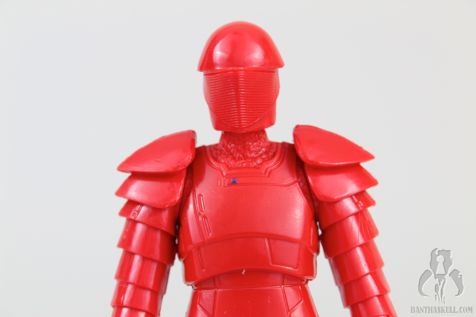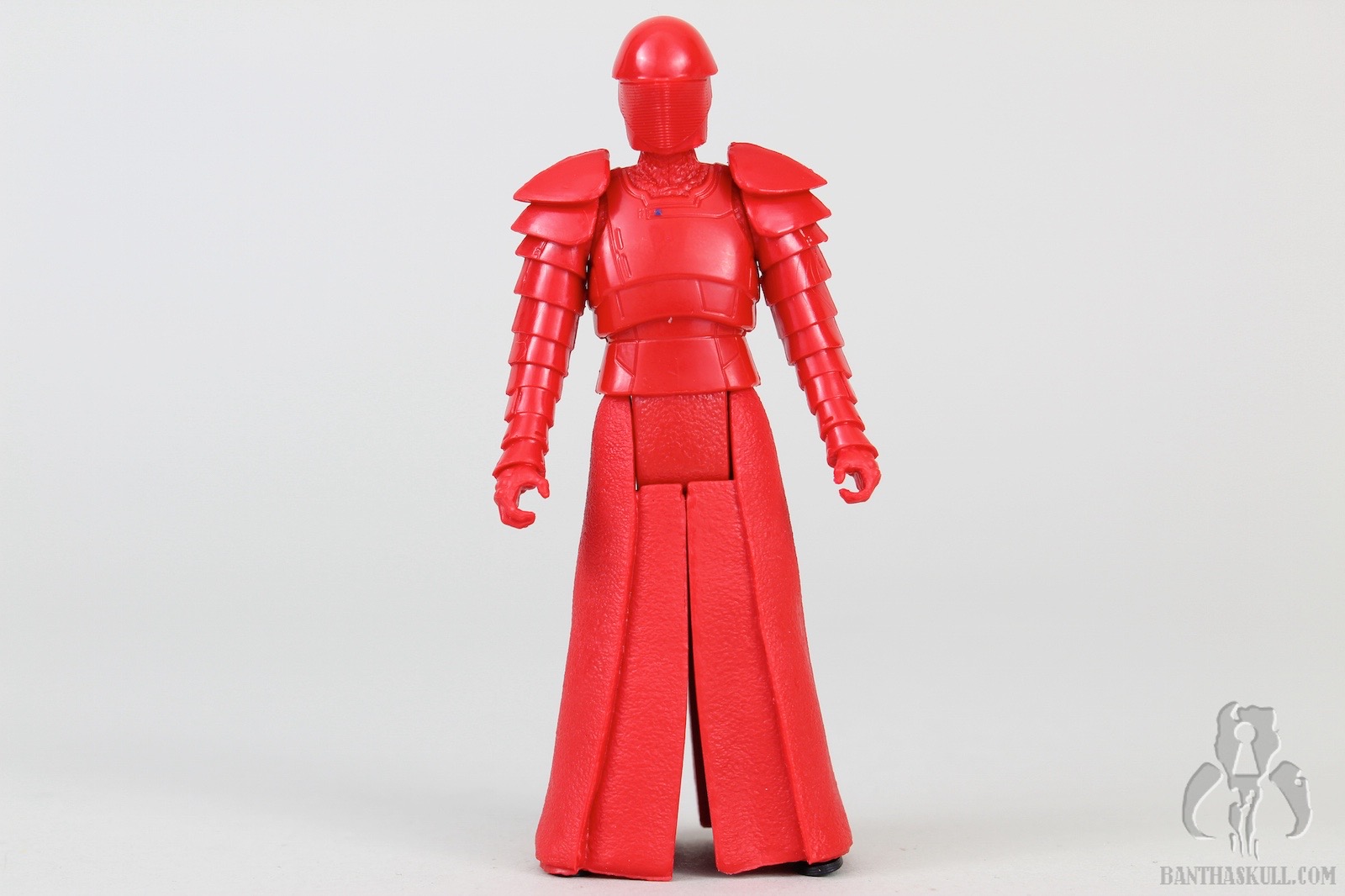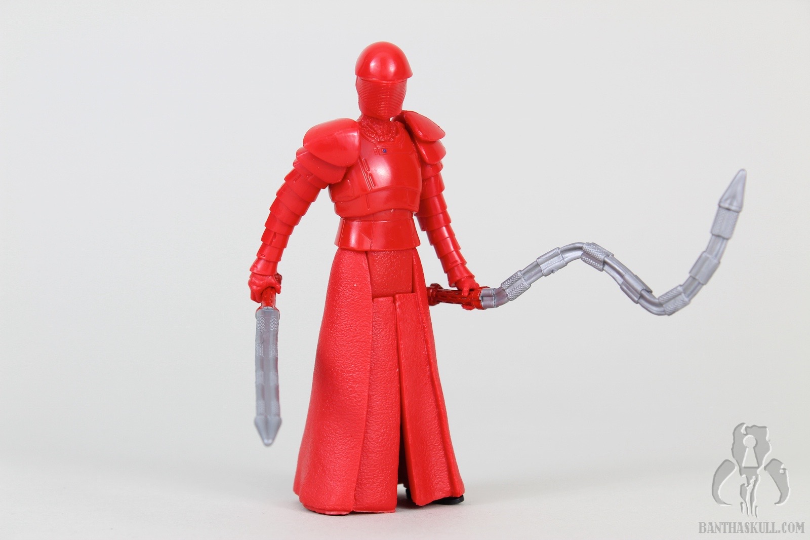 The Praetorian Guard has the same body sculpt as the previous versions (Rey 2 pack and BB-8 mega playset). The helmet is a new sculpt, and the figure comes with a new weapon. At first I thought it was two different weapons, but it seems that the “bendy” one is actually an activated whip mode of the straight sword. So you really have two different display options. Or, the figure can hold both, if you want. As far as we know at this point, there are 8 Praetorian Guards that provide security for Snoke. Some combination of the three helmet and weapon types seem to be spread out over the 8 characters, but maybe we’ll know more when we see the film.