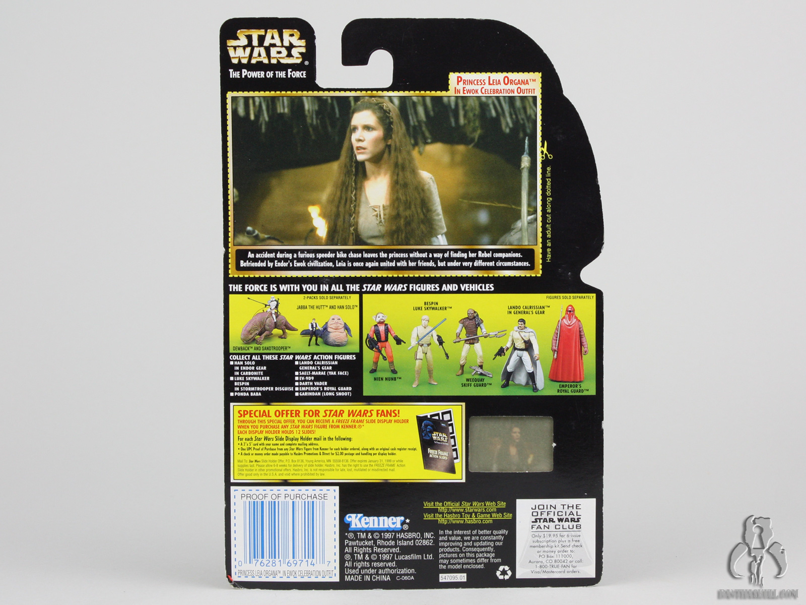 I have to channel Coach Rig for this review. Lets analyze what works about this figure. NOT A (expletive deleted) THING works about this figure. This figure doesn’t look like the adorable Ms. Fisher at all. It looks like it was based on her male stunt double in drag with lady of the night levels of makeup. Even by POTF2 scaling standards, the figure is gigantic. This may be so that the figure could interact with the equally gigantic POTF2 Ewok figures in a case of cascading fail. The figure only has the POTF2 standard six points of swivel articulation, which is the reason for the rather brief gallery. There’s only so much you can do with the figure. The feet are posed in some ridiculous ballerina’s stance, which you can’t change due to this lack of articulation. The predetermined stance makes the figure exceedingly difficult to stand unassisted. I remember being so excited that this never before made figure was coming in 1998, and then immediately becoming frustrated at how difficult it was to make it stand without toppling.