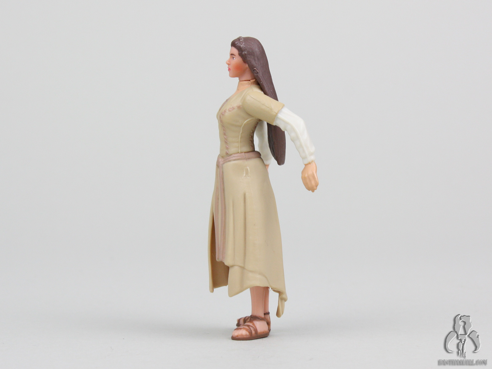 As was the rage in the late nineties, the accessory is a ridiculously large sporting blaster. It’s so big that it’s probably more accurate to call it a sporting carbine. The blaster can only be held in the figure’s right hand as the left hand is posed open palmed to pat an Ewok on the head. That right hand is rotated about 45 degrees. This means if you want to pose this Ewok Village Princess Leia figure in a fantasy situation where she starts wiping out the walking teddy bears, she’ll have to hold the blaster in a sideways “gansta” grip. Finally, Princess Leia’s long locks are a blob of brown plastic with virtually no detail or subtlety. It looks like someone dragged a fork across a hunk of brown clay and called it hair. I’d expect better from a student in a Parks & Rec summer sculpting program.