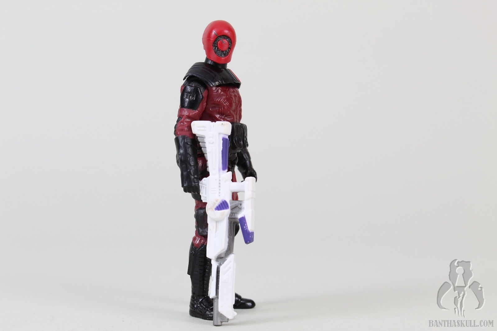 Regardless of my thoughts on the design, Hasbro did their job with a nice translation into this form. The sculpt is good, with lots of details to the uniform fabric and the wiring throughout. The paint is applied well, with a gloss that gives the clothing a bit of a plastic look that, to me, fits the purposes of the cybernetic uniform. The boots are extra shiny, because Guavians were known to obsessively polish their boots during their downtime. The arm and leg articulation isn’t hampered by the figure design, although the head isn’t as rangy as it should be. The figure holds his weapon a bit too loosely for my taste, and it’s a shame there is no holster. The figure comes with a build-a-weapon part, but this giant rifle throws the figure off balance when aimed straight, so the gallery image shows him holding it to his side.