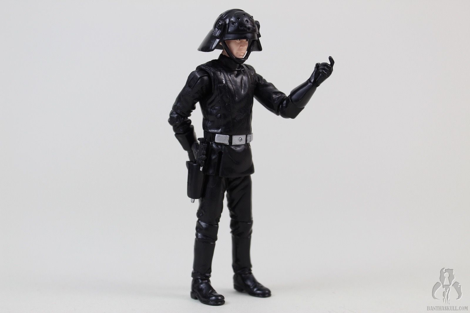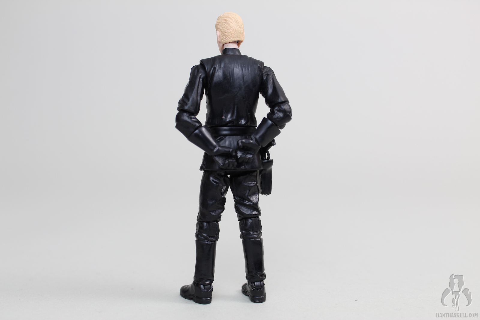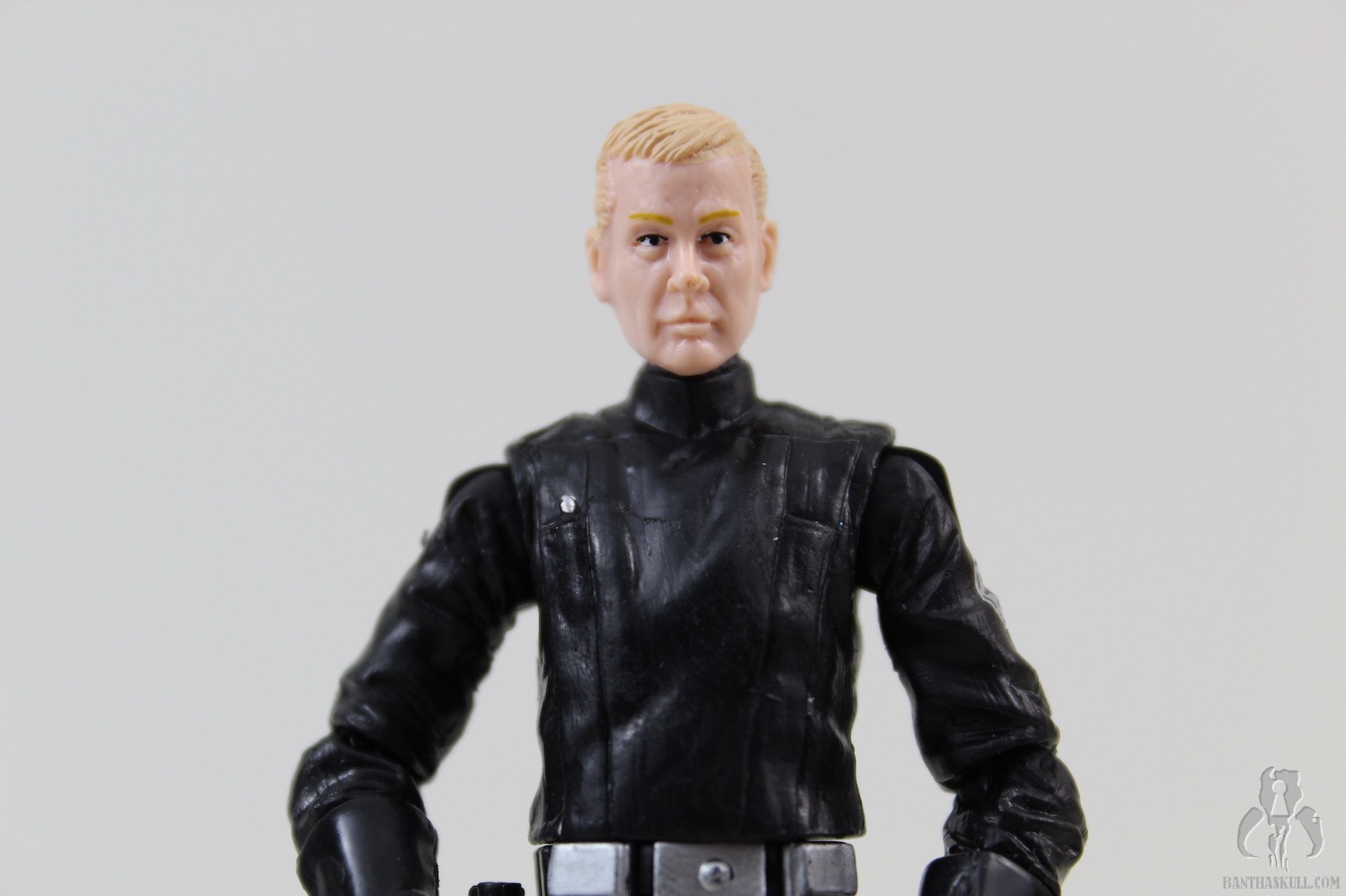 The few standout items? The face is outstanding, both in the physical sculpt and in the paint applications. I find that the likeness is reminiscent of a young Johnny Carson, or possibly Lance Armstrong. The paint on the figure itself is pretty simple, just a few details here and there on the all black uniform. One thing that should have been corrected is the Grand Army of the Republic emblem on his right shoulder. I’m not sure if Hasbro just didn’t care enough to fix it, or if making the change would have somehow blown the budget for a “repack”. That might also explain the missed opportunity to repaint the figure in gray, to give us a modern update to the Kenner Death Squad Commander. Some day, Hasbro, some day.