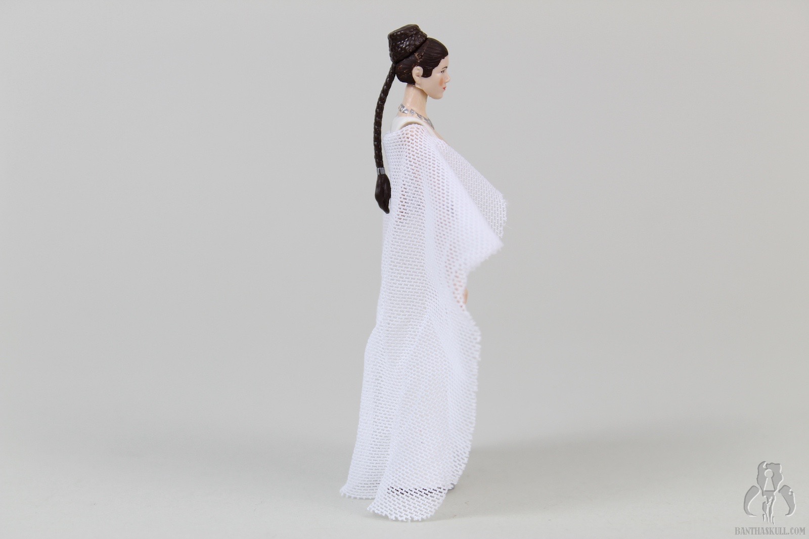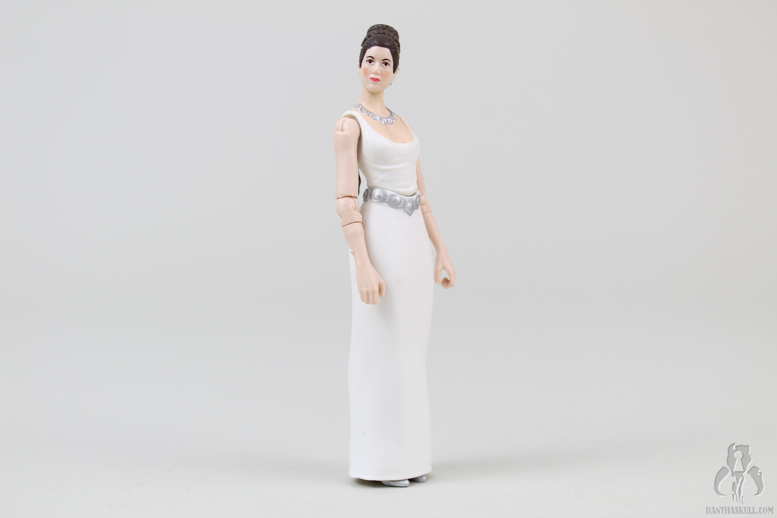 The figure sculpt is very good. It’s simple, but elegant. Leia is wearing the Yavin medal ceremony outfit (and it would have been great if Hasbro gave this figure a parenthetical identifier). The sleeveless gown is part of the sculpt. The upper body is super-articulated, with swivel elbows instead of wrists - a good aesthetic choice by Hasbro. There is no articulation below the waist, and this isn’t a bad thing. Leia’s gown reaches to her feet, which are separately sculpted, but do not move. This is all good, as far as I’m concerned. No need for wasted effort on hips and knees that would harm the appearance of the figure. You’re not going to pose this figure in any kind of action stance, anyway. As long as she can look nice standing and handing out medals, that’s all we ask.
