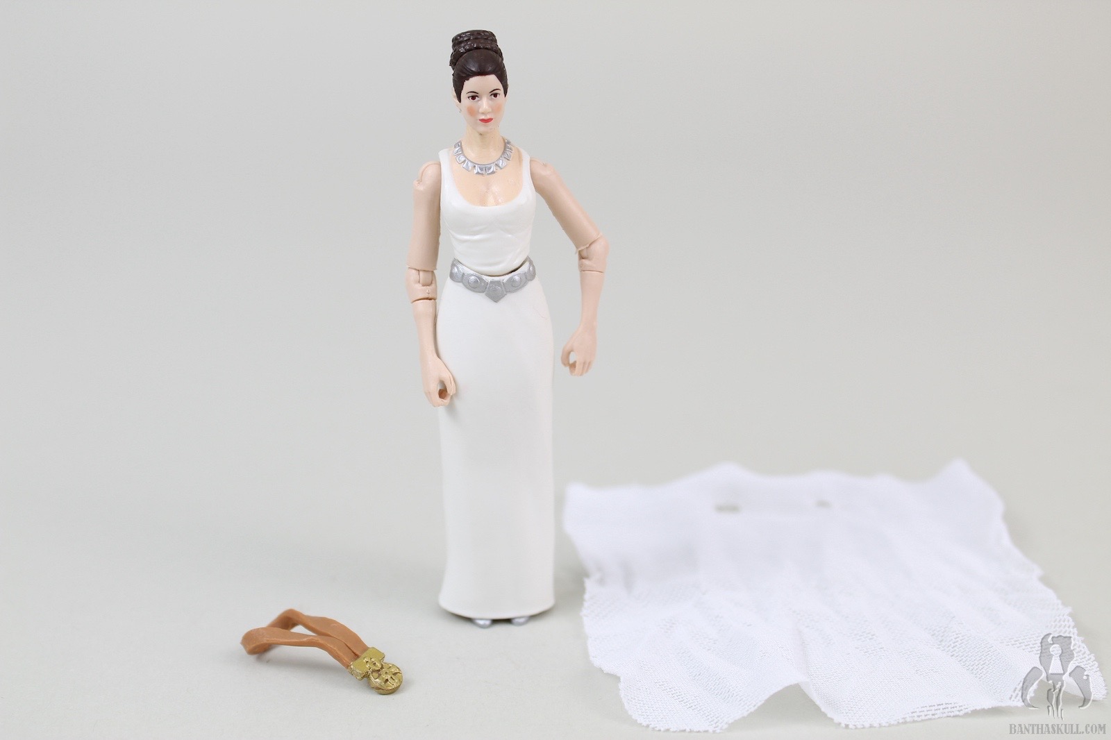 The figure comes with a medal, which she can hold as if she is presenting it. She also comes with a removable shawl. In reality, this is part of her gown, and doesn’t appear to be a separate piece in the film. But the soft goods nature makes it necessary be separate. In the packaging, the shawl is weirdly displayed “off the shoulder”, which isn’t how it is worn. With some manipulation, you can get it to fall in a way that more closely mimics the true appearance, but it is still off. Nevertheless, the choice of fabric for this was pretty decent, allowing for a few different display options, even if none of them are really perfect.
