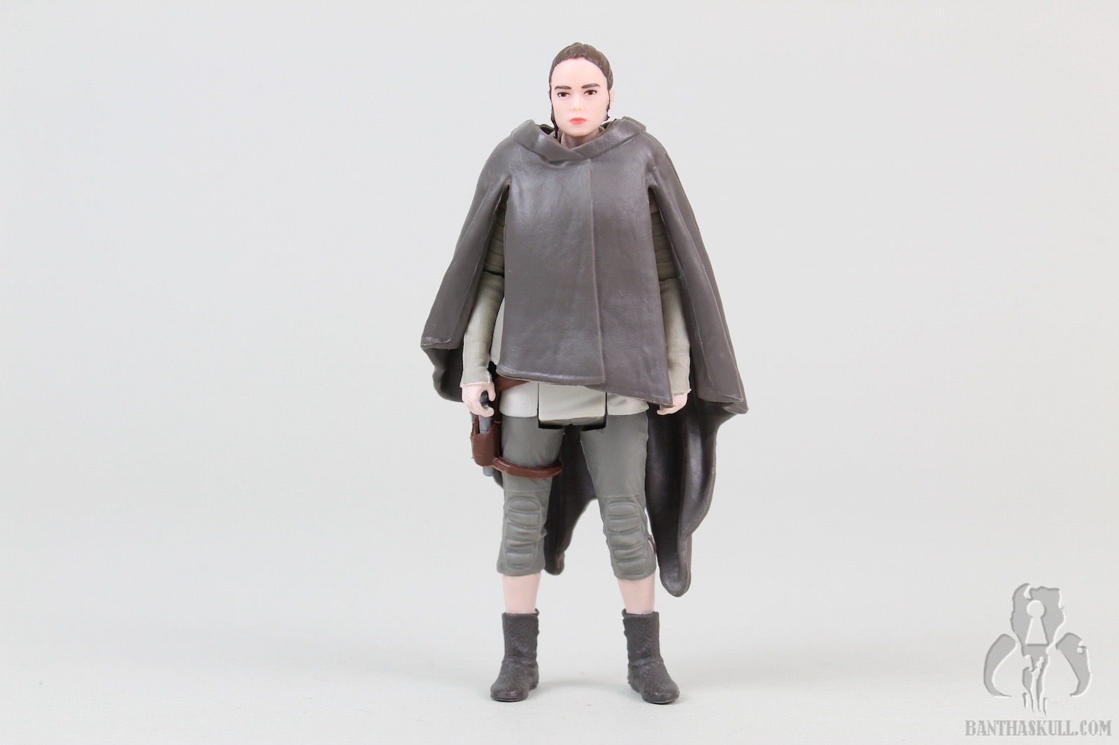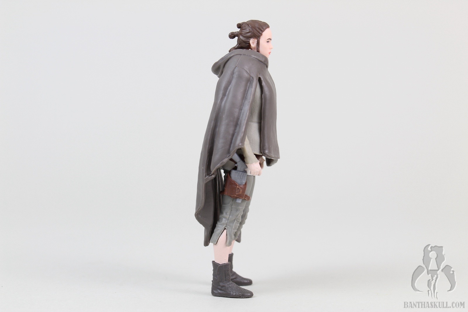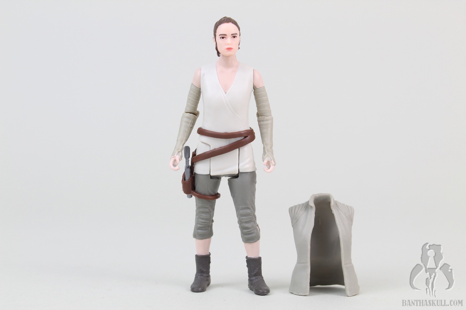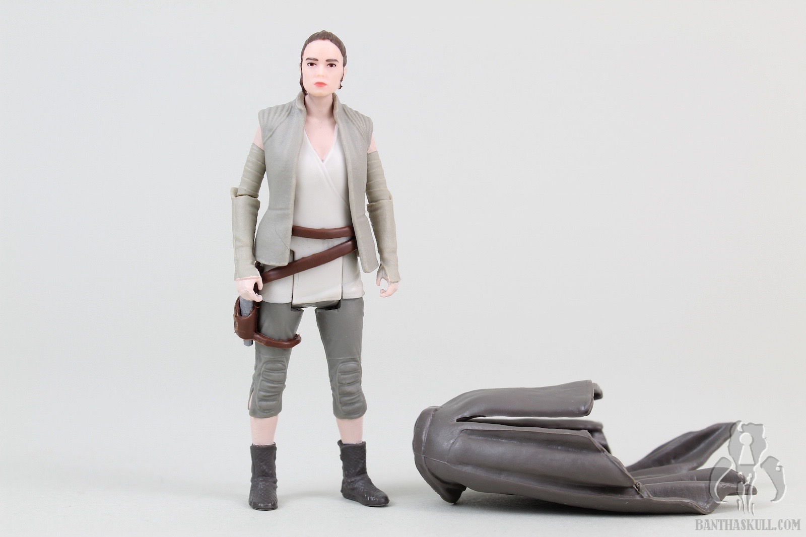 Fortunately, the poncho is removable, which brings us to the next layer. The Rey figure underneath the poncho looks, at first glance, to be very similar to the Rey (Resistance Outfit). However, even my defective color vision can see that this was painted much more appropriately. That’s not the only difference. There a few details that make this better. Rey’s calves and feet are actually a separate piece from where the capri pants end. This means it’s a much sharper paint line. The holster is a separate sculpt from the figure, as it was in the Resistance Outfit figure, but you’ll note that the entire belt/holster/thigh strap is a separate piece (actually it’s a couple of pieces). I made a weak effort to see if it would come off, but it appeared to be glued so I didn’t want to force it. It just looks much better, adding depth to the figure, and of course, avoids more opportunity for paint overspray.