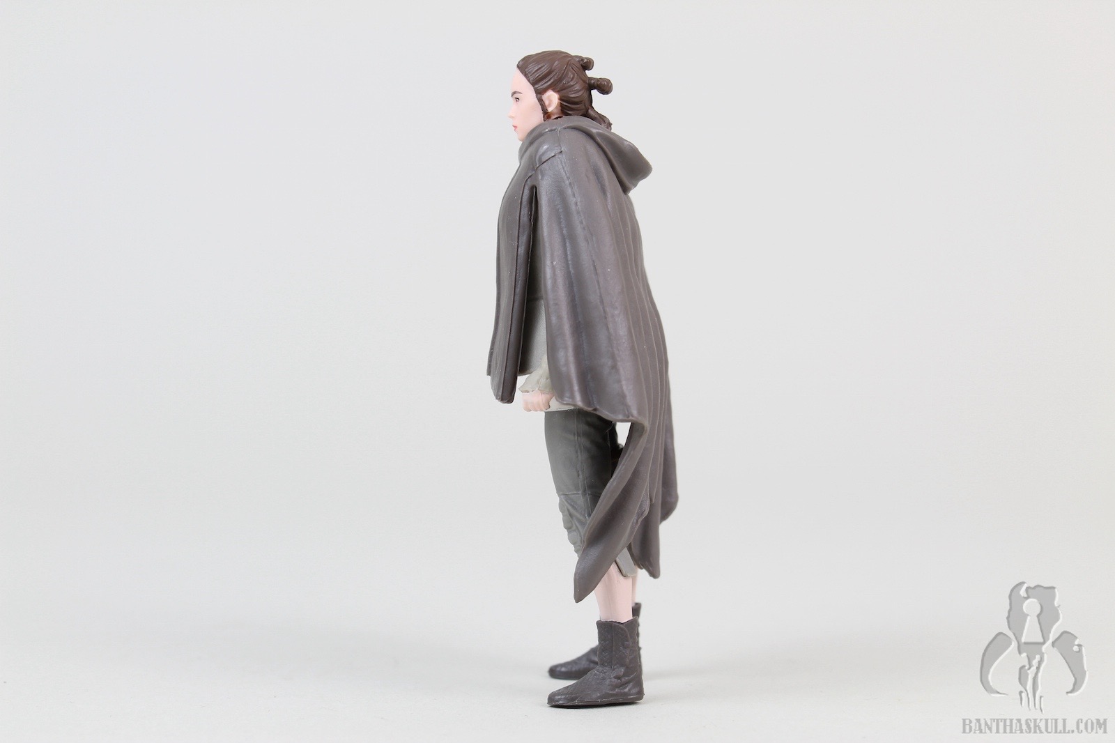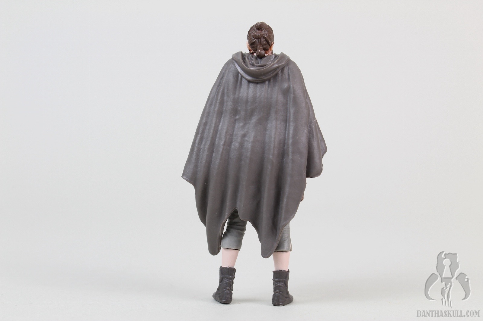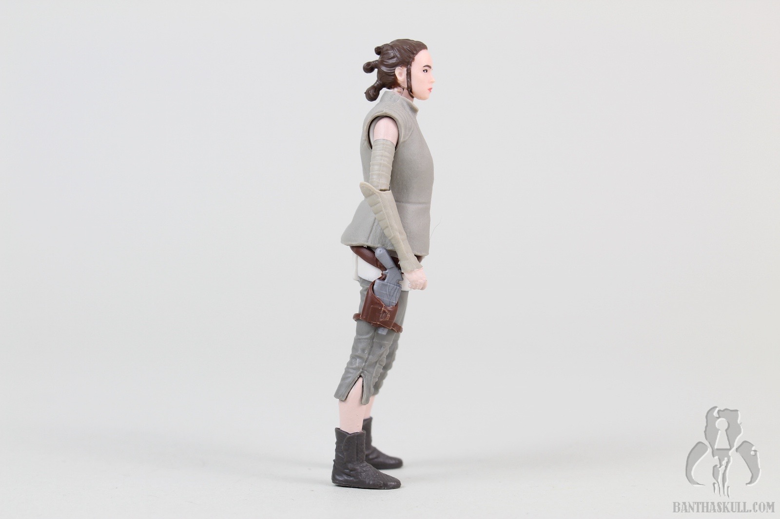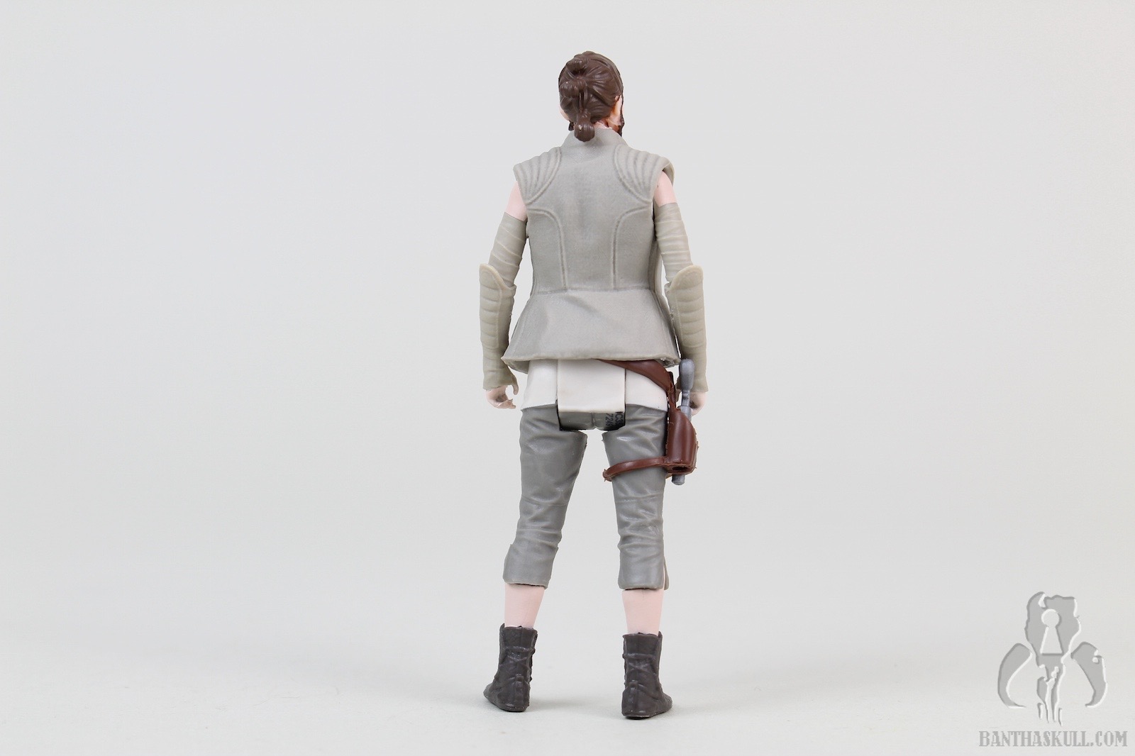 Fortunately, the poncho is removable, which brings us to the next layer. The Rey figure underneath the poncho looks, at first glance, to be very similar to the Rey (Resistance Outfit). However, even my defective color vision can see that this was painted much more appropriately. That’s not the only difference. There a few details that make this better. Rey’s calves and feet are actually a separate piece from where the capri pants end. This means it’s a much sharper paint line. The holster is a separate sculpt from the figure, as it was in the Resistance Outfit figure, but you’ll note that the entire belt/holster/thigh strap is a separate piece (actually it’s a couple of pieces). I made a weak effort to see if it would come off, but it appeared to be glued so I didn’t want to force it. It just looks much better, adding depth to the figure, and of course, avoids more opportunity for paint overspray.