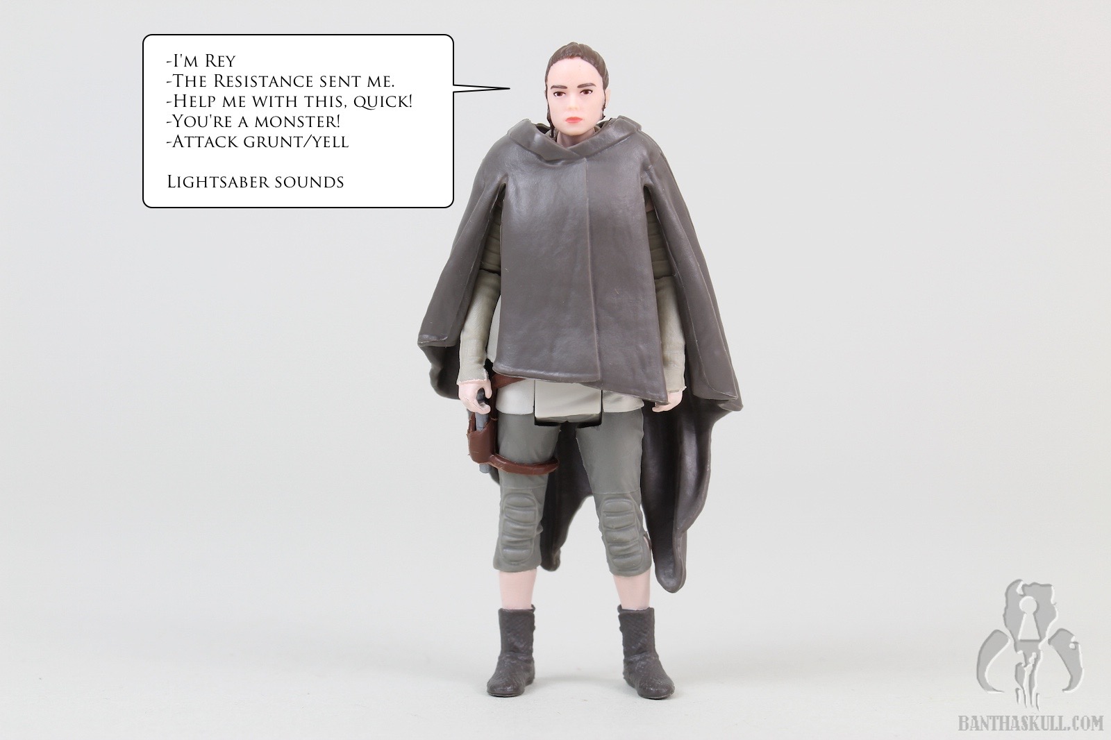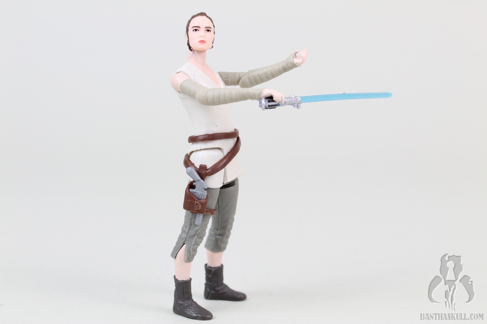 Rey comes with a blaster that fits nicely in the holster. One complaint is that Rey’s hands aren’t sculpted well enough to have a tight grip on either the pistol or the lightsaber. That, and the badly sculpted poncho are the worst parts of the figure.