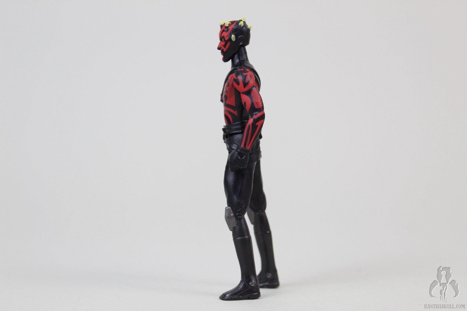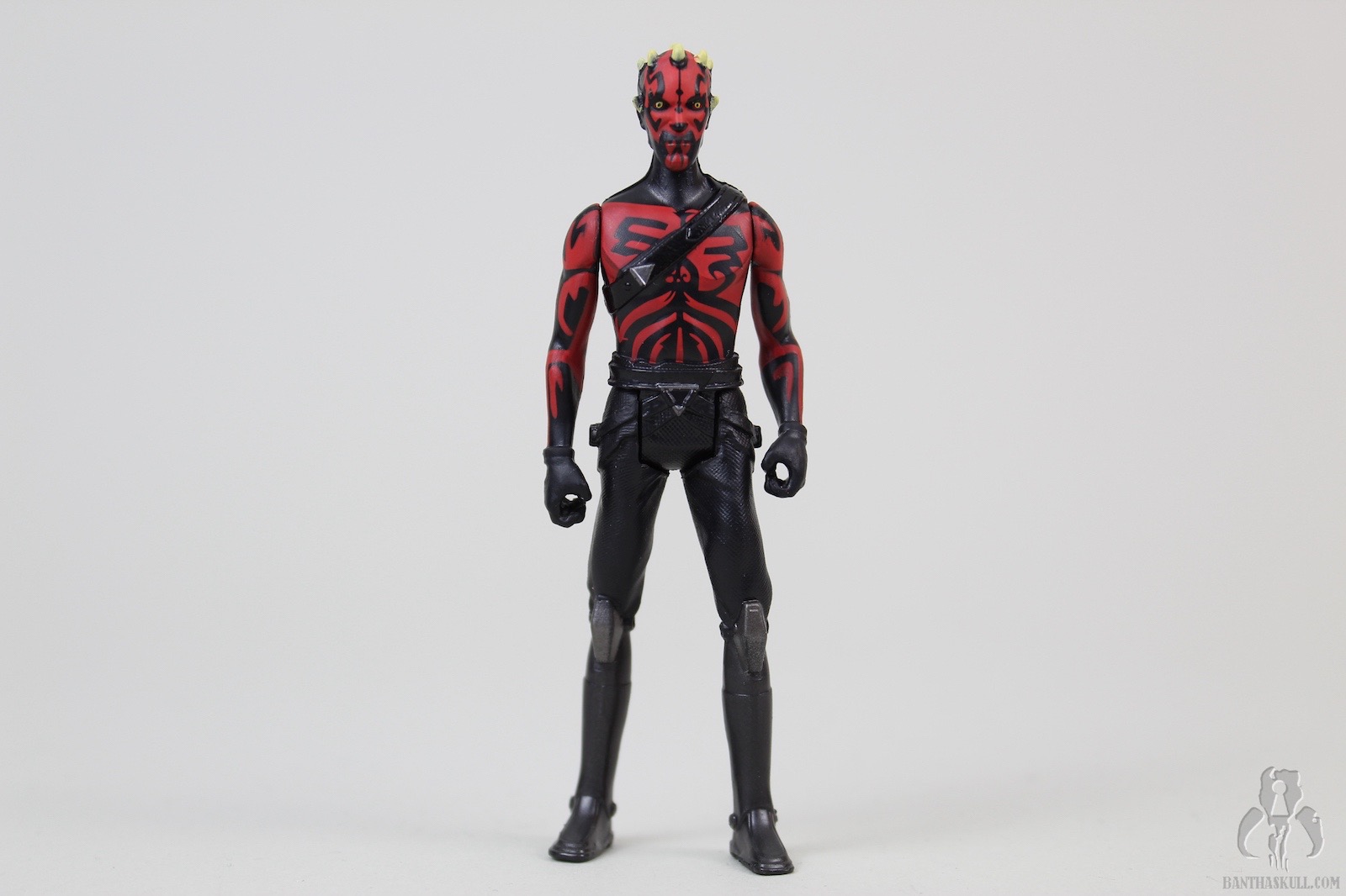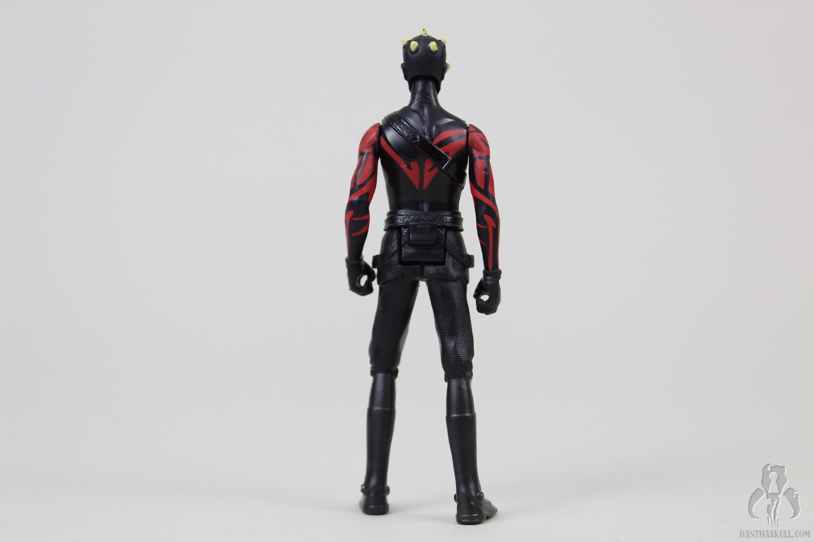 So back to the figures themselves. Darth Maul is a good (cartoony) sculpt. There is some nice detailing here, with a bit of texture to the pants which is usually lacking in the Rebels figures. The paint is pretty sharp throughout, with striking tattoos around Maul’s body. The face sculpt is good, but the paint here leaves a little to be desired, especially the eyes. They’re a bit too bugged out for my tastes. Otherwise, it’s an excellent looking figure all around. It stands solidly, although leans forward a bit. Articulation is standard 5POA, and as usual, the ball jointed neck somehow doesn’t do much more than a swivel joint. Maul comes with two accessories. He has a lit double-bladed light saber. Typical of the line, the blades are not removable, which would have been a nice feature. Although Maul does grip the hilt tightly, he holds it very close to his body, so unless his arm is fully extended (with the blades pointing straight up and down) the blades are actually touching his own body in most cases, which, of course, is just weird. Maul also comes with a removable cowl, which fits over his head pretty snugly, and gives a nice alternate display option. Overall, it’s a solid offering for the line, and if it was packaged alone, I’d probably give it a 5, if just for the sculpt and paint. One drawback (which would not be relevant if Maul were a basic carded figure) is the overly huge and asymmetrical double-barreled backpack right-handed missile launcher. In fact, its asymmetry is enough to make it impossible for Maul to stand (at least my sample couldn’t). I photographed him in his natural state, having fallen over to his side in an attempt to carry the thing. Weak sauce.