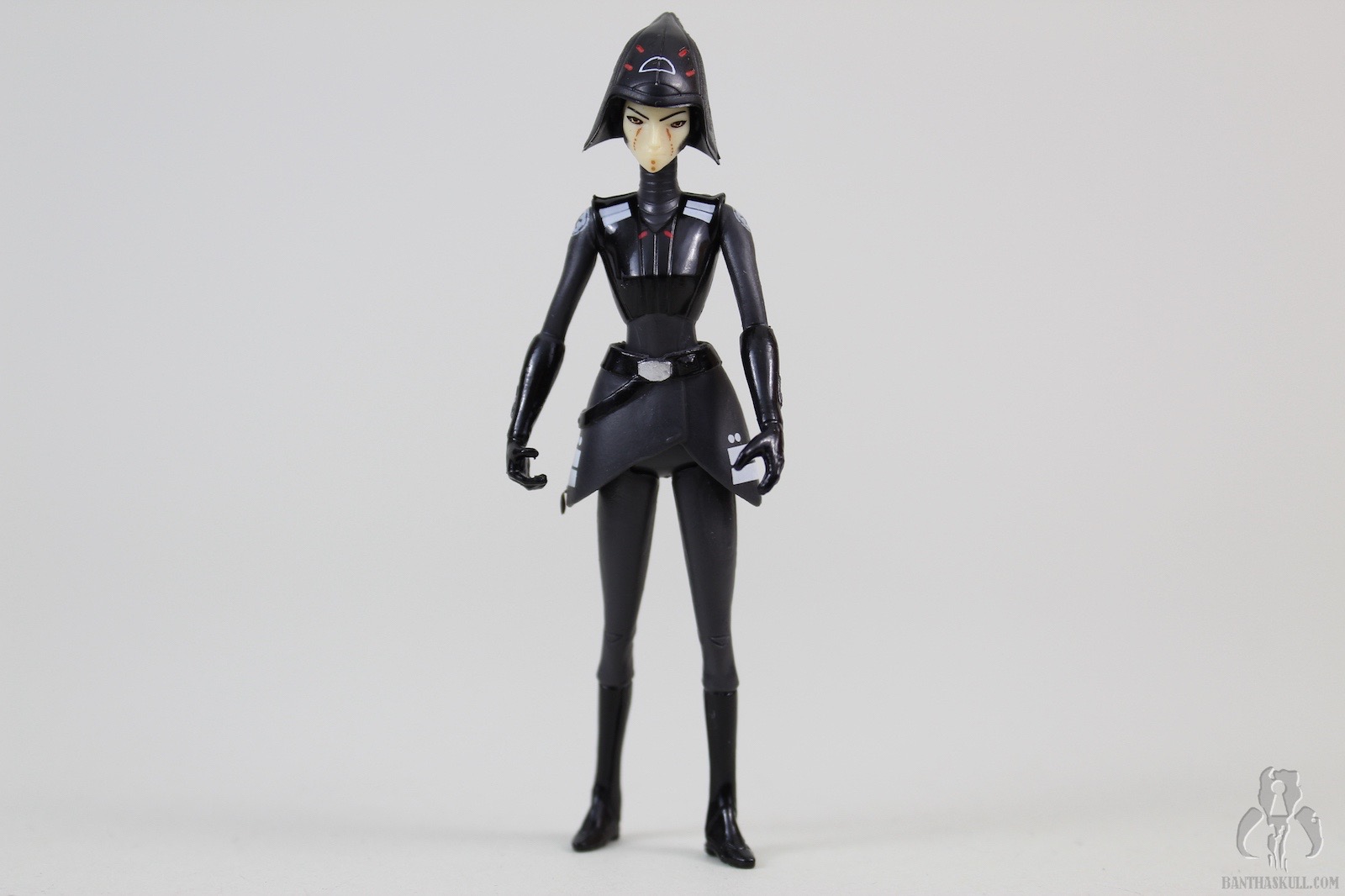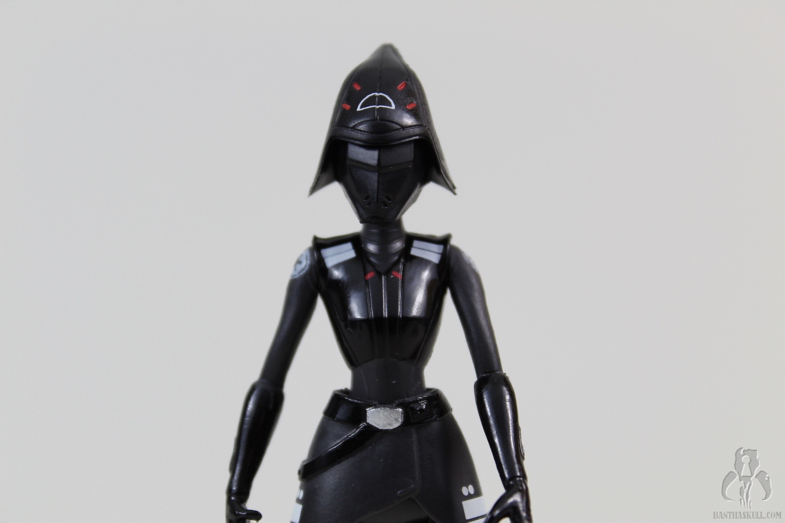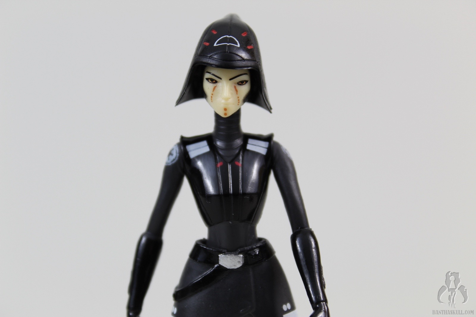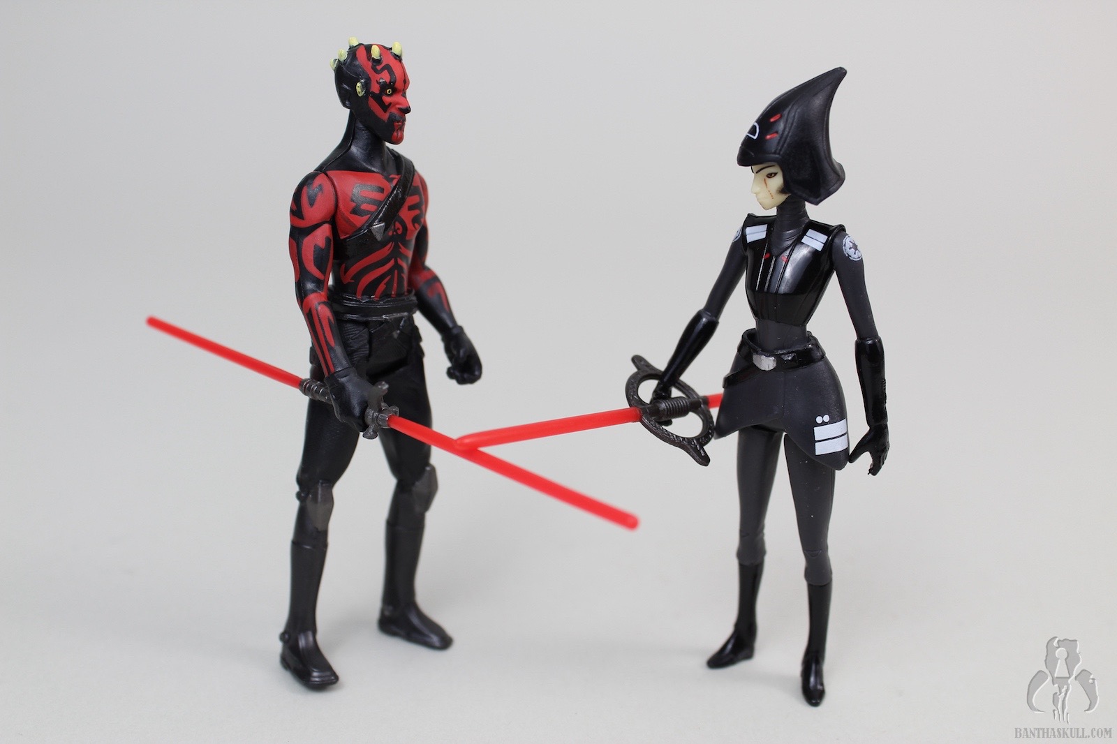 As for Seventh Sister (who’s real name is Bertha**), again, it looks neat coming out of the package. However, disappointment number one is that the figure is barely able to stand. It was with great effort that I was able to complete this gallery without committing a heinous illegal act against the first innocent bystander I encountered after stepping outside for a breather. While the poor balance of a figure is often enough to ruin my day and force me to give a grade of 0/10, it actually does get worse. But before we go to that, I’ll mention that it’s a good looking sculpt, and the paint, while simple, is well done, especially on the face, which is true to the on-screen look. While the figure is definitely too dainty, I understand this is a good representation of the source media. But if Hasbro is going to make a figure with legs and arms that are as thin as toothpicks, at least they could manufacture them out of a material that doesn’t have a measurable viscosity. This is one of the most gummy-bearish figures I’ve ever seen, and my sample had crappy joints as well. So it was hard to move the arms and legs at the joints because the limbs were so soft, that moving them simply resulted them bending in place, rather than swiveling at the articulation point. If that wasn’t enough to kill the figure, how about the fact the hands are sculpted in such a way that they don’t grip the lightsaber. I mean, getting those 2 photos with her holding the weapon was a feat worthy of recognition in the archives of the Jedi Order. I think I snapped the pics just an instant before the hilt fell to the table. Just like the (Grand) Inquisitor’s blade, Bertha’s hilt does not have any kind of spinning feature, which, although kinda stupid, is still important. Neither blade is removable.