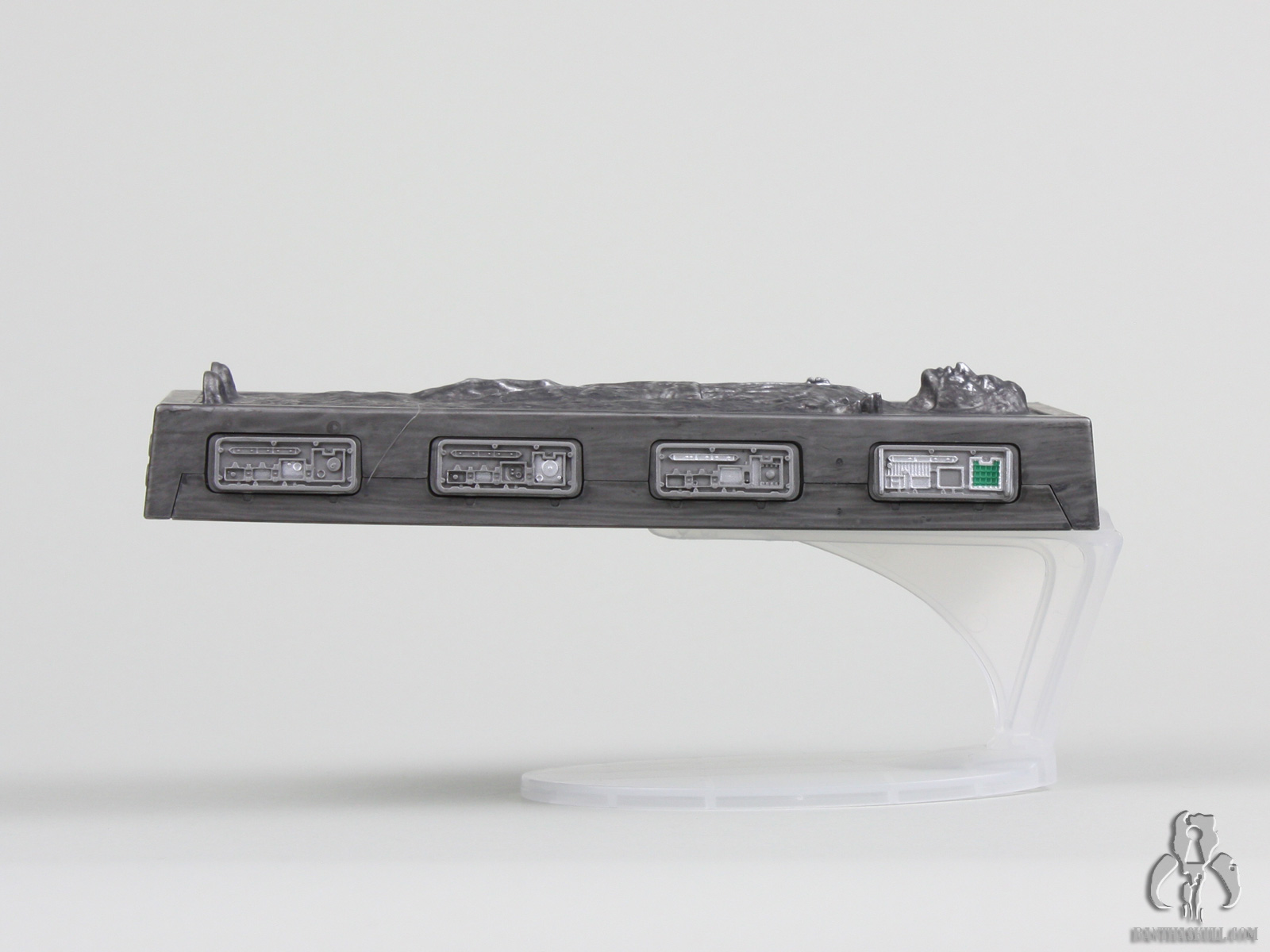 What is unfortunate is that the Han Solo in Carbonite block is exclusive to this set. It seem too important of a piece to be relegated to a short supply convention exclusive. Hasbro has hinted that they may revoke that exclusivity at some point, and lets hope they do (and not as a gimmicky thawing block). As if adding insult to injury, the 2013 SDCC Carbonite block is designed to interact with the 2014 SDCC Jabba’s Throne Room exclusive, a set we thankfully secured via Hasbro Toy Shop. The block itself is nicely sculpted and silver highlights bring out the depth. The controls embedded in the side of the block are sculpted with nice detail, but they really could use additional paint applications for the various flashing panel lights. The included stand is what takes the Carbonite block from just a hallow hunk of plastic to a display piece that can interact with the figures. It can be configured to stand the block upright or simulate hovering. That alone would compel me to track this set down.