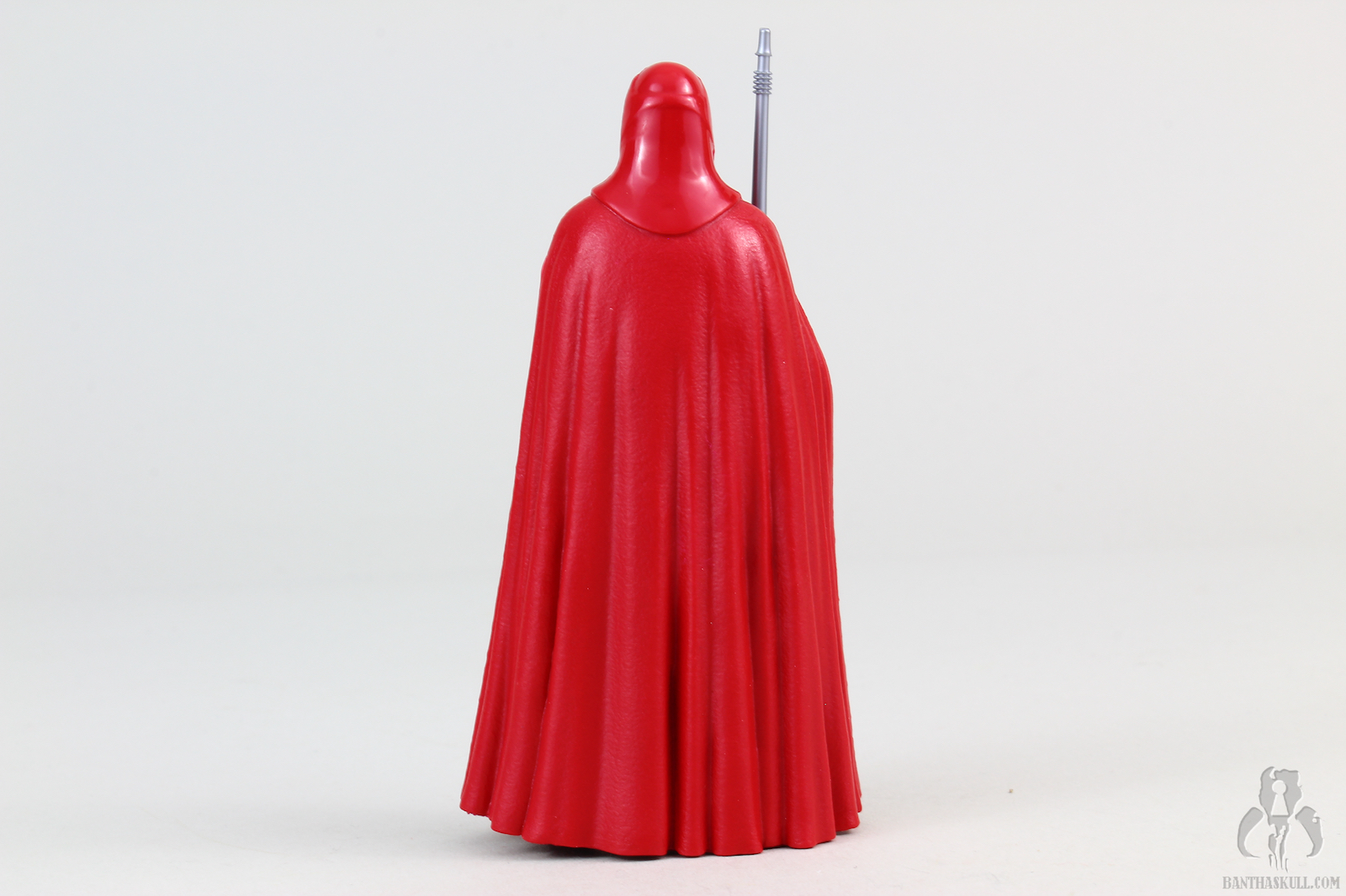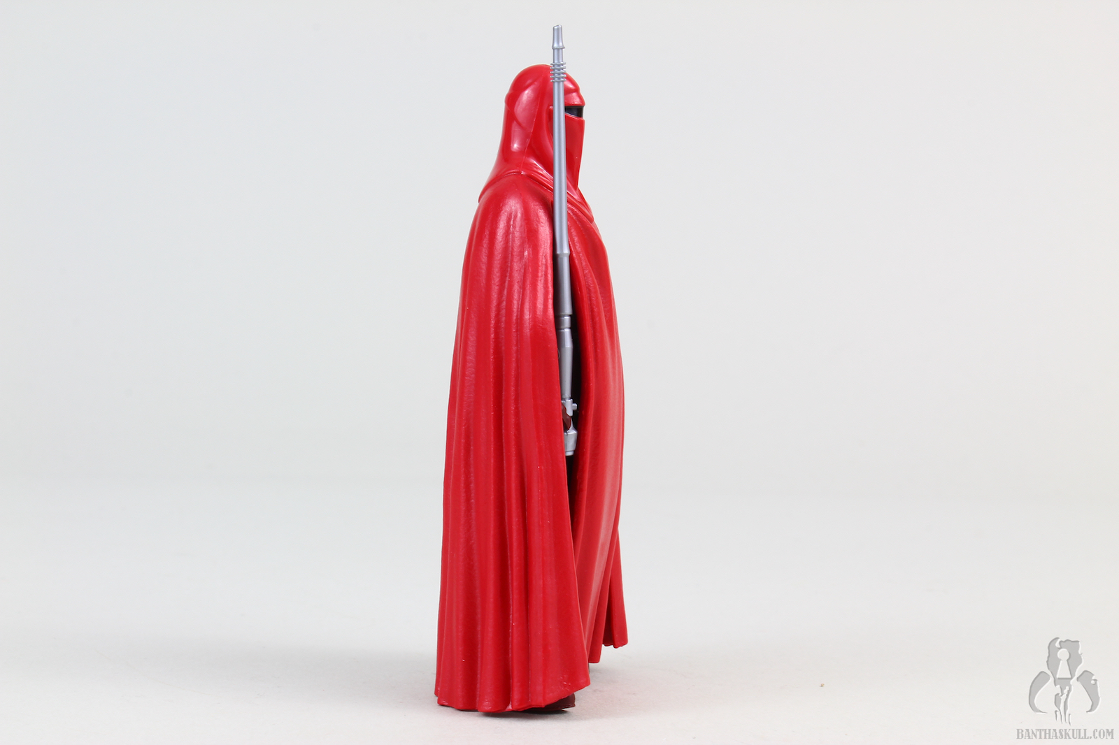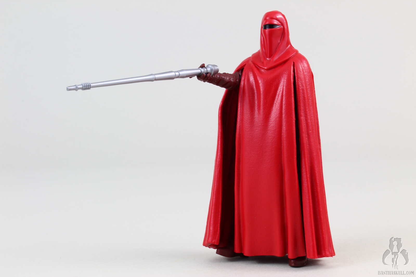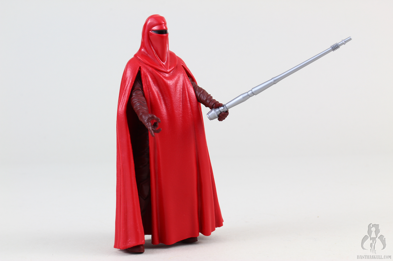 The plastic robes harken back to earlier incarnations of the EMPEROR’S Royal Guard. But it looks WAY better than any of them. The question is, does it look better than the TVC or TBS version? In my opinion, it’s not even a fair comparison. What the TVC/TBS version sacrifices (in a very limited way) is that it doesn’t quite look perfect when posed in the “just standing there” guard position. The hand holding the staff is a bit awkward, and it’s tricky to get the staff to rest on the shoulder perfectly. The robes might be slightly billowy. This 5POA figure pretty much nails the pose. BUT, if you want any semblance of posability or playability, this figure totally sucks. The TVC/TBS version not only can be posed in no less than 116 scientifically verified positions, it also has accessories that allow it to be displayed in any number of configurations.