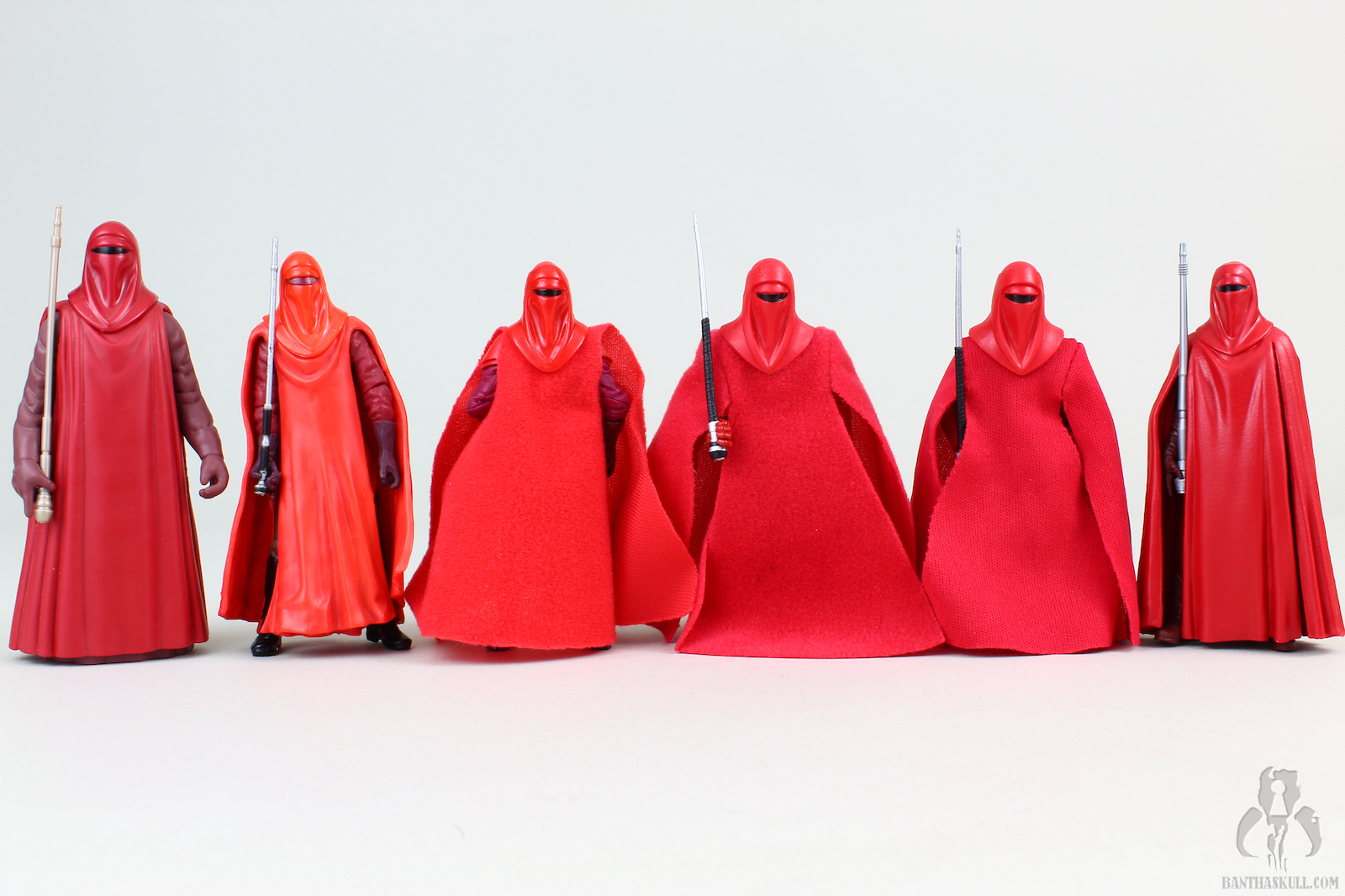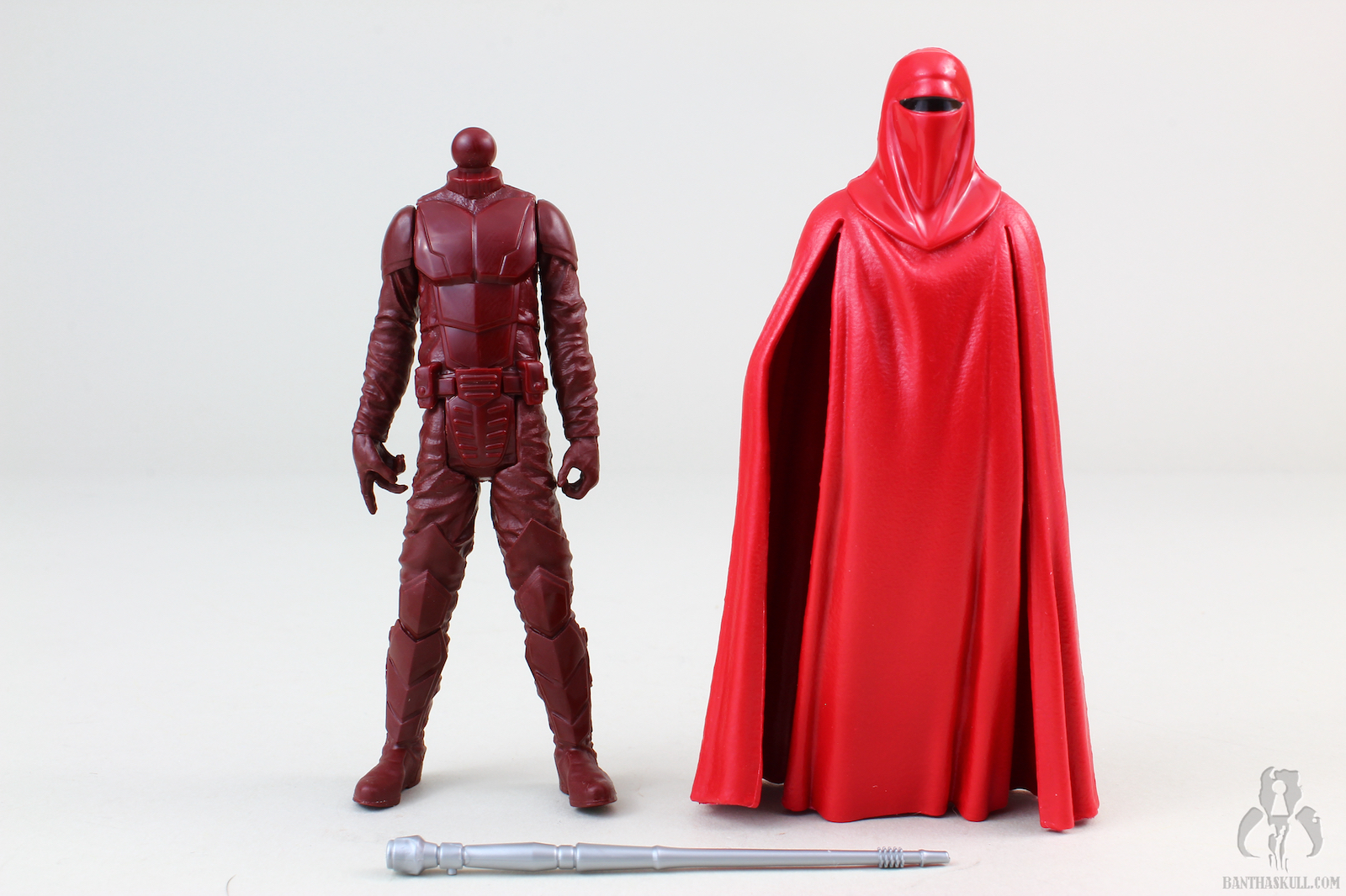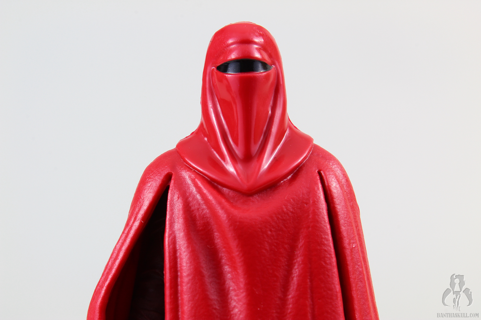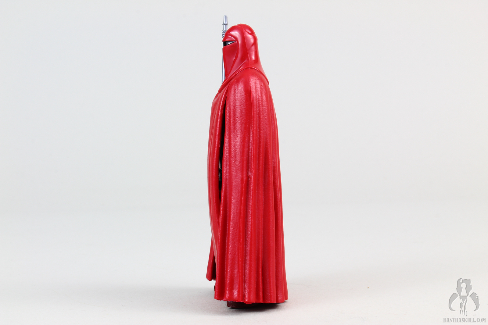 The plastic robes harken back to earlier incarnations of the EMPEROR’S Royal Guard. But it looks WAY better than any of them. The question is, does it look better than the TVC or TBS version? In my opinion, it’s not even a fair comparison. What the TVC/TBS version sacrifices (in a very limited way) is that it doesn’t quite look perfect when posed in the “just standing there” guard position. The hand holding the staff is a bit awkward, and it’s tricky to get the staff to rest on the shoulder perfectly. The robes might be slightly billowy. This 5POA figure pretty much nails the pose. BUT, if you want any semblance of posability or playability, this figure totally sucks. The TVC/TBS version not only can be posed in no less than 116 scientifically verified positions, it also has accessories that allow it to be displayed in any number of configurations.