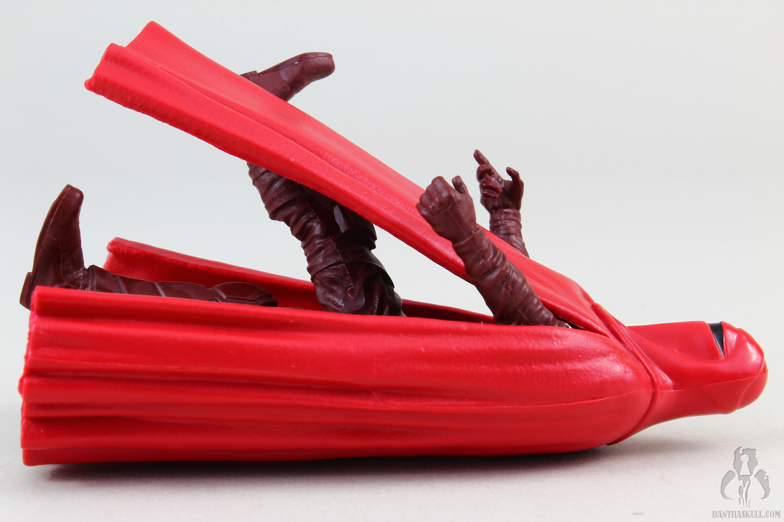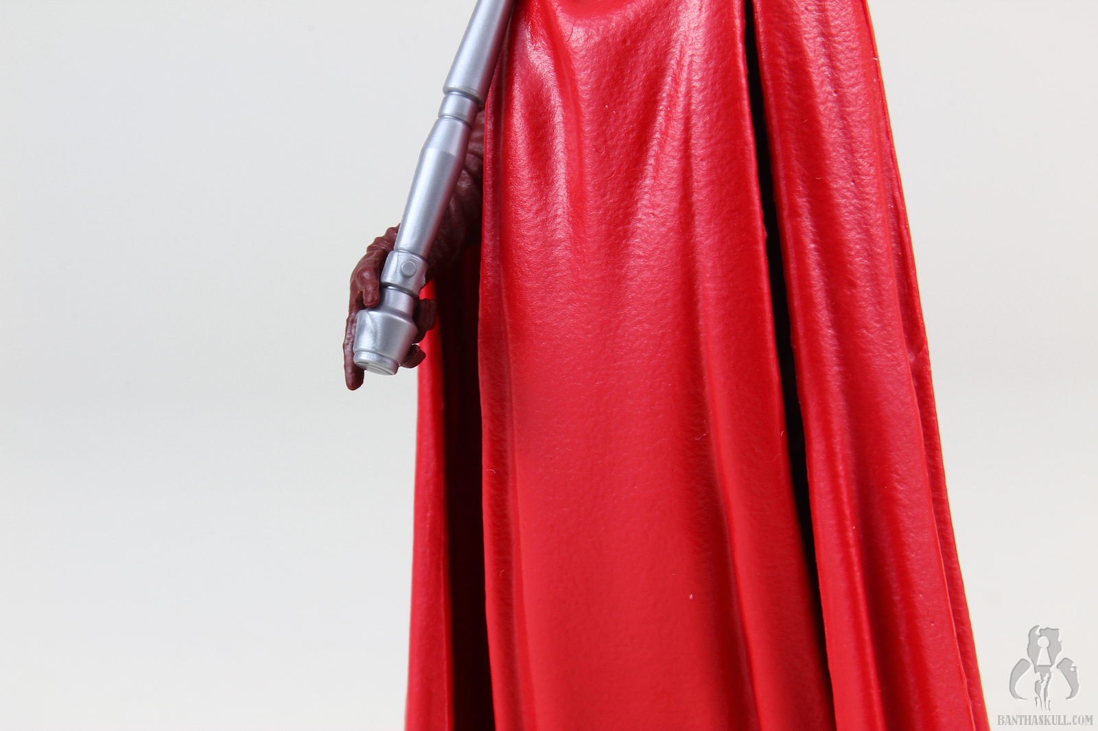 Well, here we have a ‘tweener figure. It’s not terrible, but it’s not great. It may actually offer something worthwhile to some collectors, while making other collectors angry that it even exists in the first place. This figure isn’t even truly 5POA. It has only 4 meaningful points of articulation (shoulders and hips). The head is removable, and is sculpted as a single large piece with the robes. As such, it can’t really move. The right hand is sculpted in such a way as to hold the staff rather well at a position of rest on the shoulder, just like as seen in Return of the Jedi. Which brings me to the point of why this may be good for some collectors. The figure for all intents and purposes, is little more than a statue. But it does look great doing what it did on screen, which is just to stand there and be red.