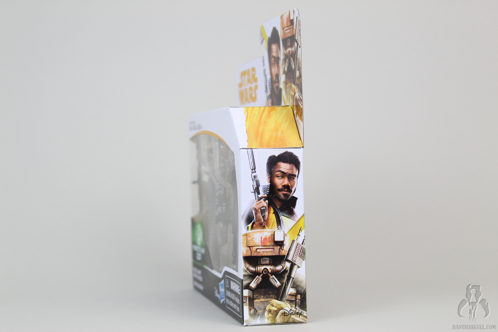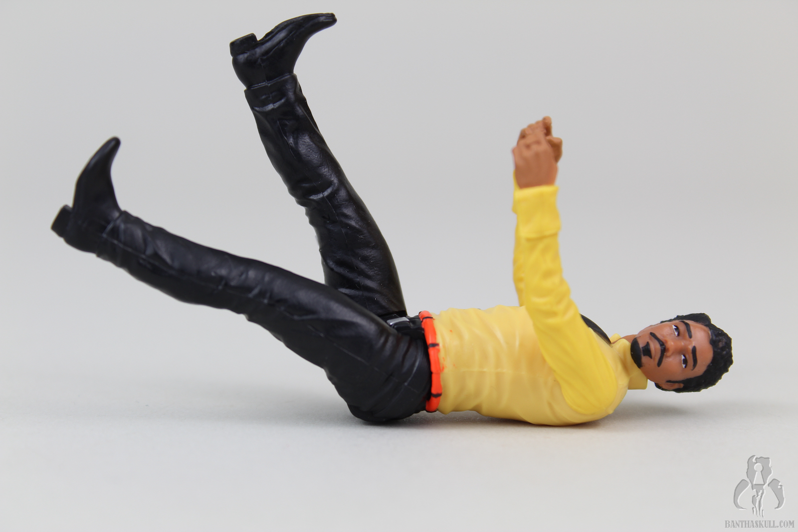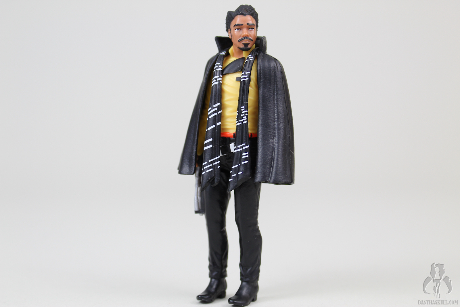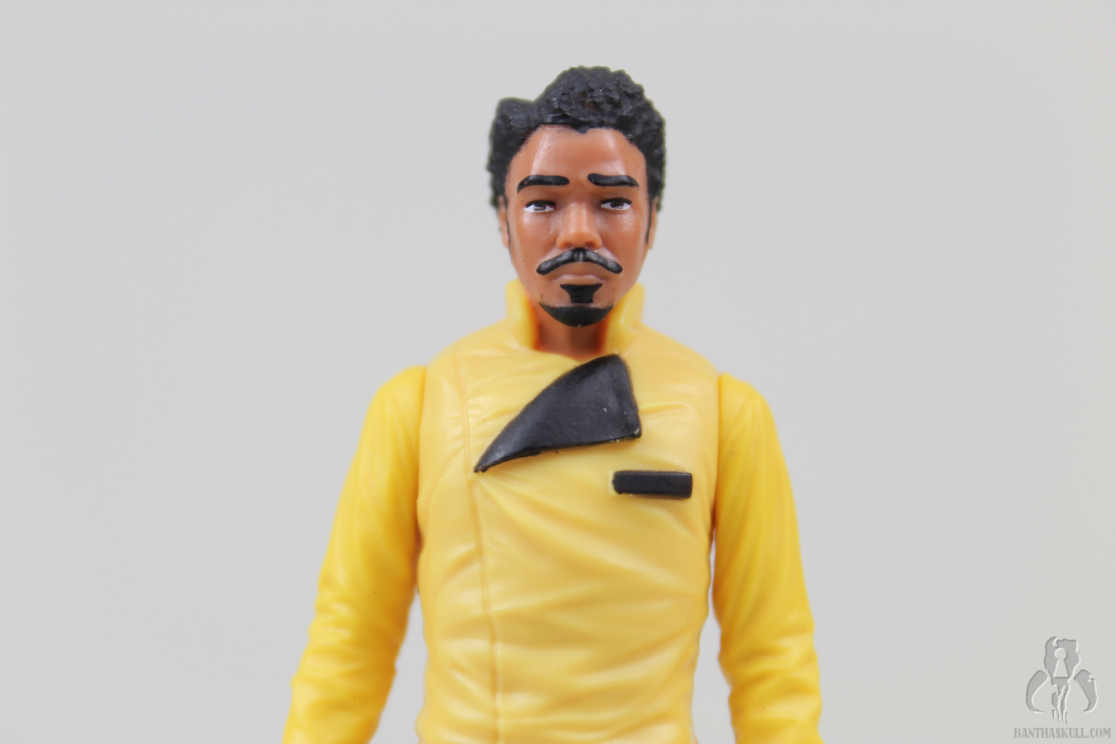 As for the coolest scoundrel in the galaxy, the Lando Calrissian figure also seems to be pretty screen accurate from what we’ve seen. The cape and scarf are a soft plastic, allowing Lando’s arms to move out from underneath. The cape is, of course, removable. This reveals Lando’s neon yellow dress shirt, and he strikes quite the dapper pose with his black pants and shoes. The figure’s paint applications are executed well. I have to say that my sample has a face sculpt/paint application that results in an amazing likeness to Donald Glover. While we often bemoan the 5POA figures, it seems that Hasbro has been improving face sculpts over the past couple of years. Sure, there are still plenty of misses, but when they hit, it’s a home run. Lando has an unusual holster, but it works well to hold the included blaster, which the figure also grips well in its hands. Lando is a beloved main character, and he needs collector-grade treatment. The lack of articulation is upsetting here, and I hope Hasbro makes the necessary update in the not-to-distant future.