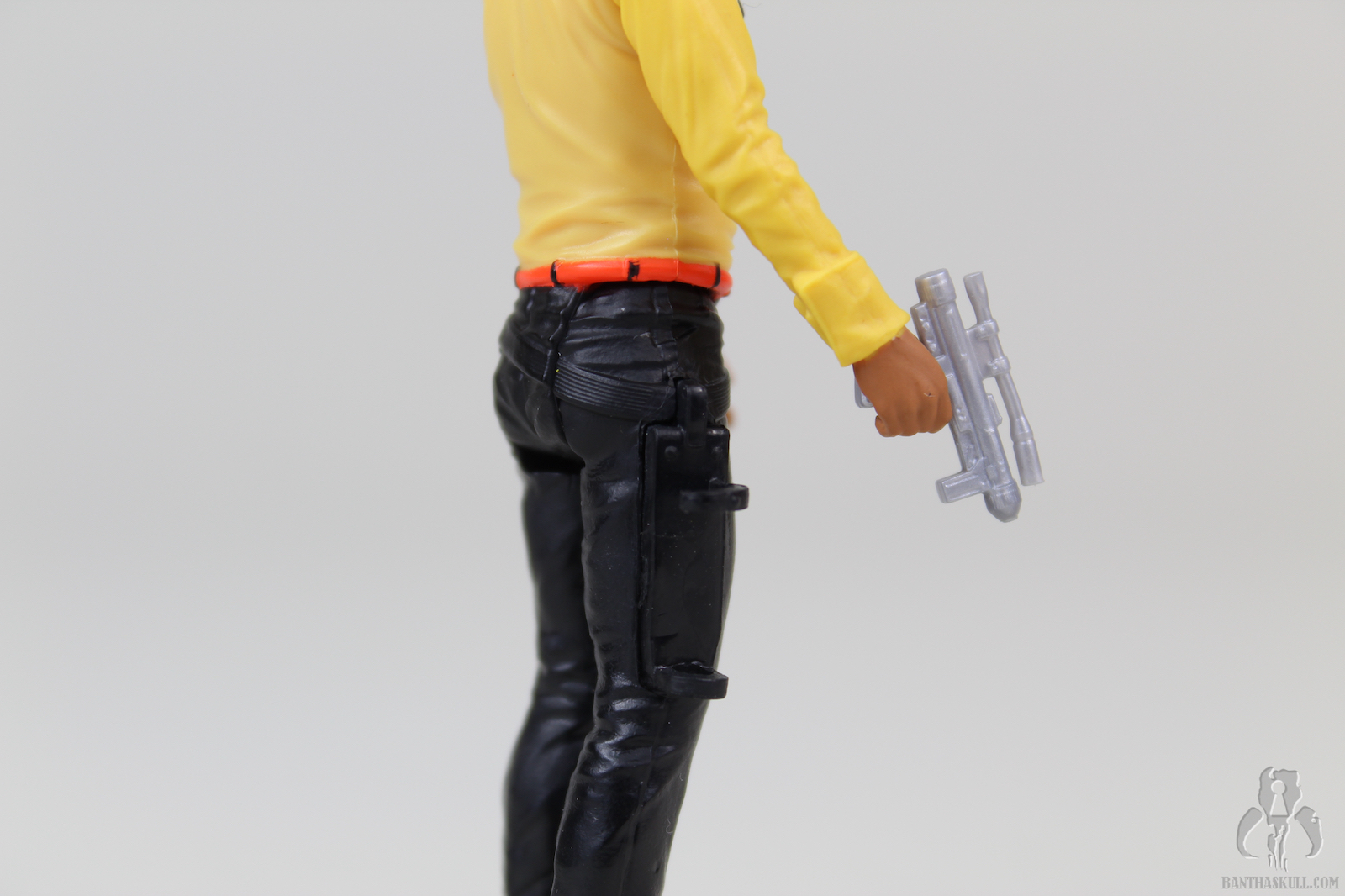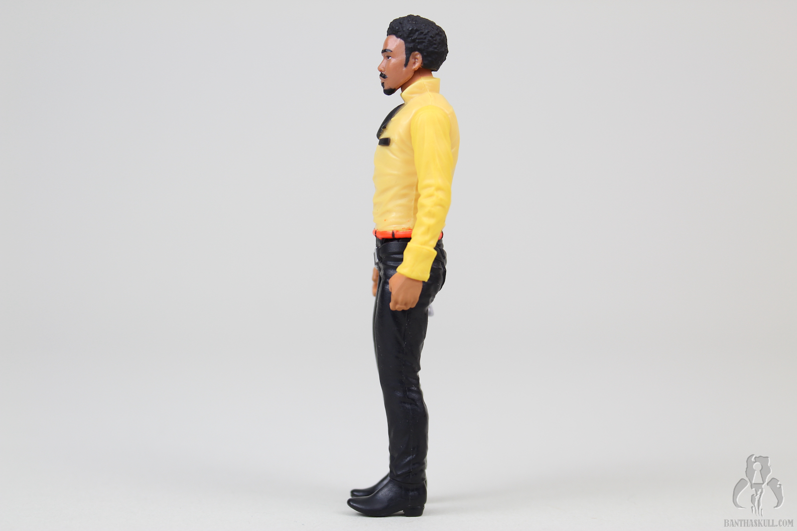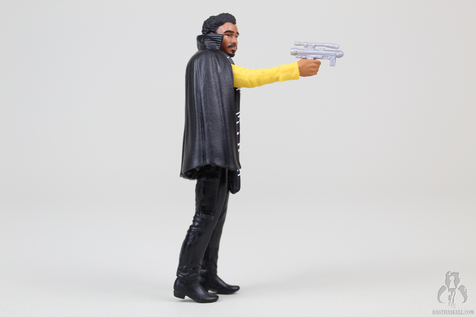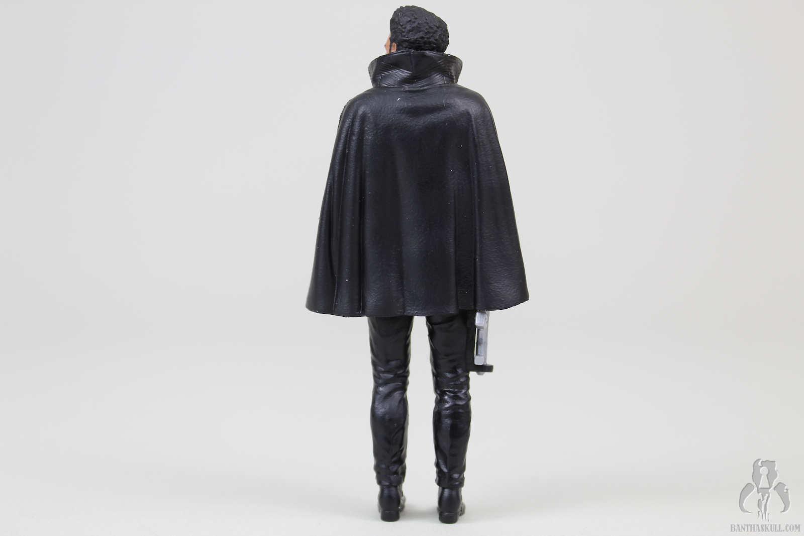 As for the coolest scoundrel in the galaxy, the Lando Calrissian figure also seems to be pretty screen accurate from what we’ve seen. The cape and scarf are a soft plastic, allowing Lando’s arms to move out from underneath. The cape is, of course, removable. This reveals Lando’s neon yellow dress shirt, and he strikes quite the dapper pose with his black pants and shoes. The figure’s paint applications are executed well. I have to say that my sample has a face sculpt/paint application that results in an amazing likeness to Donald Glover. While we often bemoan the 5POA figures, it seems that Hasbro has been improving face sculpts over the past couple of years. Sure, there are still plenty of misses, but when they hit, it’s a home run. Lando has an unusual holster, but it works well to hold the included blaster, which the figure also grips well in its hands. Lando is a beloved main character, and he needs collector-grade treatment. The lack of articulation is upsetting here, and I hope Hasbro makes the necessary update in the not-to-distant future.