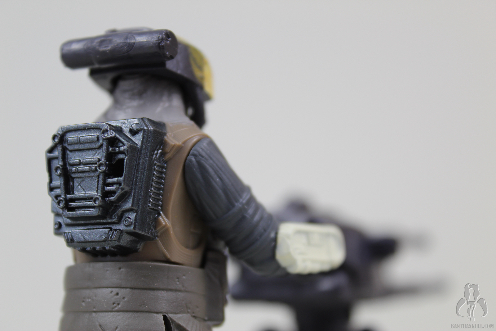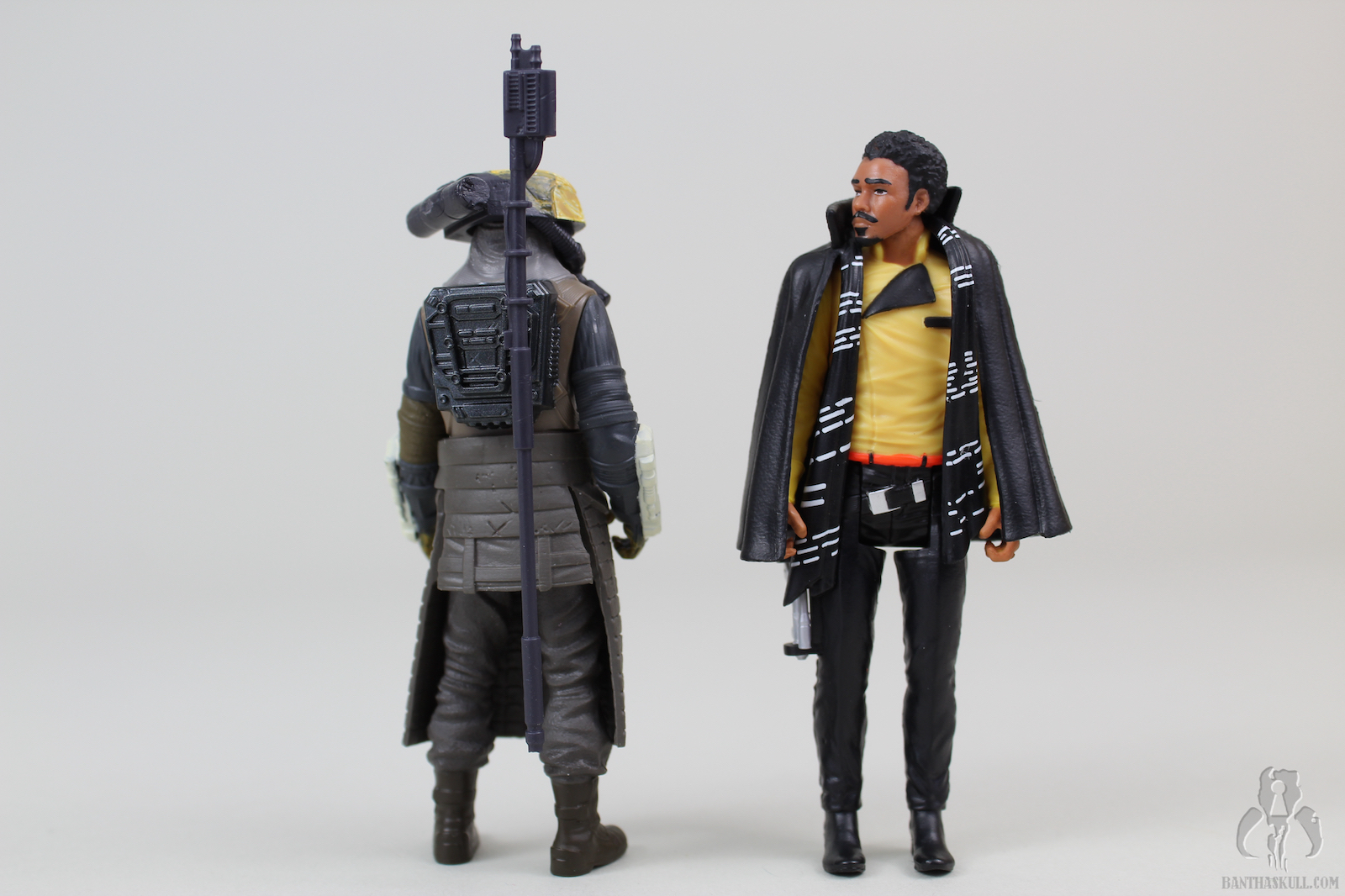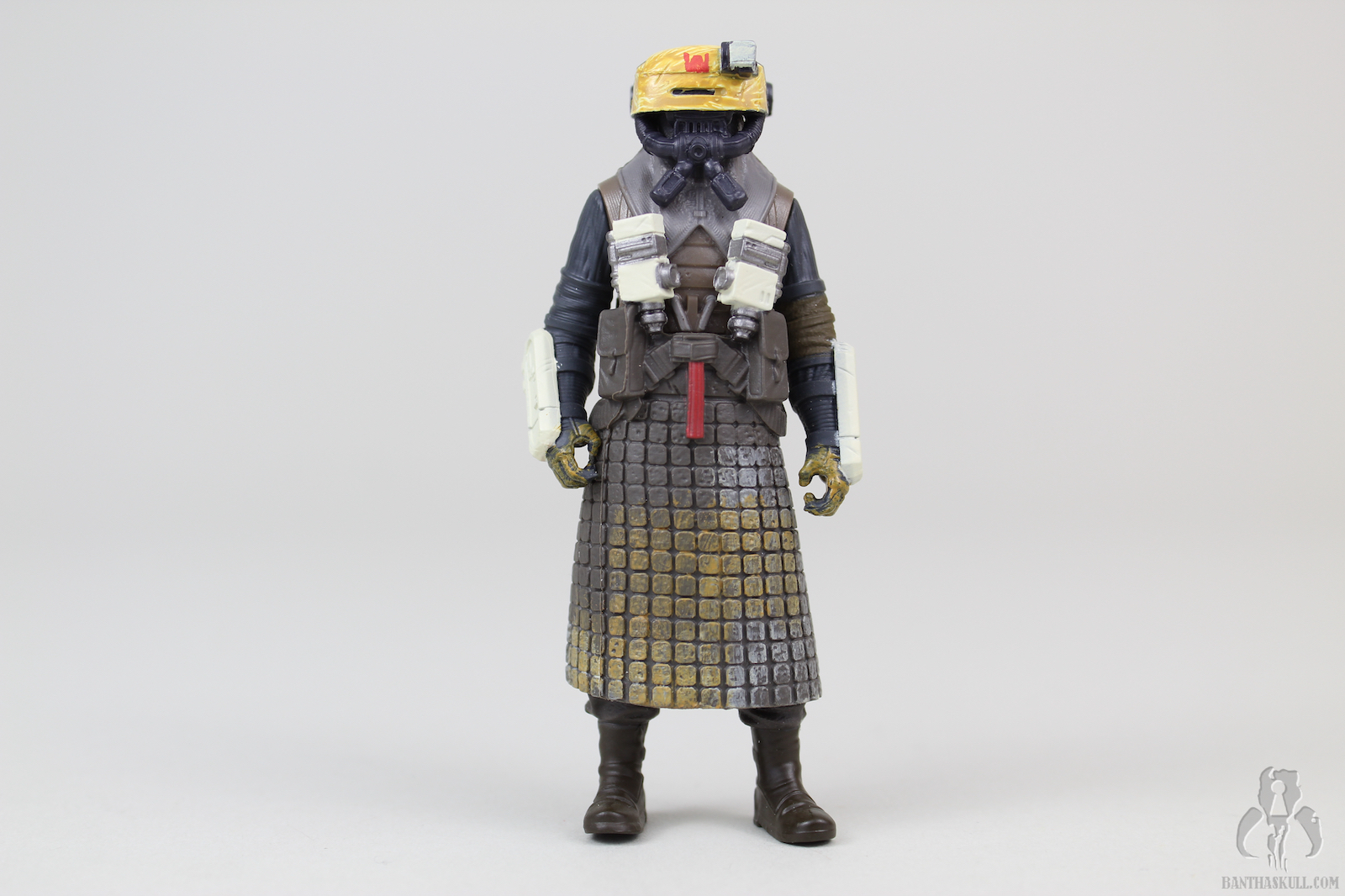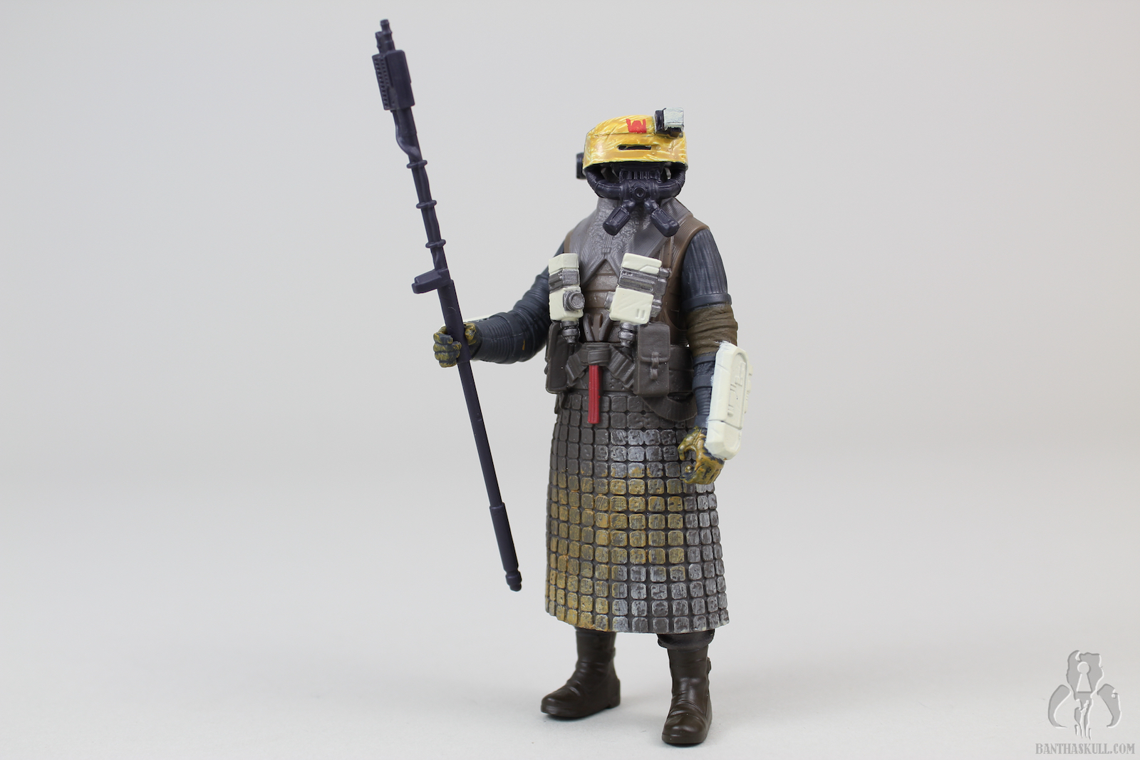 Can you guess which figure I was talking about? It’s the Kessel Guard. That guy has some swag, but without the much-needed articulation, he just stands there. Nah, I’m just kidding. I totally fooled you. The Kessel Guard is actually a really nice looking figure, but he’s no Lando. The Guard is an interesting design that brings to mind samurai styling, while still maintaining a Star Warsy feel to it. The sculpt is excellent (although not too sure about accuracy yet, because of that whole film-not-being-out-yet thing…), but even if this character hit the cutting room floor, it’s a neat design that I am glad exists in plastic form. The details and textures in the sculpted uniform are tremendous. Lots to look at and admire. The “kilt” is made of a very soft and flexible plastic, allowing for the legs to get a full range of motion at the hips. The helmet is interesting as well. Several colors were used to paint all the parts of the uniform and helmet, and an interesting wash of dirt was applied to the “kilt”. The Kessel Guard comes with a sculpted back pack which has a notch to accommodate the staff weapon. The figure can grip the staff in a vertical “guard” fashion, which I assume is somewhat screen accurate, but it would be nice if he at least had articulated arms to be able to do the THWG. Maybe it’s not that big of a deal. For all we know, the character just stands at attention on screen. We shall find out!