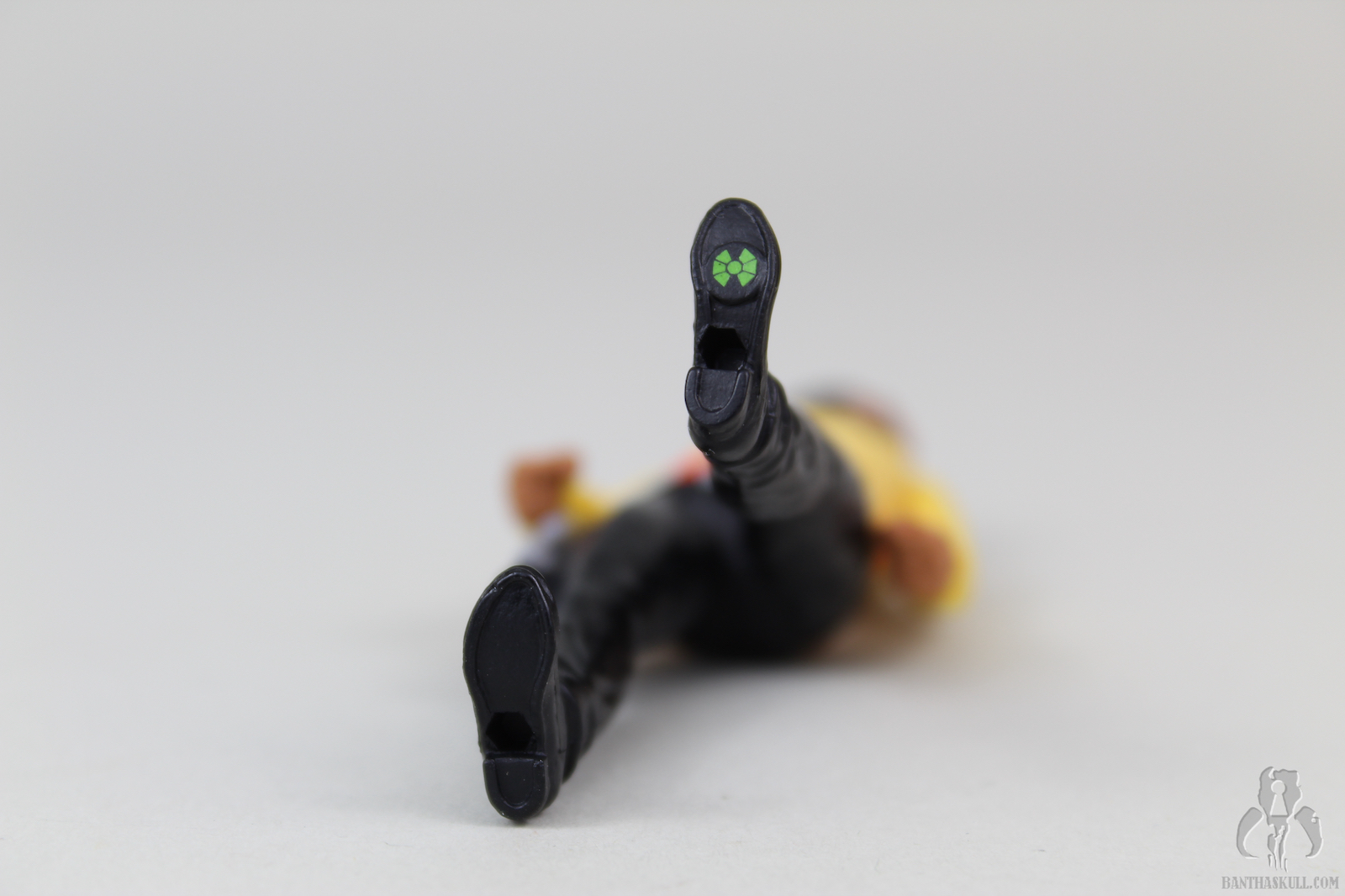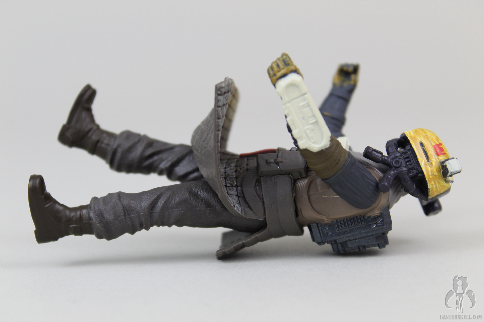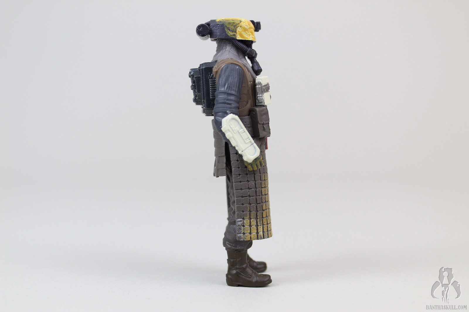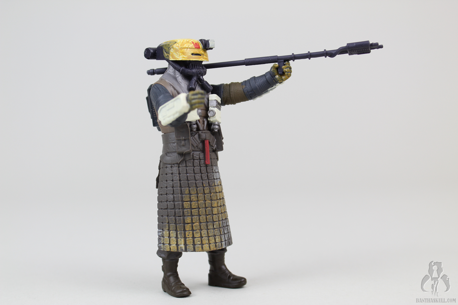 Can you guess which figure I was talking about? It’s the Kessel Guard. That guy has some swag, but without the much-needed articulation, he just stands there. Nah, I’m just kidding. I totally fooled you. The Kessel Guard is actually a really nice looking figure, but he’s no Lando. The Guard is an interesting design that brings to mind samurai styling, while still maintaining a Star Warsy feel to it. The sculpt is excellent (although not too sure about accuracy yet, because of that whole film-not-being-out-yet thing…), but even if this character hit the cutting room floor, it’s a neat design that I am glad exists in plastic form. The details and textures in the sculpted uniform are tremendous. Lots to look at and admire. The “kilt” is made of a very soft and flexible plastic, allowing for the legs to get a full range of motion at the hips. The helmet is interesting as well. Several colors were used to paint all the parts of the uniform and helmet, and an interesting wash of dirt was applied to the “kilt”. The Kessel Guard comes with a sculpted back pack which has a notch to accommodate the staff weapon. The figure can grip the staff in a vertical “guard” fashion, which I assume is somewhat screen accurate, but it would be nice if he at least had articulated arms to be able to do the THWG. Maybe it’s not that big of a deal. For all we know, the character just stands at attention on screen. We shall find out!