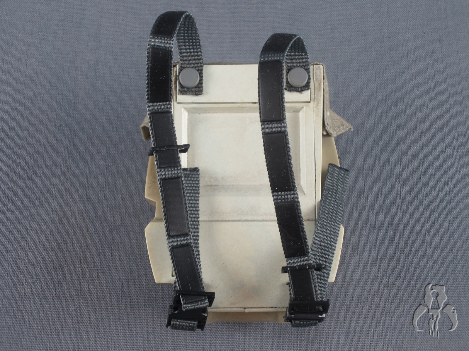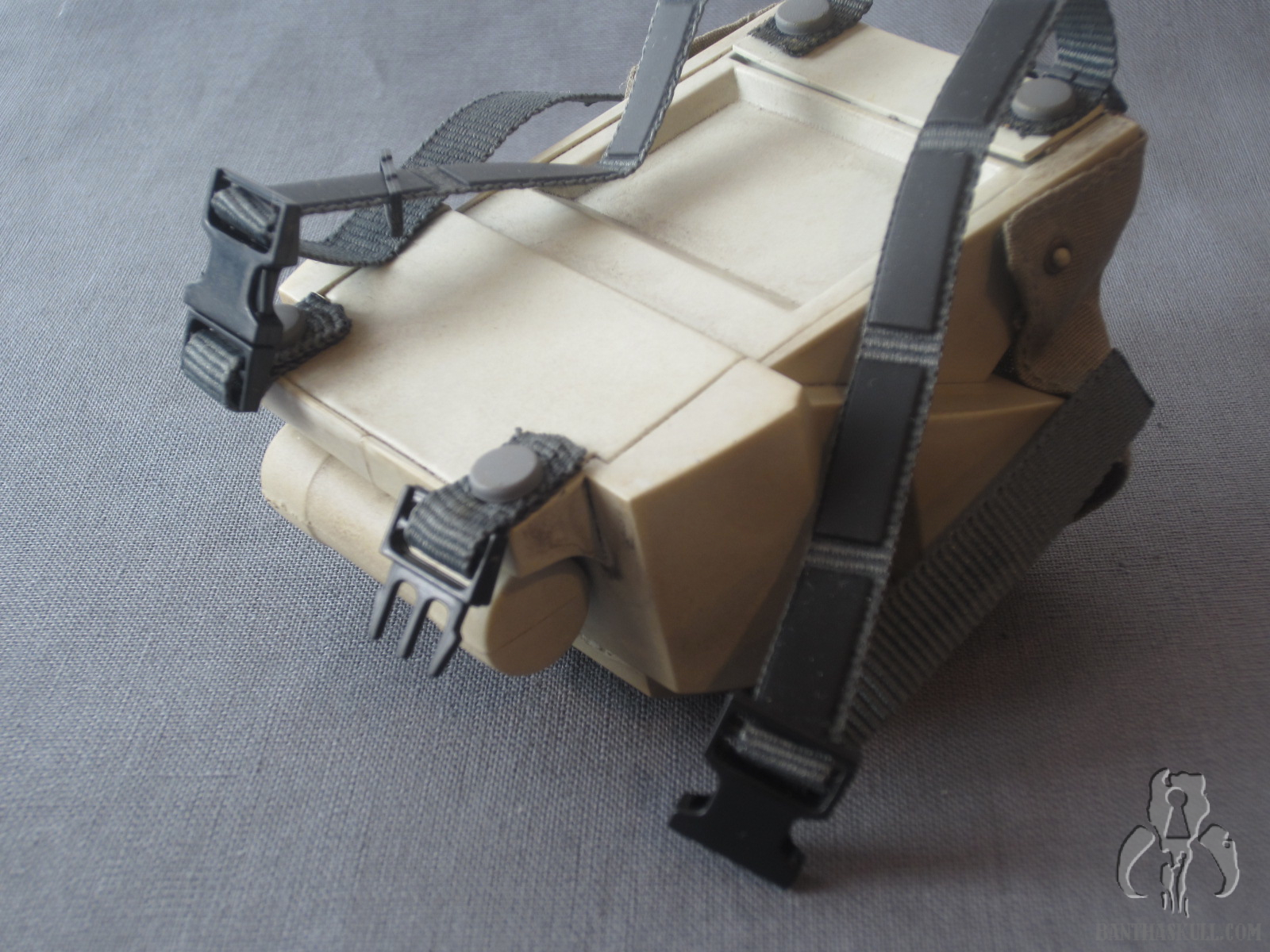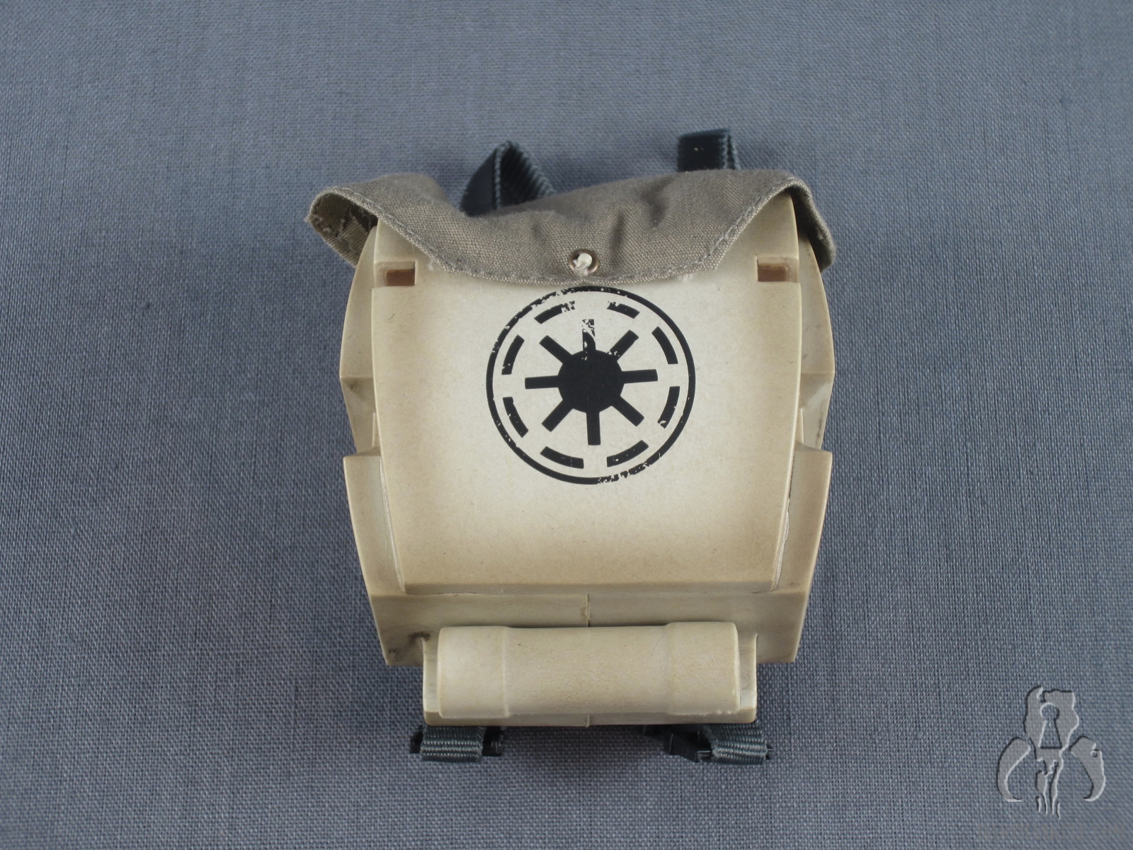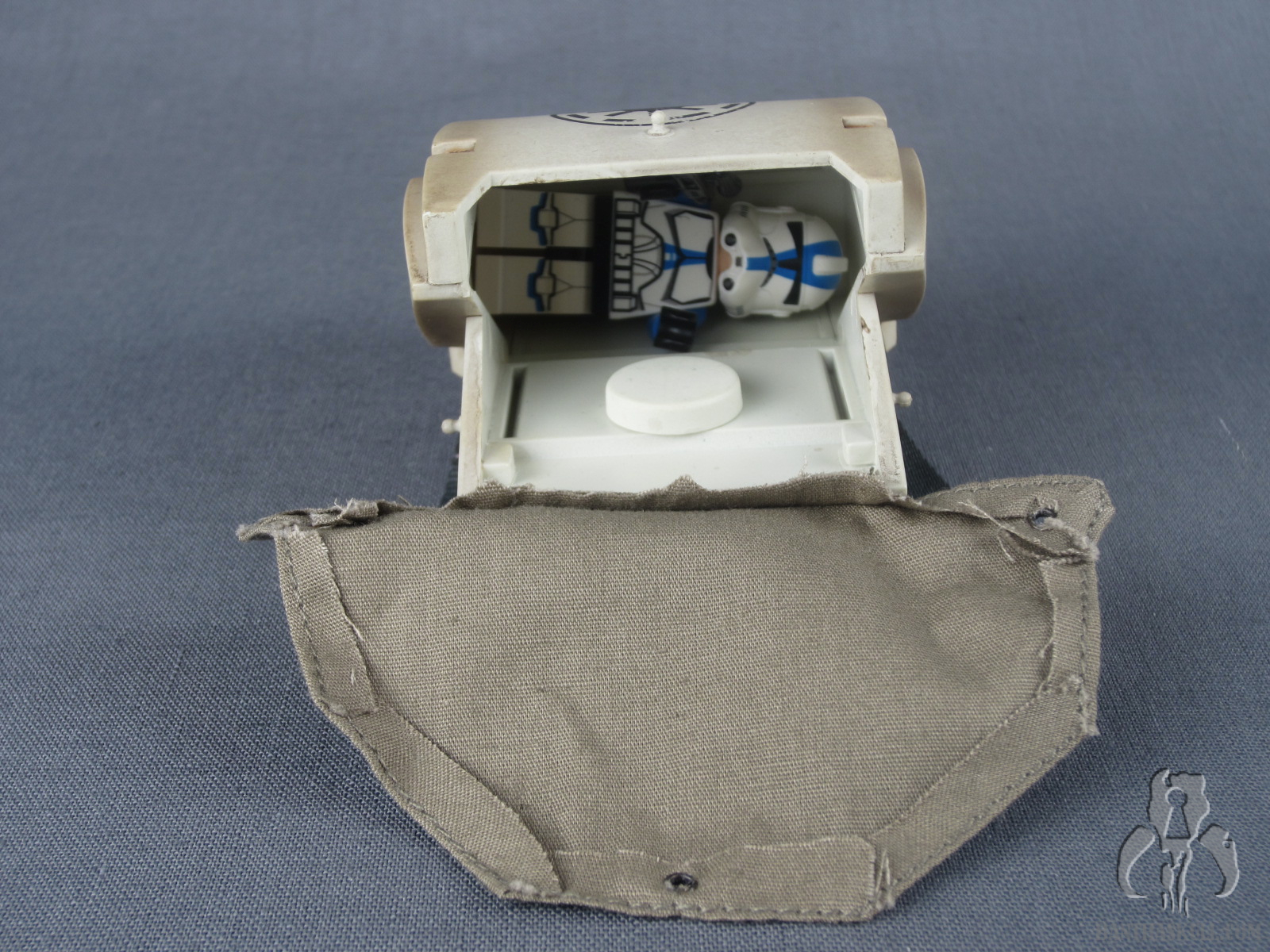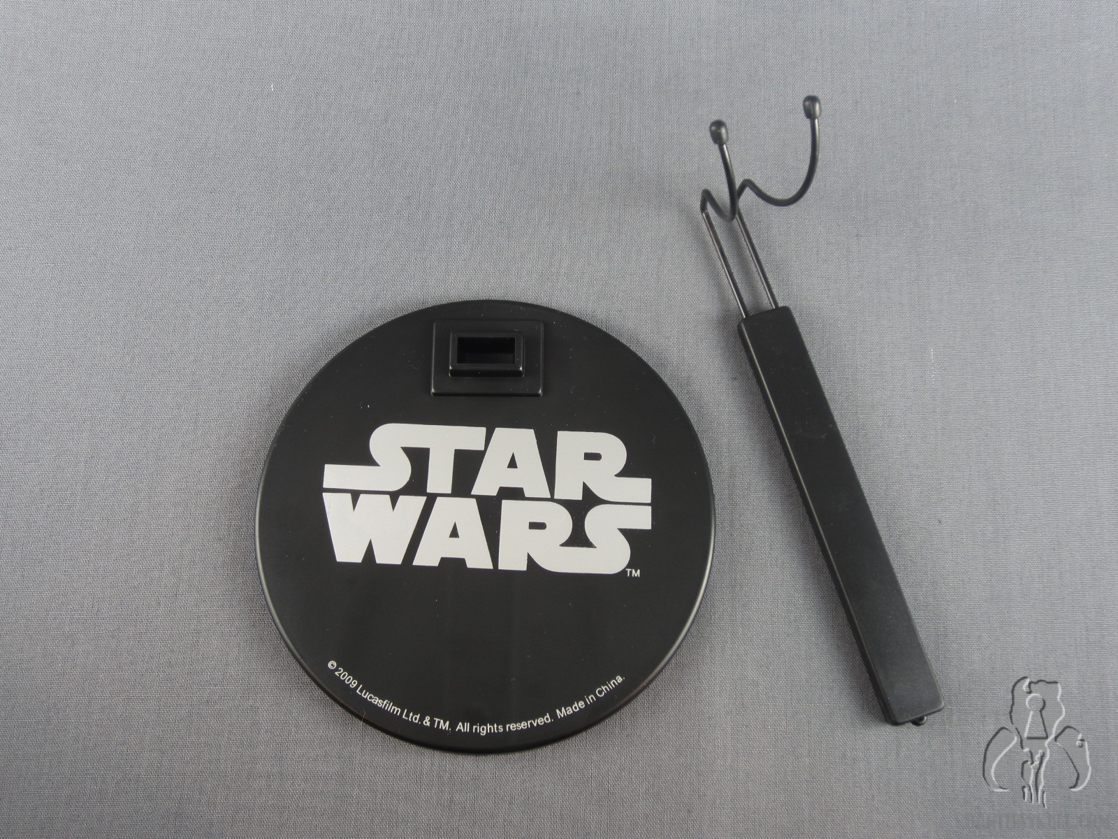There is a pair of standard feet and a pair of action feet. The clone also comes with 6 pairs of hands and an extra left, so he can go shooting, throwing, grabbing, punching, er…fisting, and, uh, hitchhiking. He comes with a stand that has the Star Wars logo on it, which differs from the pre-production shots from Sideshow that show the base to have a yellow Clone Wars logo. I’m fine with this change. Finally, he comes with a backpack, in which he can keep his stuff and whatnot. The detail on this is pretty interesting. A cloth cover with 3 snaps, and the shoulder straps actually come with a tiny version of clips you’d find on a full size backpack. The only thing that I could think of that might be missing would be an alternate Jango head, but since I personally wouldn’t bother displaying these guys without a helmet, I don’t miss that.