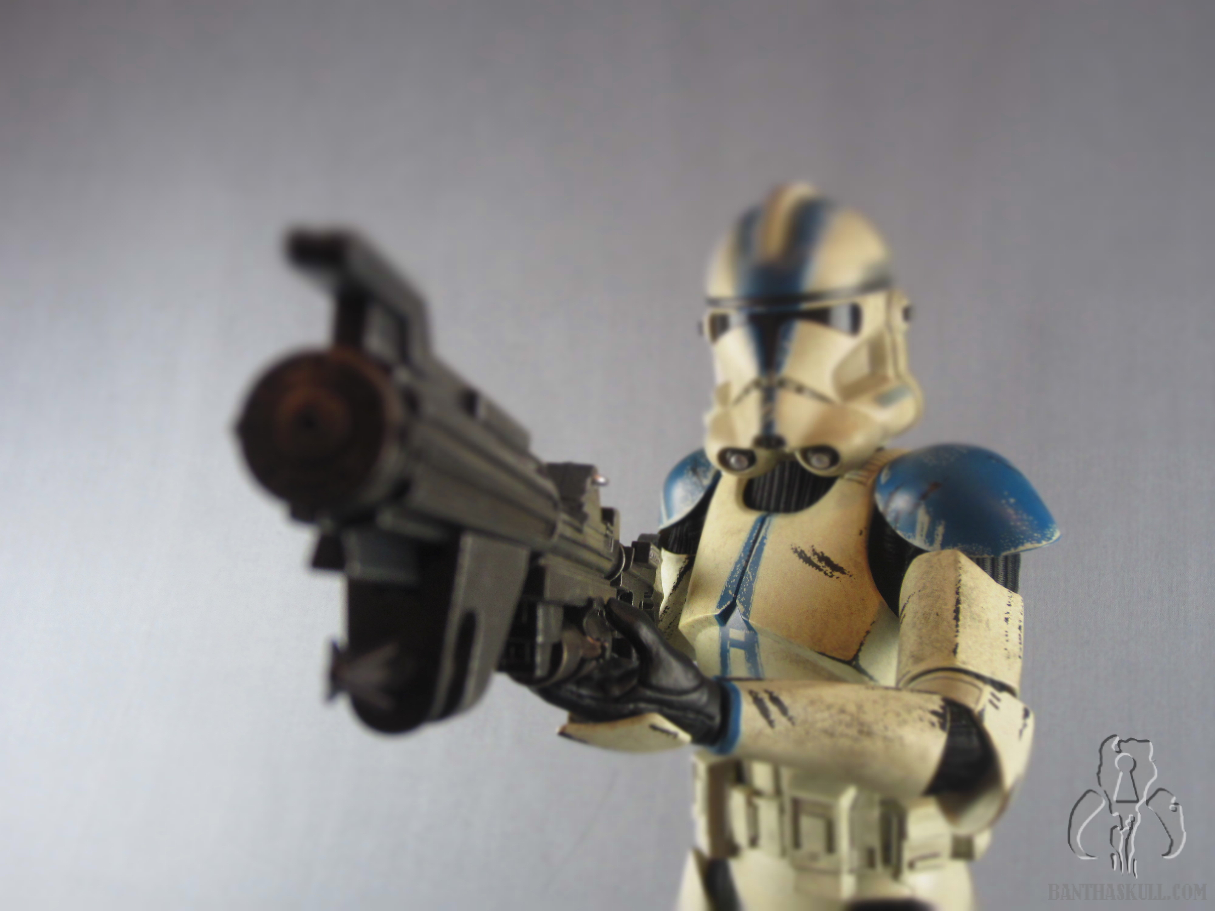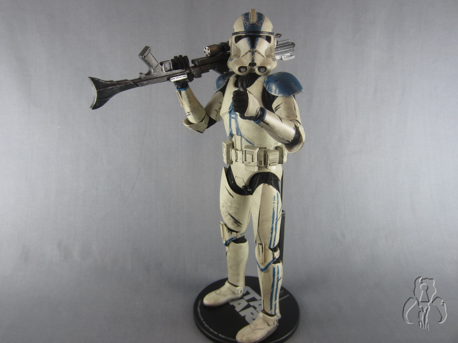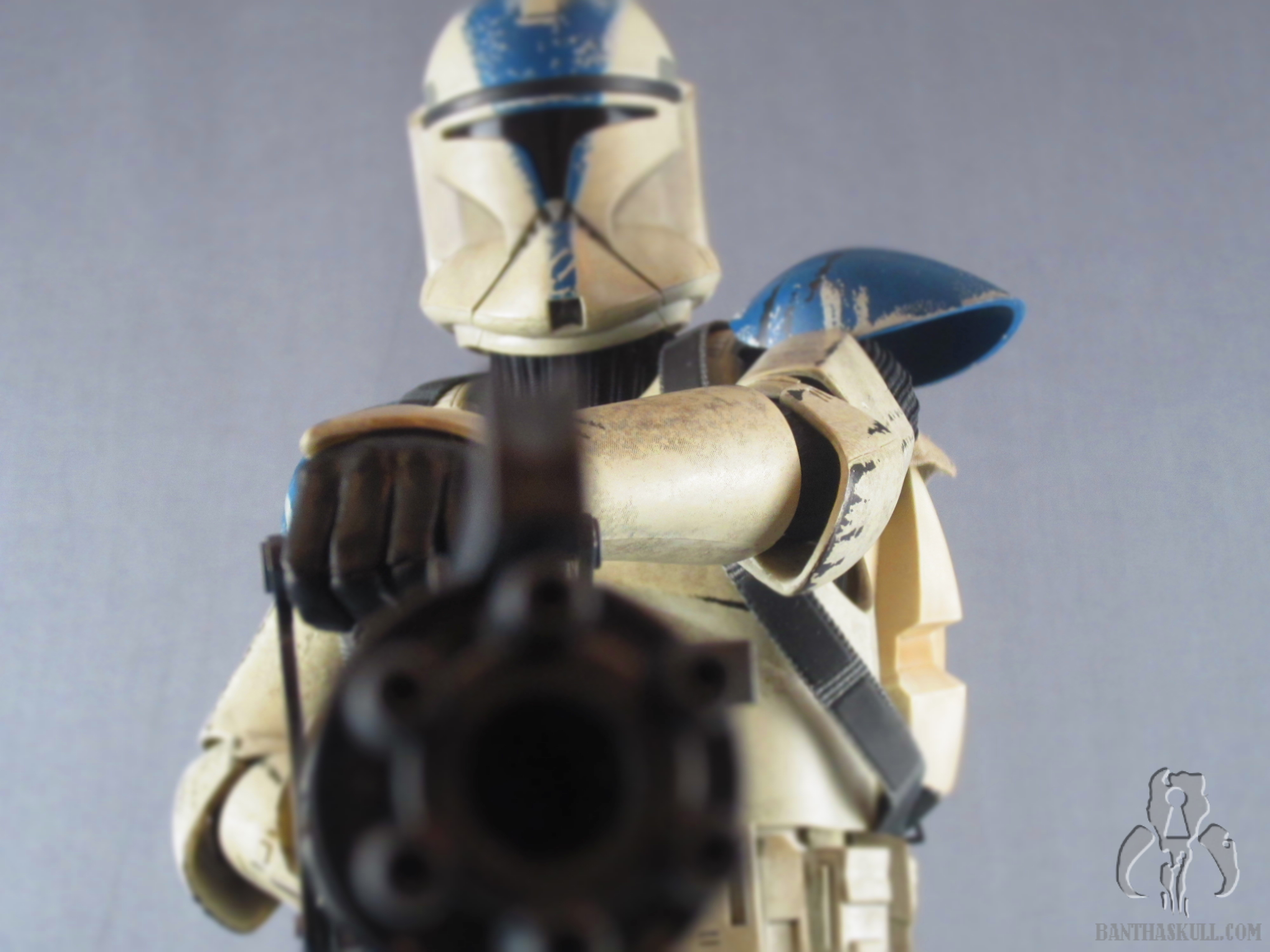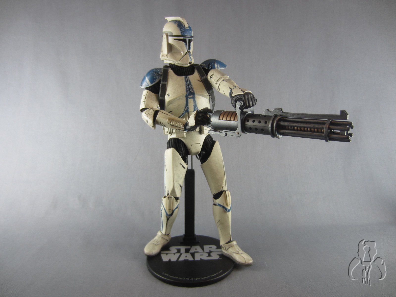 First off, please note that Sideshow is releasing 4 differently decorated clones using this newly sculpted deluxe format. The all white “shiny” version, the all white battle damaged “veteran”, this 501st, and the soon to be released 212th. Improving upon its predecessor from the “Militaries of Star Wars” sub line, this clone trooper boasts a ton of display options. The most obvious of which is the option to display with either a phase I or phase II helmet. He comes with a Z-6 Rotary Cannon (which is freakin’ sweet), a DC-15S blaster, a DC-15A rifle, and 4 droid popper grenades. The rifle comes with a removable ascension attachment, and a thing that tells time.