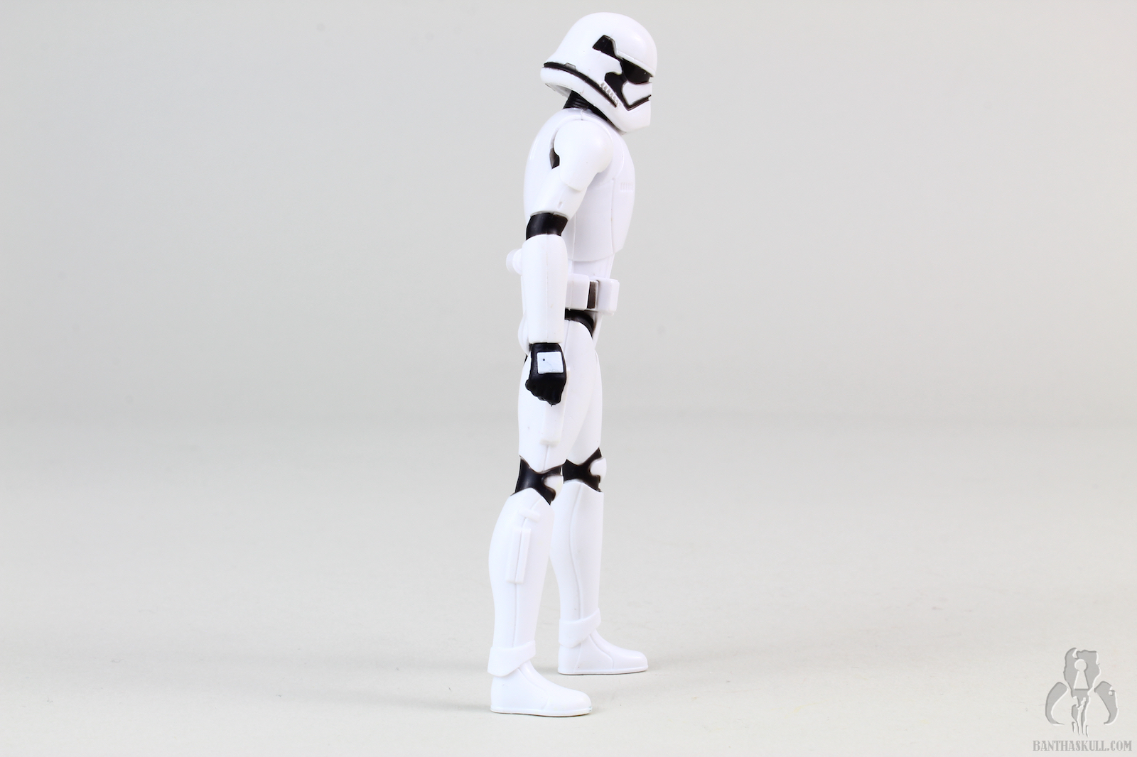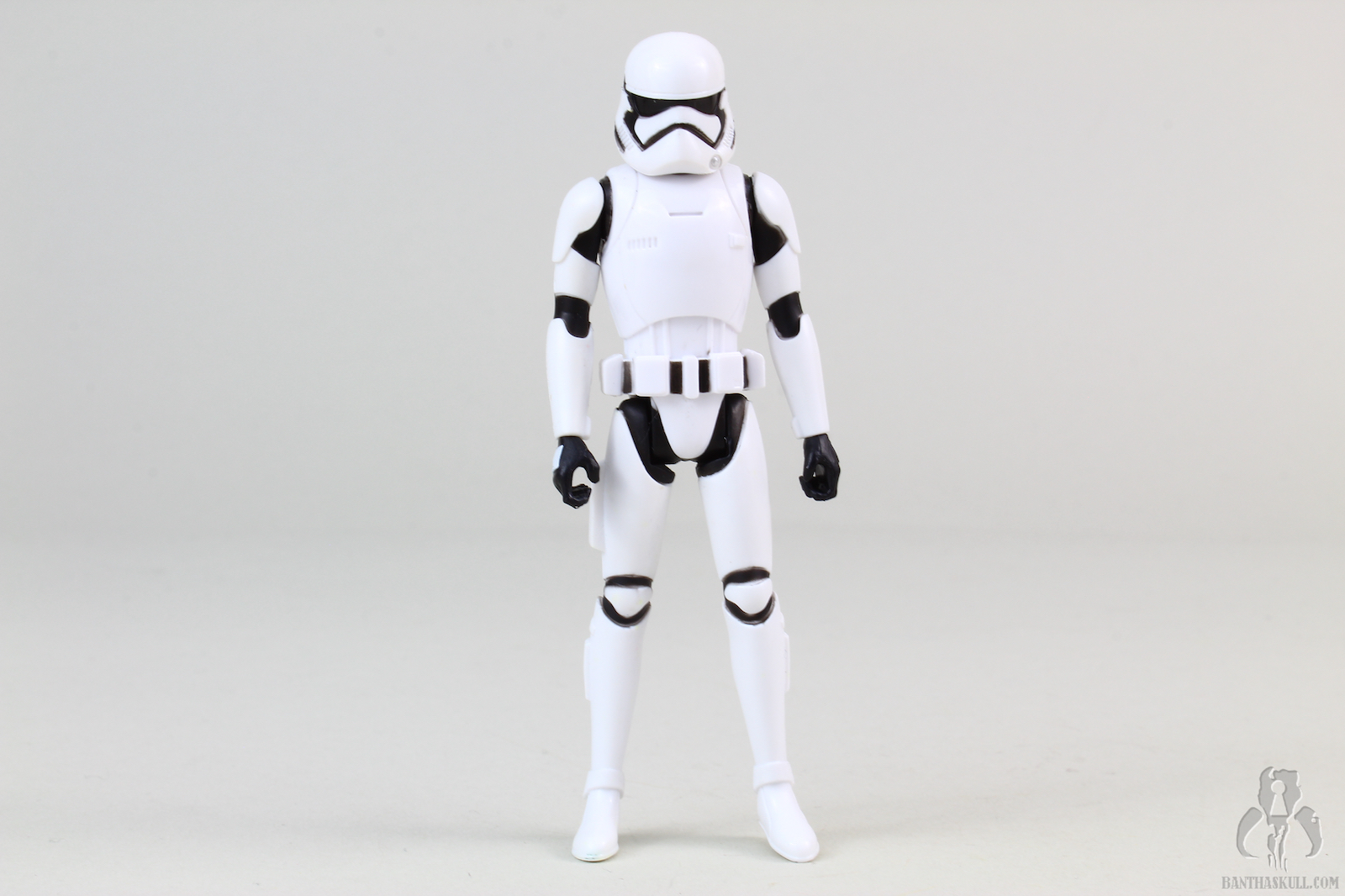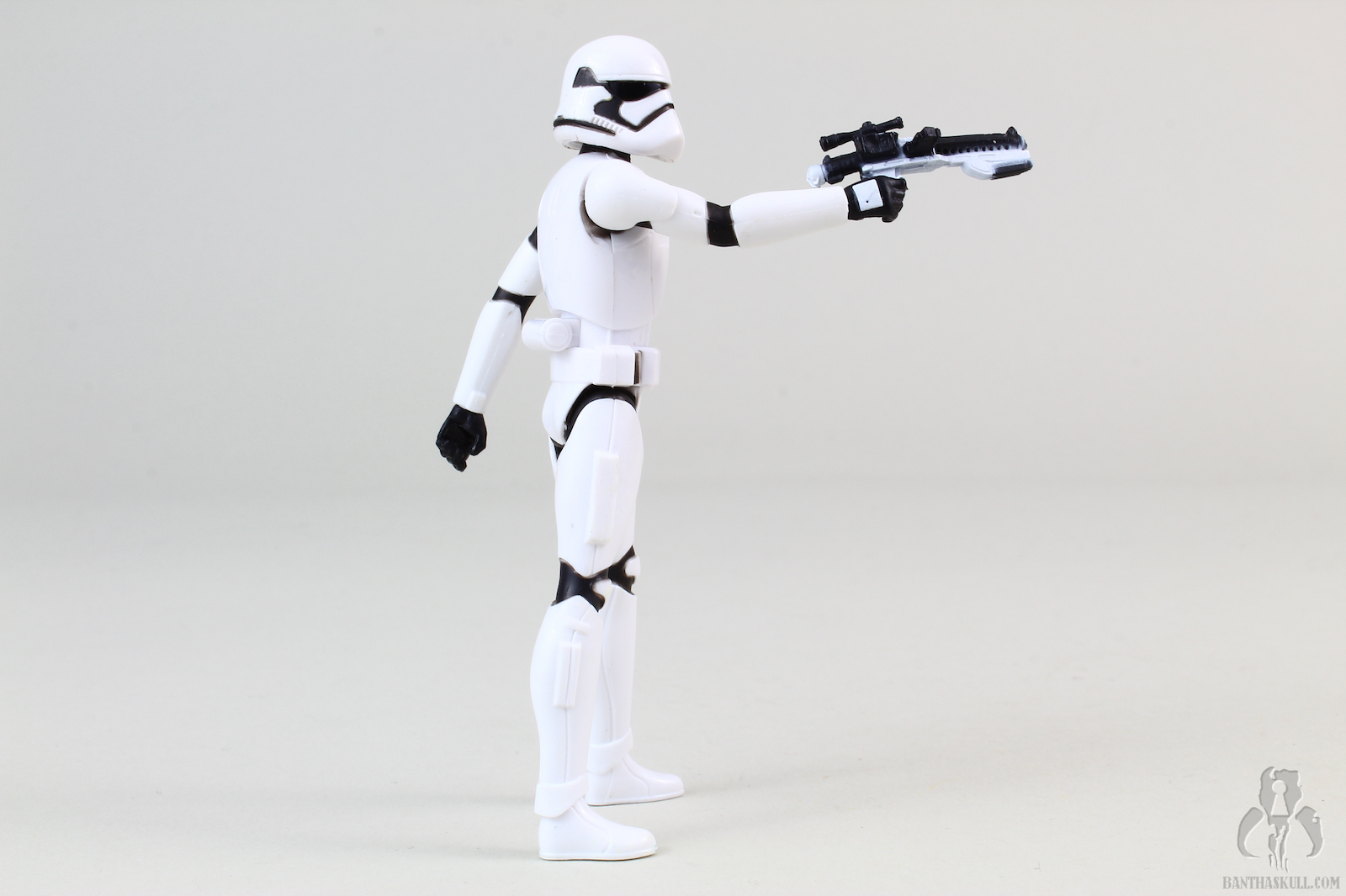 Nevertheless, we get an all new, weird looking unrealistically skinny stormtooper, that also happens to be 5POA. The figure is simply sculpted. The even simpler paint applications aren’t as quite as sloppy as on the Kaz Xiono figure, but they could be sharper given the low degree of difficulty. My sample has a bit of a problem standing up, and part of this may be because of the slightly non-neutral stance. This, of course, is a gripe in and of itself. Even if you were so inclined to army build these guys, the non-neutral pose makes that a fruitless endeavor. The figure has a blaster, which is similar to the realistic version. However, unlike the SA version, there is no “hip slot” to stow the blaster away. So again, you have to be careful not to lose the thing. It seems this is especially silly if the figures are aimed at kids. Kids lose stuff. It’s what they do. It’s why they’re not allowed to drive, because they’d keep parking the car in public places and then lose the keys. Who needs that?