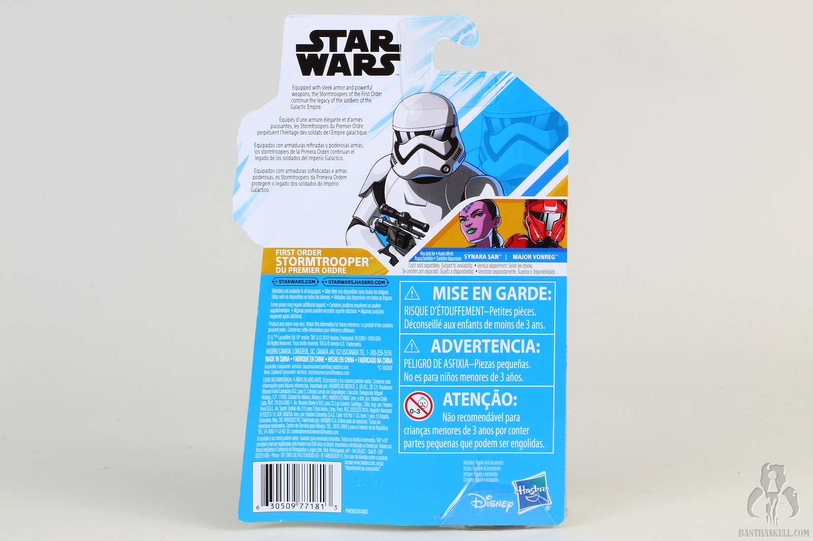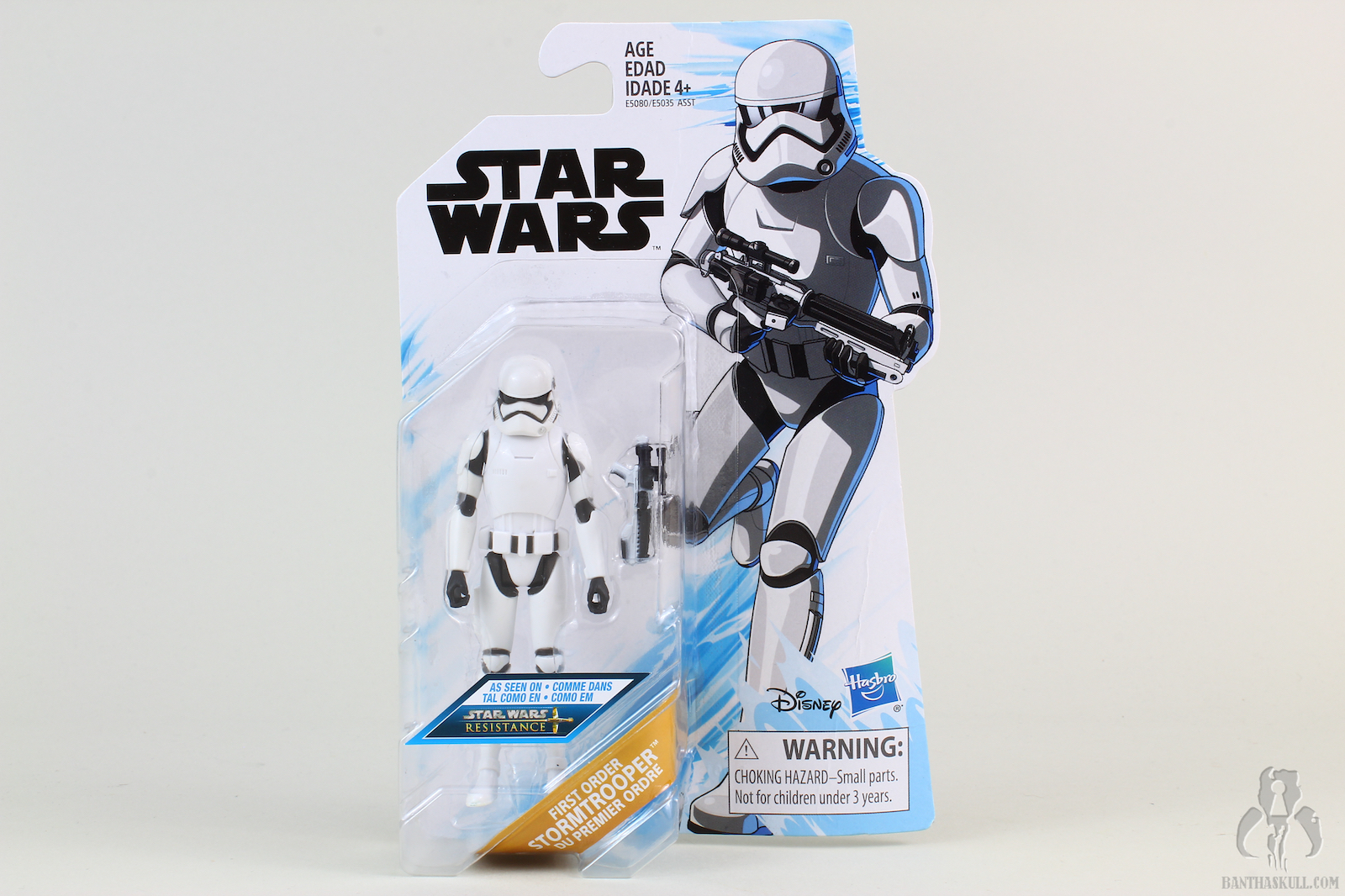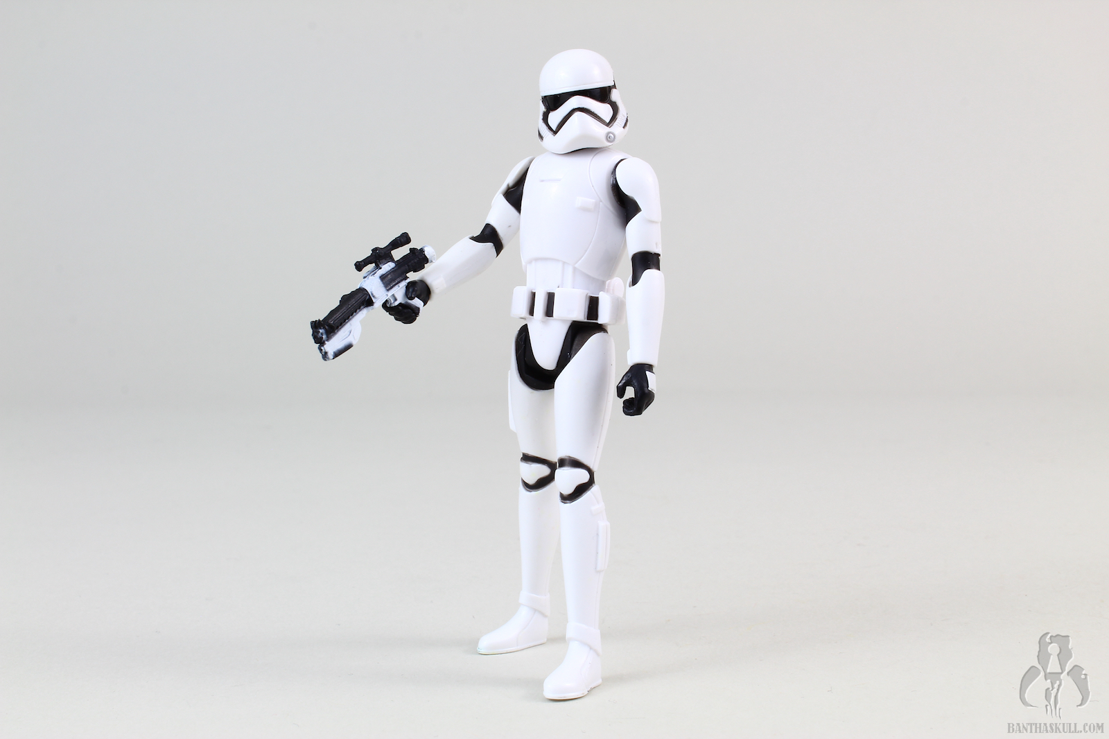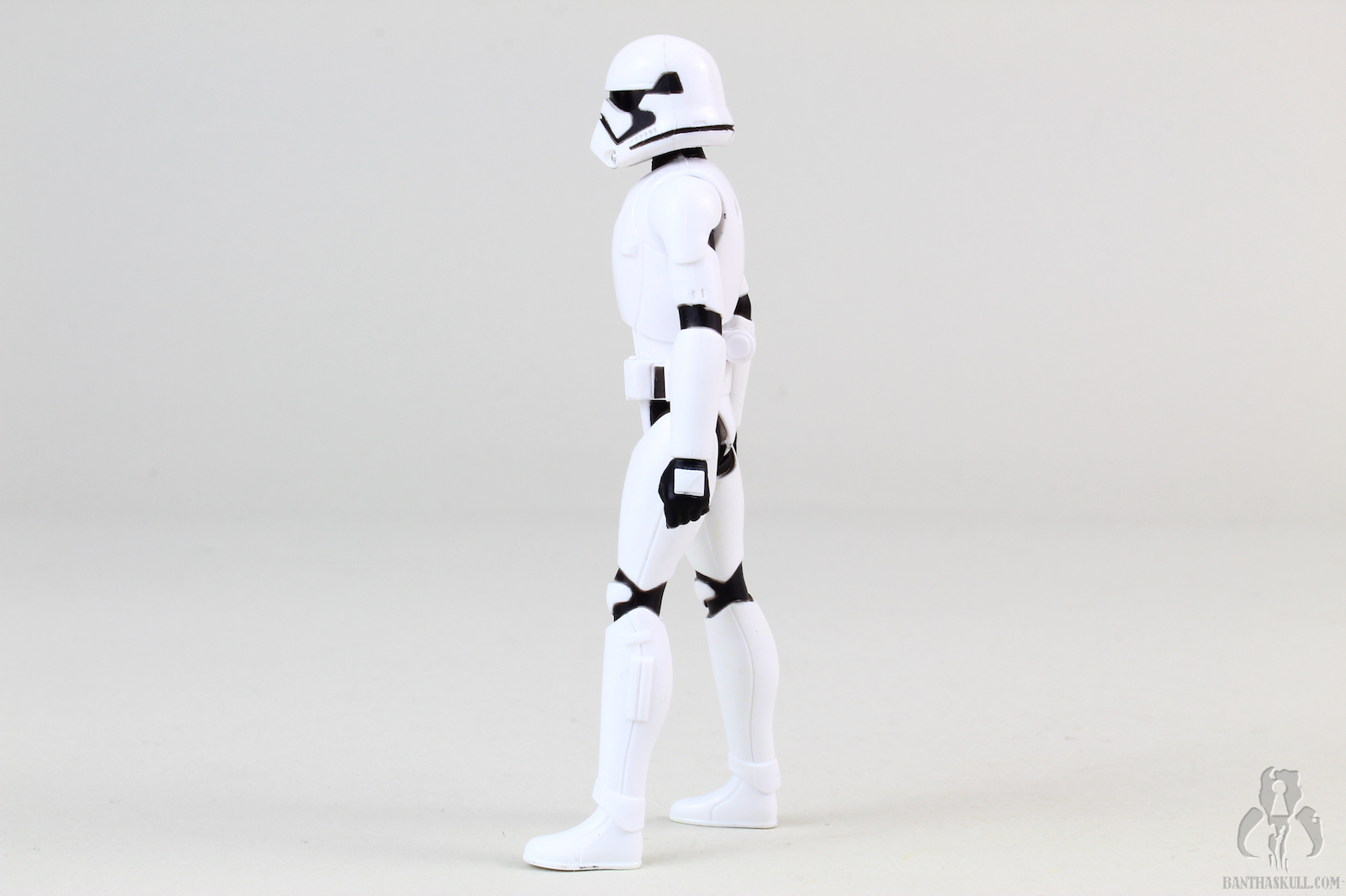 Nevertheless, we get an all new, weird looking unrealistically skinny stormtooper, that also happens to be 5POA. The figure is simply sculpted. The even simpler paint applications aren’t as quite as sloppy as on the Kaz Xiono figure, but they could be sharper given the low degree of difficulty. My sample has a bit of a problem standing up, and part of this may be because of the slightly non-neutral stance. This, of course, is a gripe in and of itself. Even if you were so inclined to army build these guys, the non-neutral pose makes that a fruitless endeavor. The figure has a blaster, which is similar to the realistic version. However, unlike the SA version, there is no “hip slot” to stow the blaster away. So again, you have to be careful not to lose the thing. It seems this is especially silly if the figures are aimed at kids. Kids lose stuff. It’s what they do. It’s why they’re not allowed to drive, because they’d keep parking the car in public places and then lose the keys. Who needs that?