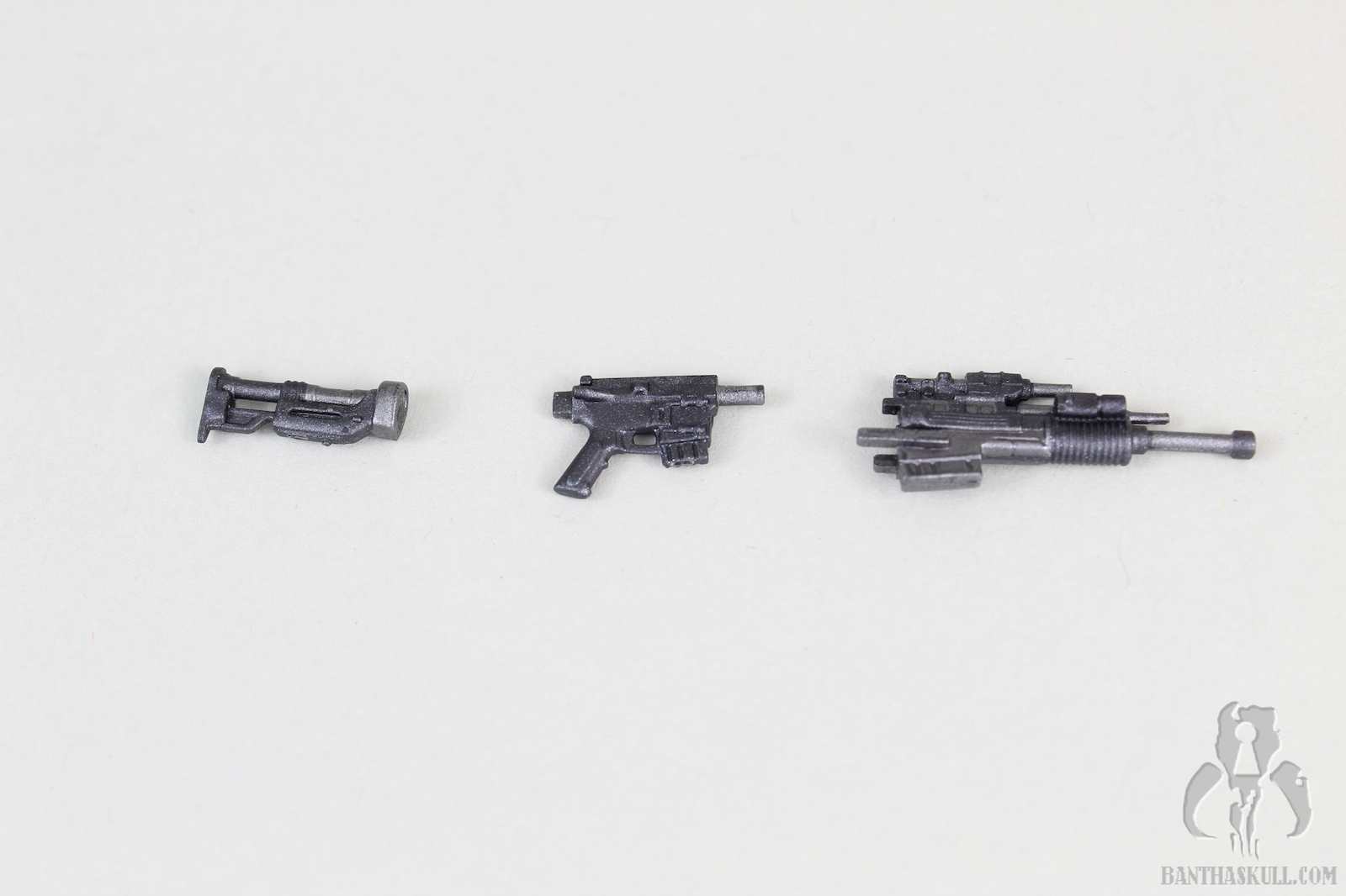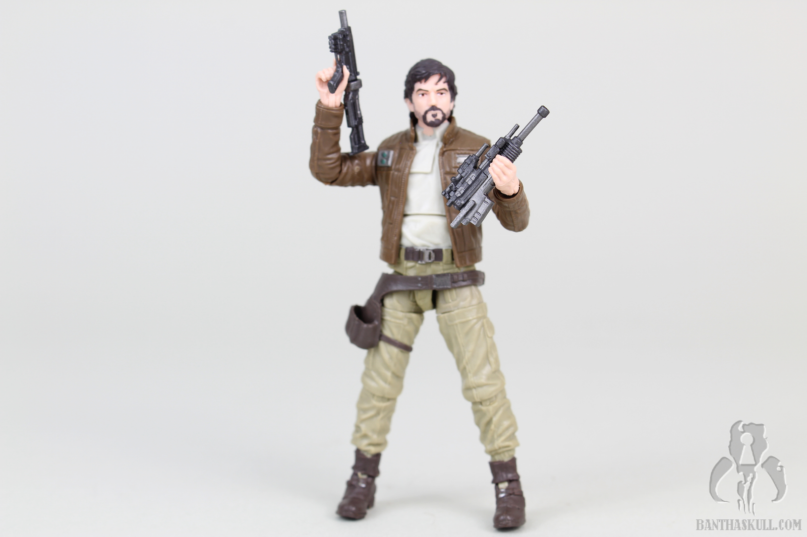 Cassian comes with a pistol, but the pistol also serves as 1 of 3 parts to a larger rifle. A stock can be added, as well as a barrel. The figure’s left hand is sculpted so that it can hold the barrel firmly, thus able to perform the always awesome two-handed weapon grip. Take that, 5POA! It’s a thing of beauty.