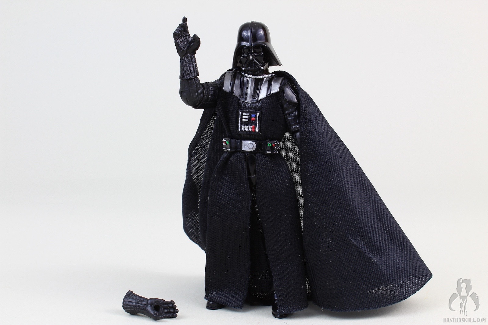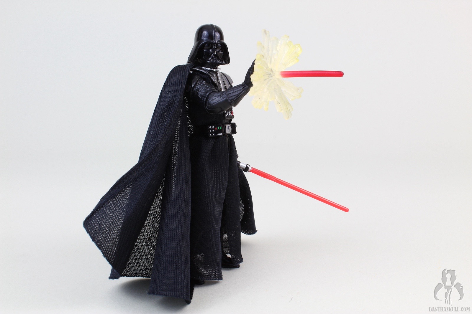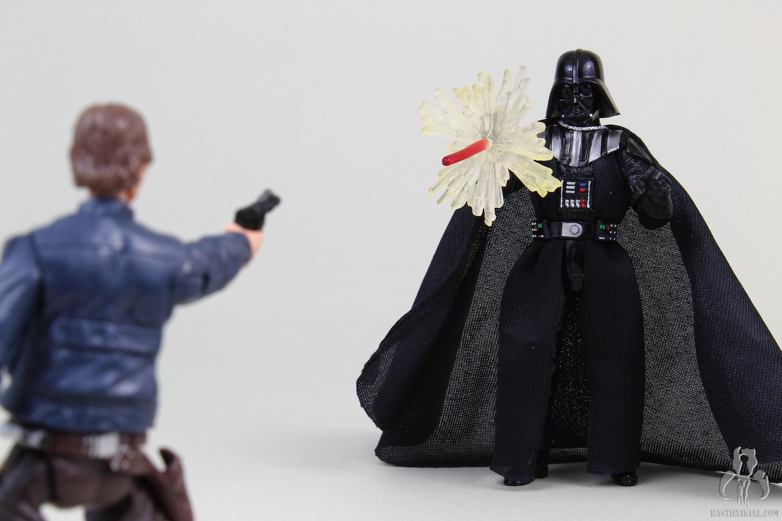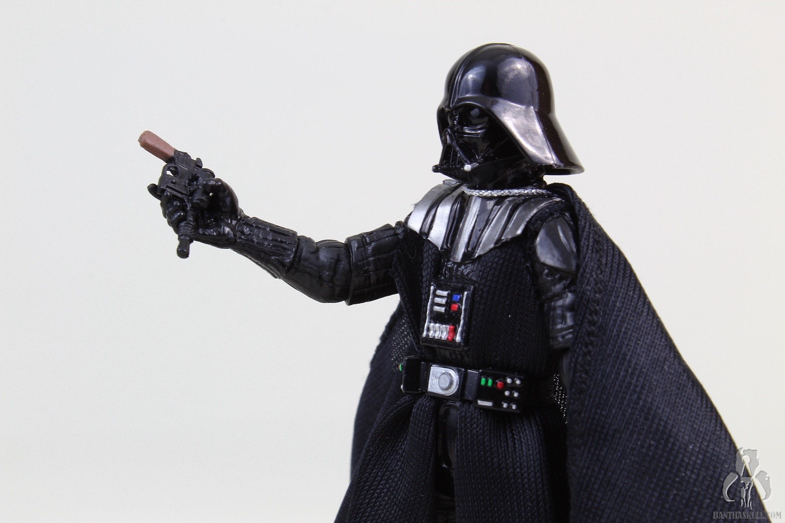 Aside from the non-removable helmet, the two swappable forearms are what distinguish this Vader figure from the dozens of others based on the 2005 Evolutions mold you undoubtedly own. One forearm is purpose built to deflect the laser bolt and to receive the corresponding blast accessory. The other forearm is sculpted to catch the Force-drawn BlasTech DL-44 blaster. Lamentably, I did not realize the second forearm was designed for catching the blaster as I was taking the pictures. You’d probably miss a few things too when you’re sweating your rear end off under the photography lights which are like 1,000 degrees and all you can think about is heading to a cooler setting. Hey kids, speaking of that blaster, this figure comes with the new and correct ESB mold of the DL-44, so you can now properly equip your Vintage Collection Bespin Han Solo figures which come with the ANH version.