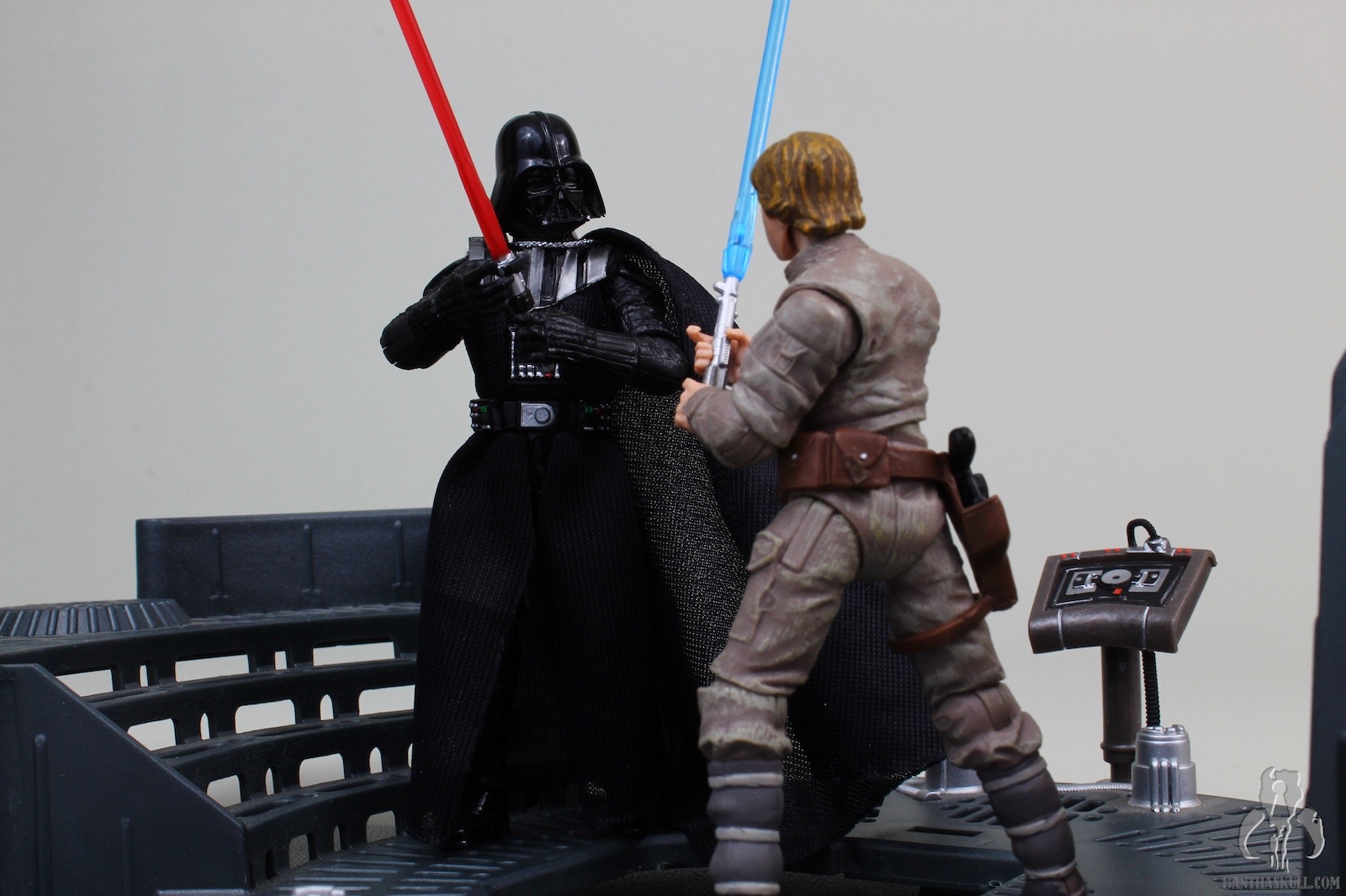 I actually had completely forgotten that this Vader came with the extra hand and blaster, which was buried at the bottom of one of my figure bins. Before I realized this, I went ahead and took photos of this Vader capturing the blaster that came with the TVC Han Solo in the images above, and tried to balance it in the open palm. I thought, “Man, it sure would have been neat if this figure came with an alternate hand, because he can’t even perform a THWG with his lightsaber.” This, of course, precluded me from doing any dueling shots. But then I re-read Chris’s review (a bit more thoroughly the second time), and realized I was missing something. Sure enough, he wasn’t kidding. So I re-took the Force-grab picture with this proper blaster, and then also added the dueling image.