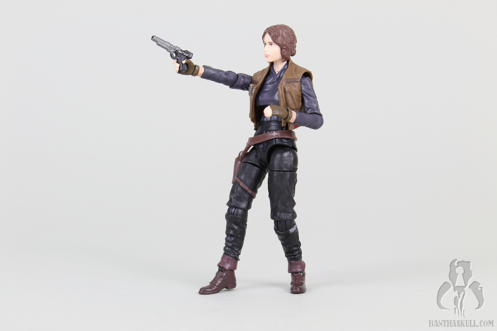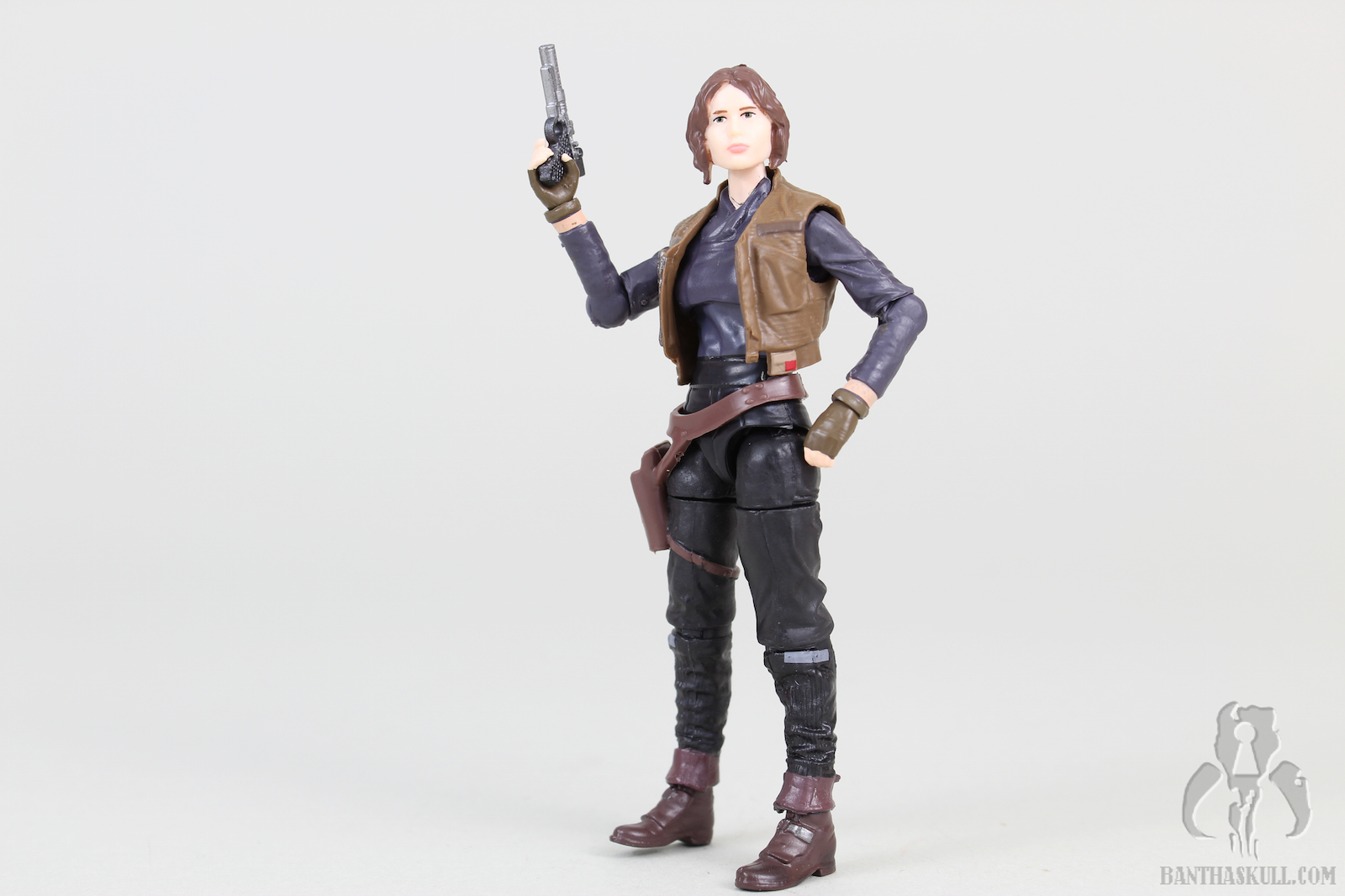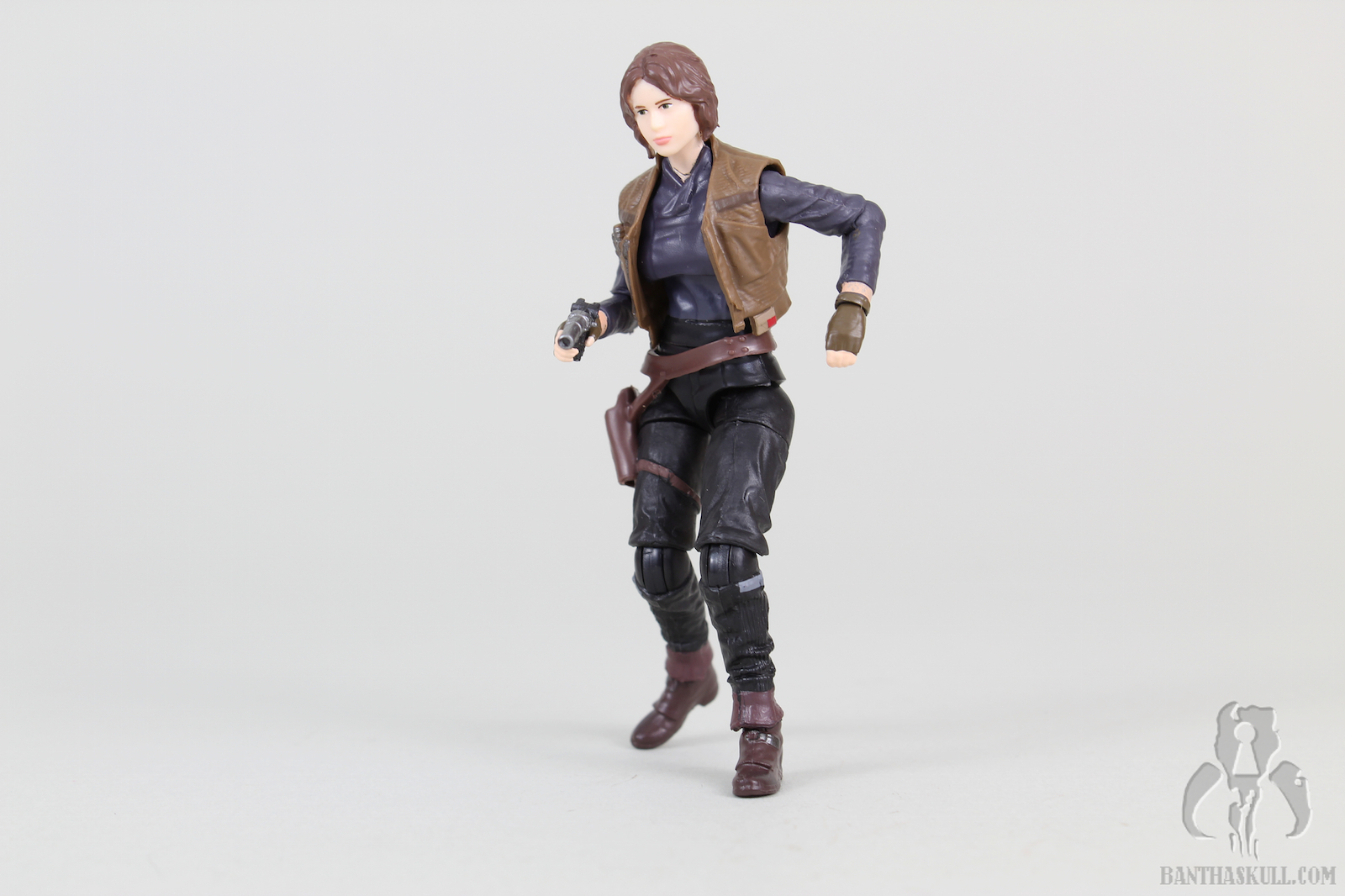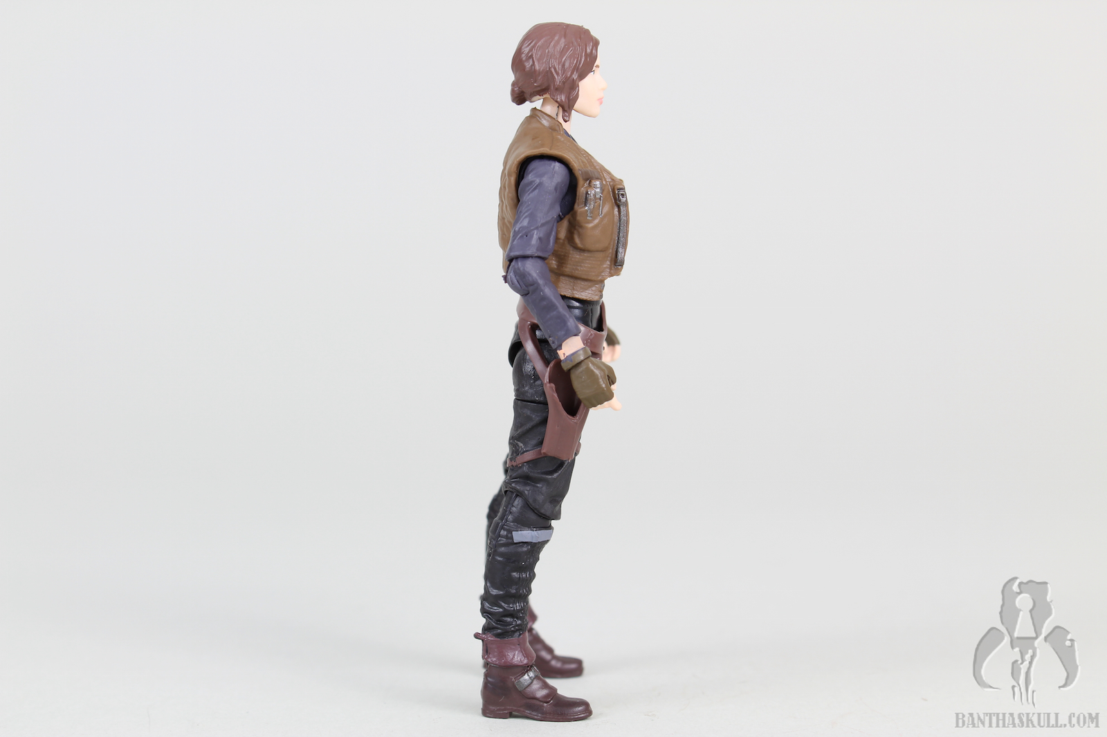 Jyn has 14 points of articulation, just like Cassian. However, there is a slight drop in posability because the wrists are swivel only, and do not have the two-way articulation as does Cassian. It suffers from “diaper crotch”, which is unfortunate. While the belt and holster do mask this a bit so it’s less offensive than on, say, Resistance Tech Rose, it still stands out too much and definitely impacts the aesthetics of the figure.