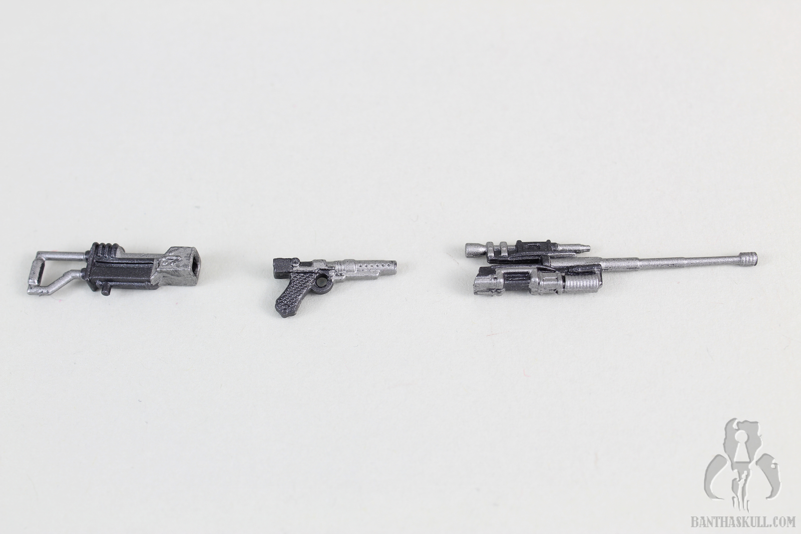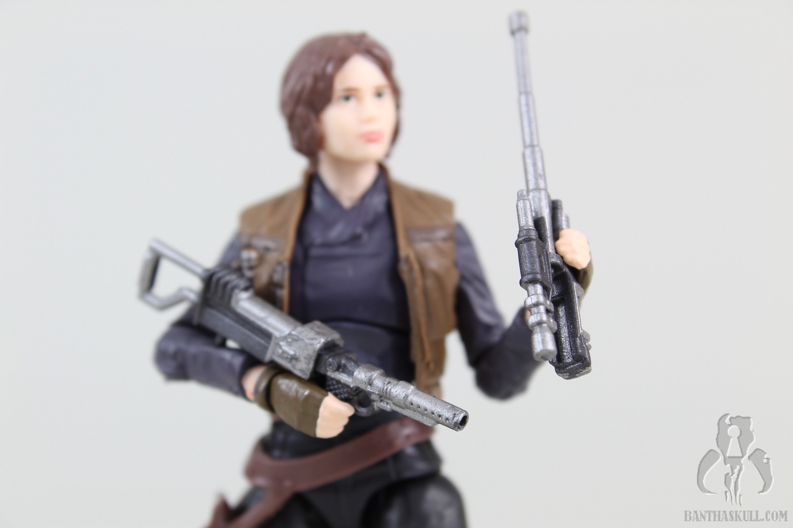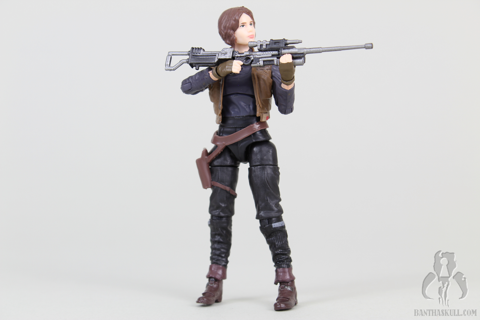The vest is removable, and it is practical to do so if you wanted an alternate display option, because the shirt underneath is a single color and does not suffer from baseballshirt-itis. (That’s a thing. Check WebMD.) Jyn’s pistol can fit nicely in her hand, although she lacks a real trigger finger. Her index finger is sculpted separately, but is too stubby to actually fit inside the trigger guard. Othewise, Jyn is able to grip it well. It also fits snugly in her holster. Like Cassian, the belt/holster is sculpted as a separate piece but the holster is glued to the right hip. This has a slight impact on the versatility of the hip joint movement range, but not enough to be a significant negative. The pistol is also one of three parts of a larger rifle assembly. It’s a neat feature, and works very well. However, it might be preferable to have included a full rifle as a separate accessory. It’s unfortunate that the basic swivel wrist articulation cannot accommodate the range of rifle aiming poses that can be achieved by the Cassian figure. But, importantly, Jyn is able to achieve the THWG.**