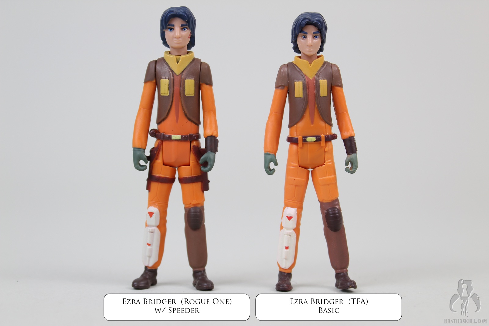 The Ezra Bridger figure is different from the previously reviewed TFA basic figure, which itself is a repack. This figure features a few distinctive differences. The paint applications are a bit different, which may or may not be preferable, depending on your tastes. The face has painted battle scars on Ezra’s left cheek, which have been absent from previous incarnations of the character. He has a belt / ammo pack / weapon hook assembly that is sculpted onto his legs and waist.