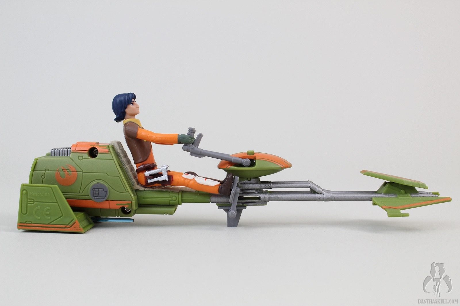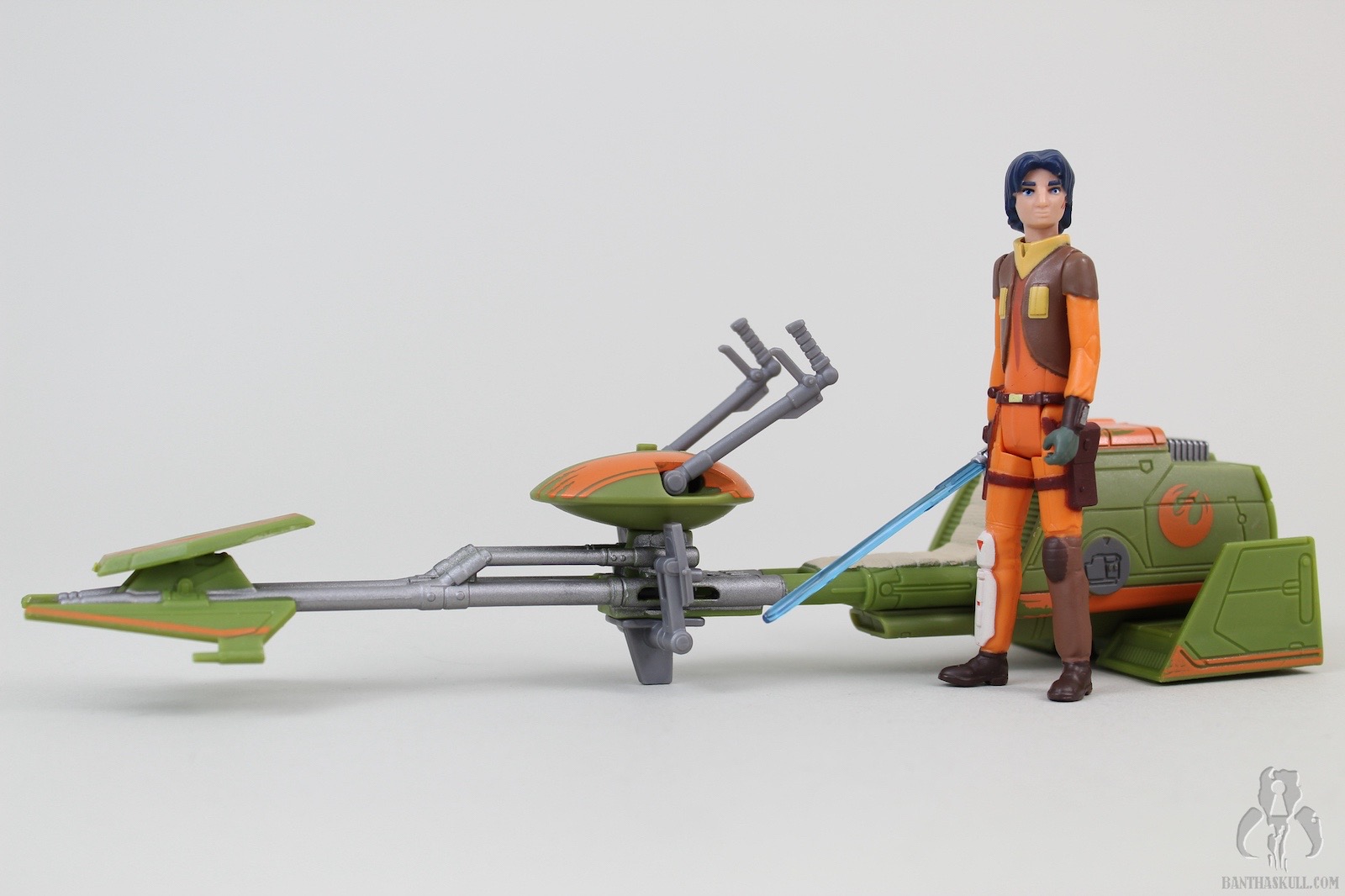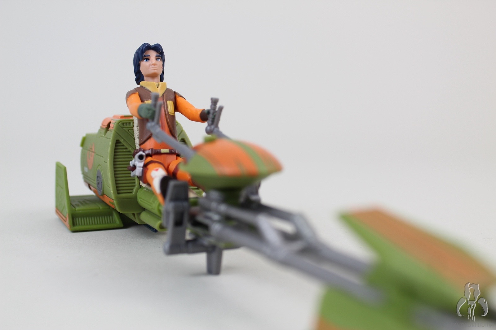 The speeder has some neat bells and whistles. For one, the foot pedals are adjustable (forward and back), which accommodate Ezra’s short stature as well as taller figures that you might want to pose in the seat. The handle bars swivel, which will also accommodate different figures. The back of the speeder has a little door that can flip open, revealing a storage space. This is awesome. While Ezra comes with a weapon that can fit inside (more on that in a bit), other accessories, such as his cadet helmet (from other versions) or any other whatnots can fit inside. Storage for figure accessories is something that is always welcome in the vehicle or playlet line, and this one was done flawlessly. Finally, there is a notch on the underside of the speeder that allows Ezra’s lightsaber blade to snap in place. The blade can also fit inside the aforementioned storage space, but this particular notch was added as well. You can also pretend that the blade is a missile, if you had such. wild imagination. The speeder is well balanced, sits on the ground firmly, and accommodates a seated figure very well.