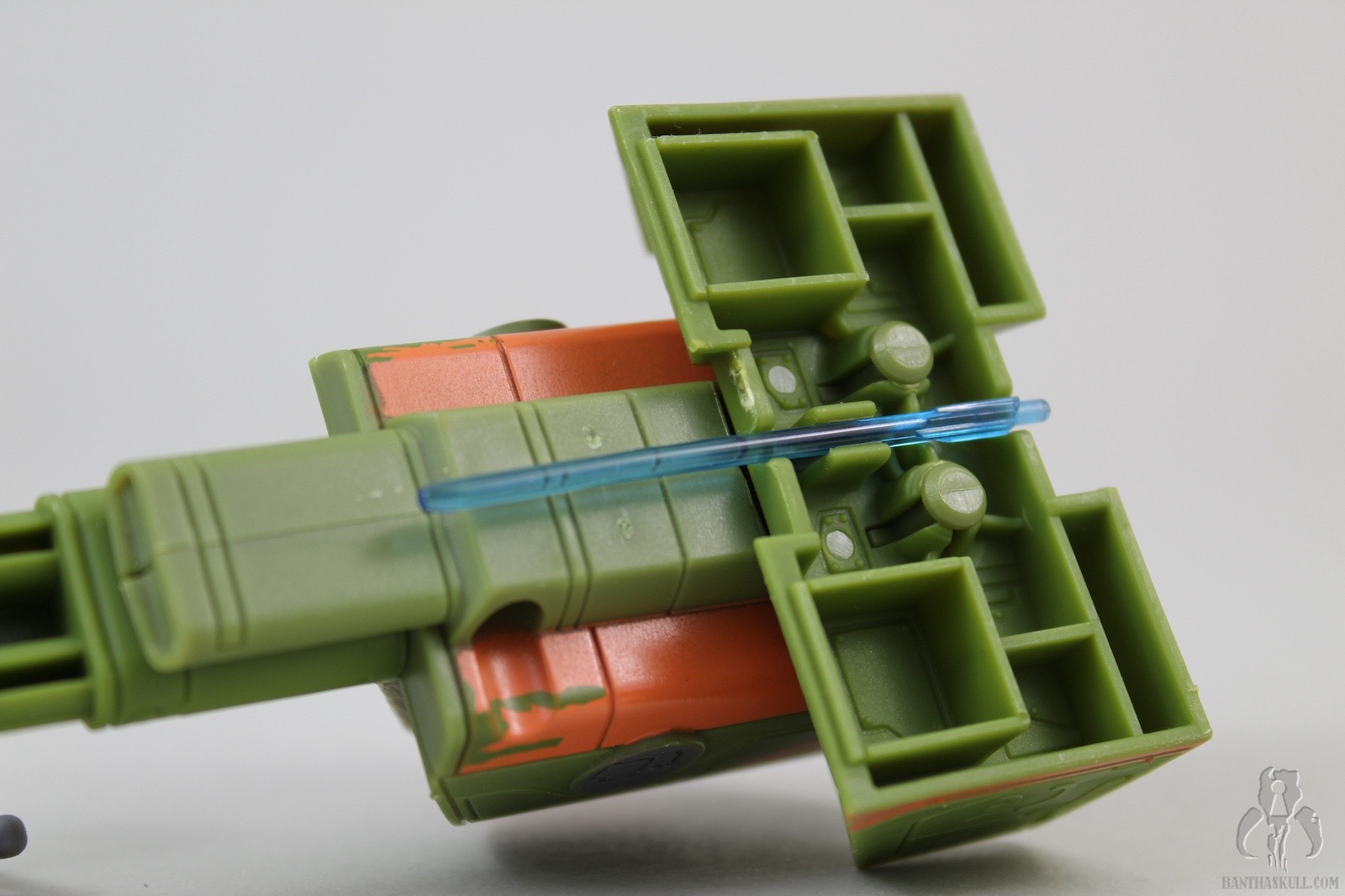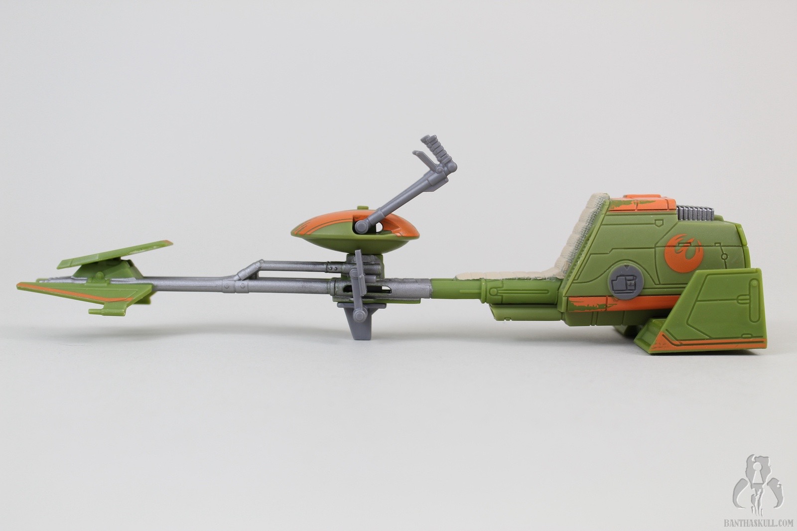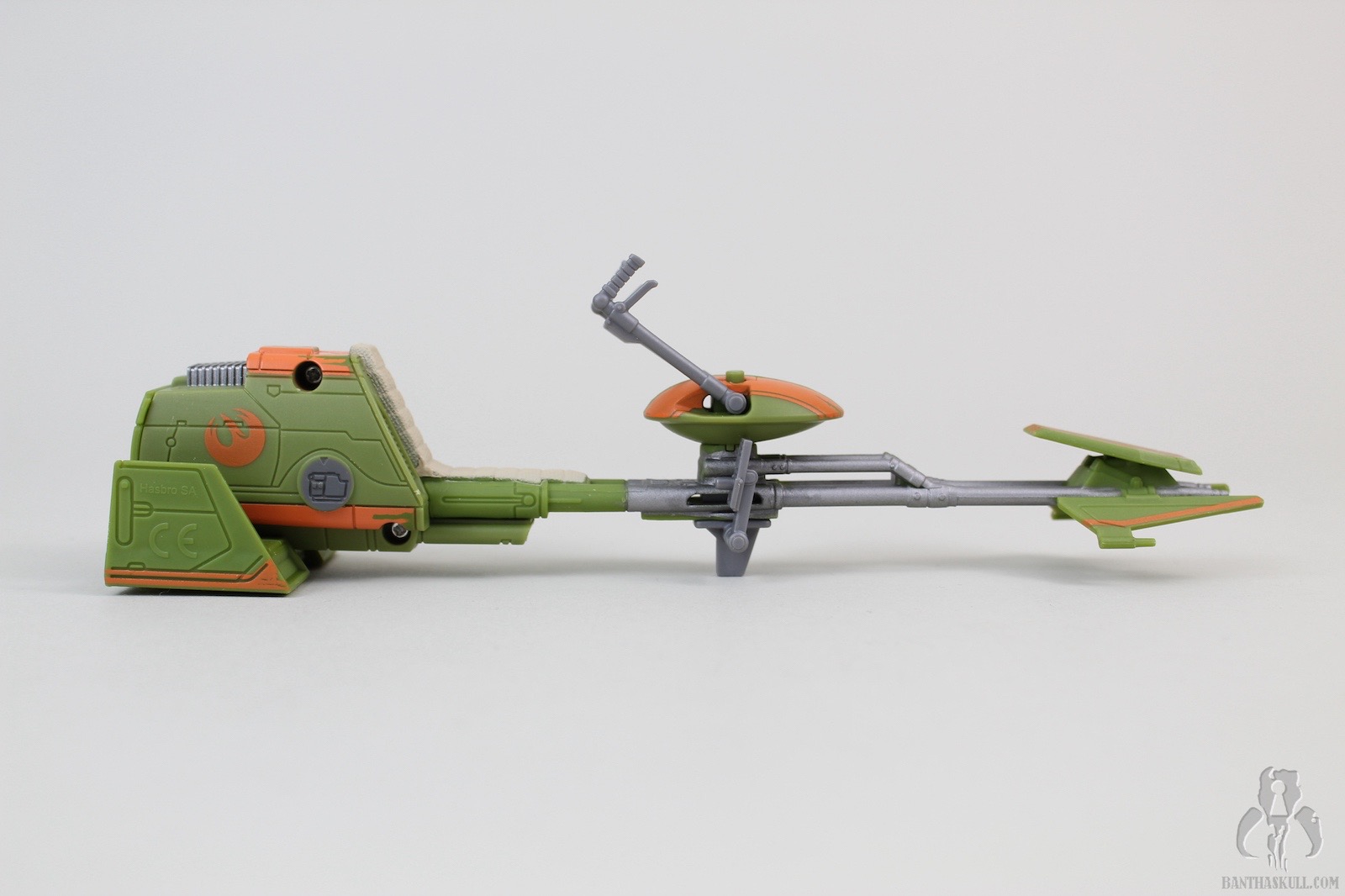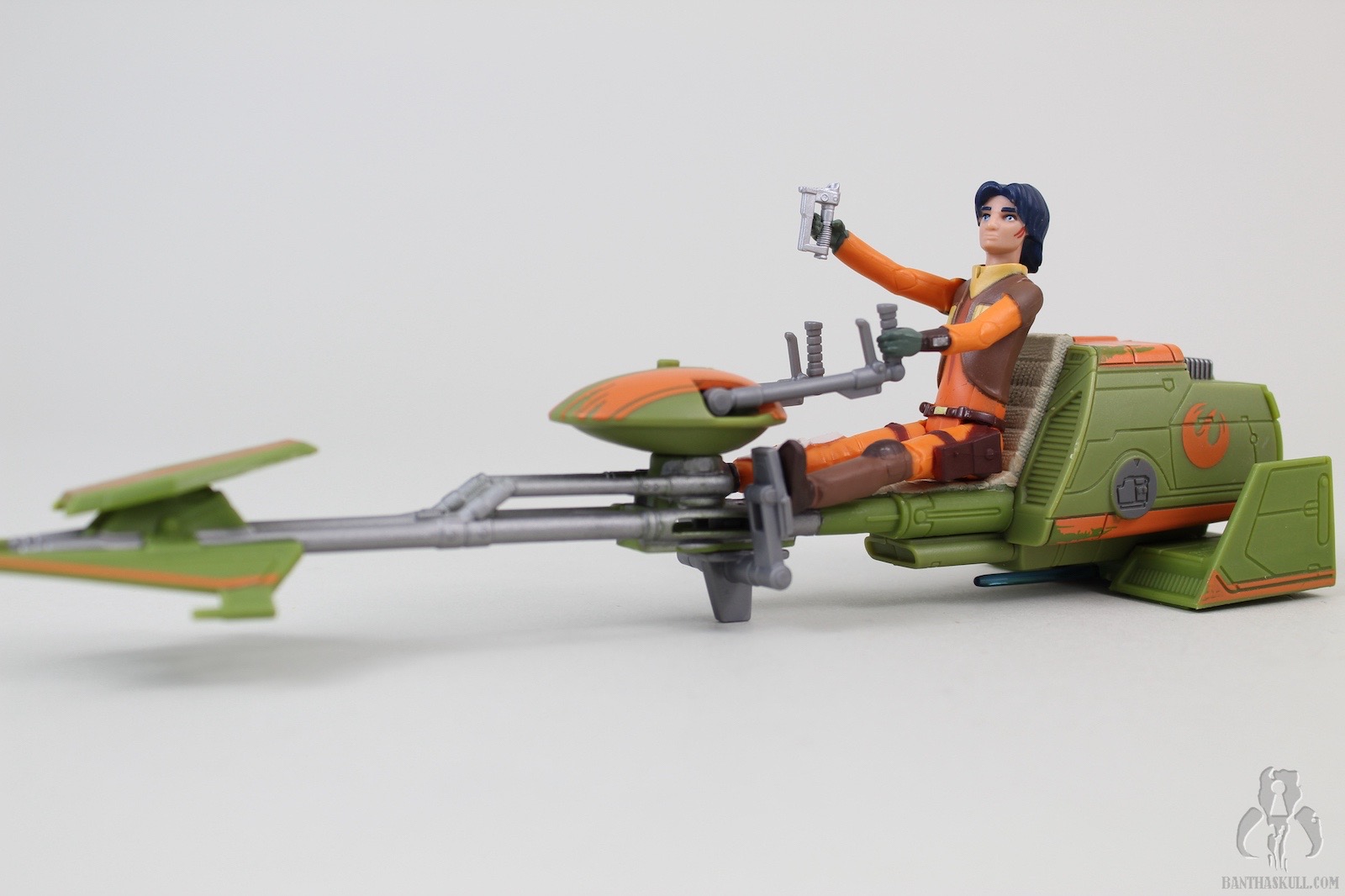 The speeder has some neat bells and whistles. For one, the foot pedals are adjustable (forward and back), which accommodate Ezra’s short stature as well as taller figures that you might want to pose in the seat. The handle bars swivel, which will also accommodate different figures. The back of the speeder has a little door that can flip open, revealing a storage space. This is awesome. While Ezra comes with a weapon that can fit inside (more on that in a bit), other accessories, such as his cadet helmet (from other versions) or any other whatnots can fit inside. Storage for figure accessories is something that is always welcome in the vehicle or playlet line, and this one was done flawlessly. Finally, there is a notch on the underside of the speeder that allows Ezra’s lightsaber blade to snap in place. The blade can also fit inside the aforementioned storage space, but this particular notch was added as well. You can also pretend that the blade is a missile, if you had such. wild imagination. The speeder is well balanced, sits on the ground firmly, and accommodates a seated figure very well.