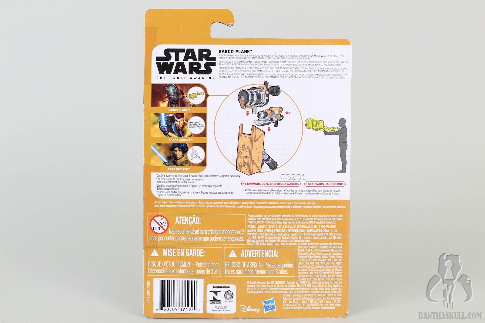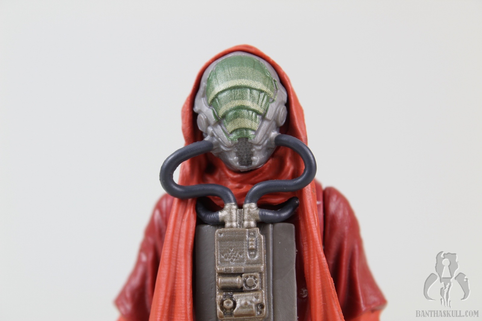 This figure would be awesome if it was from the OT, but again, collectors aren’t fans. A combination of the 5POA format, a lukewarm reaction to TFA, and just general orneriness has caused old school collectors to shun, even mock, this figure and others like it from the line. It’s too bad. It’s actually a pretty good figure, 5POA and all. It does its job. It has a very nice sculpt, with a fair amount of texture in the clothing. The separately sculpted face mask/hose/chestbox/scarf combo thing is very well done, both in the sculpt and in the paint applications. The air tank on his back is painted well and looks nice. An SA version of this figure would actually be pretty cool, especially if it had a soft goods robe. The included blaster rifle is very interesting looking. It looks perfect as a scavenged hunk of tied together weaponry. Too bad the paint is plain, a little bit of color variation for the straps and some metallic weathering would have gone a long way in bringing it, and the figure, to life. The figure comes with a build-a-weapon…thing…that he can hold and aim without falling over.