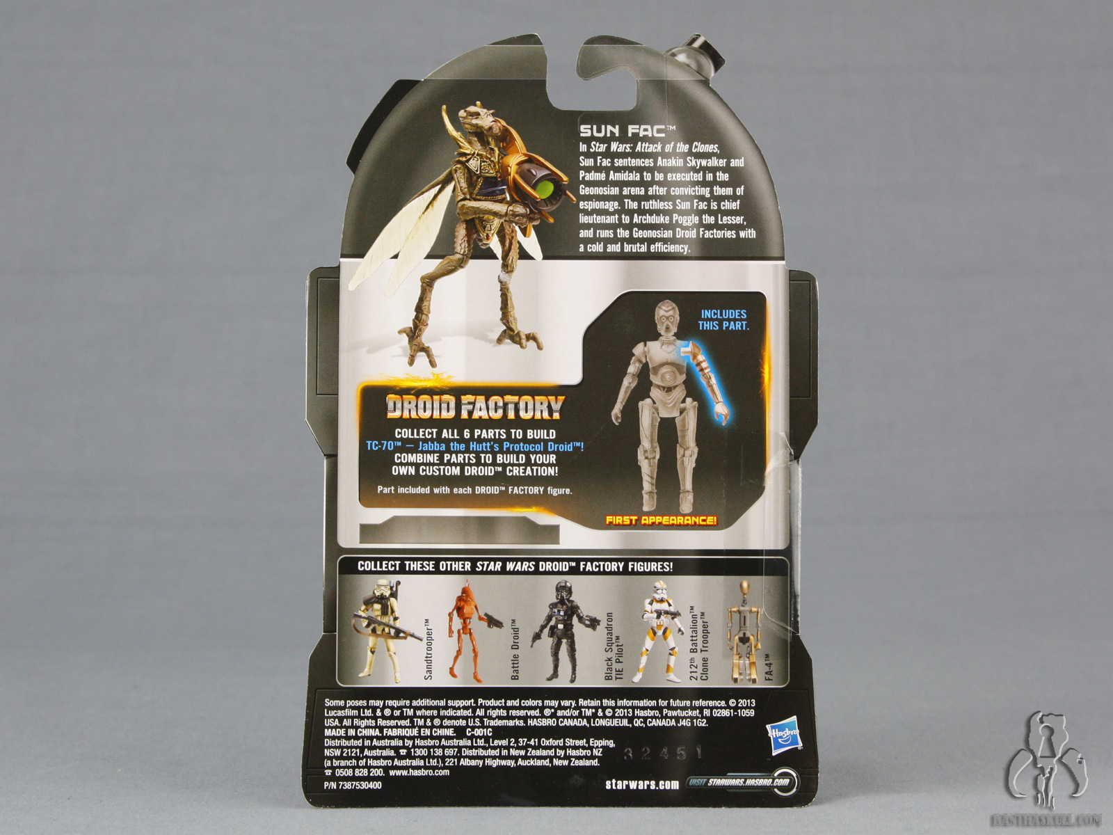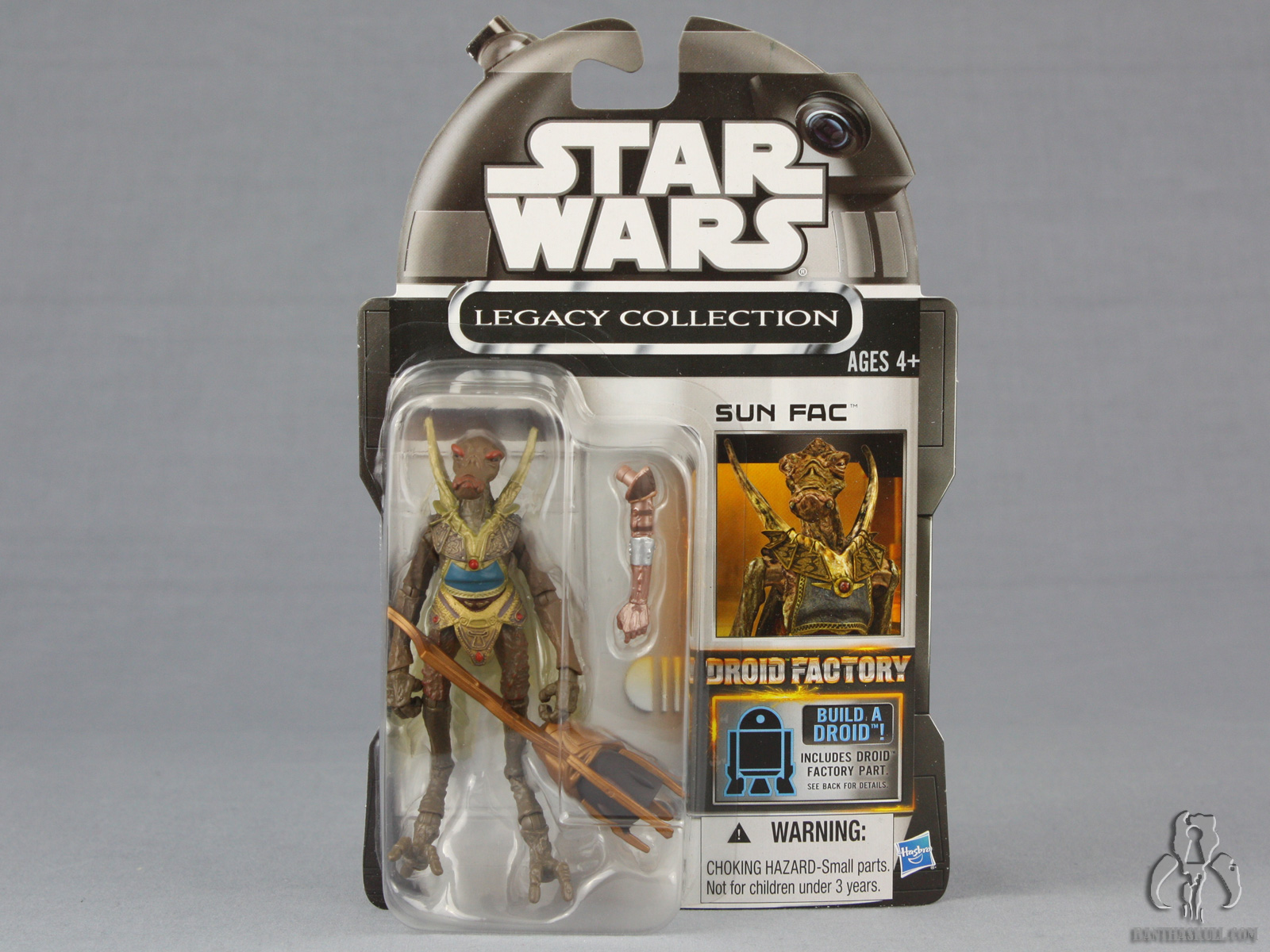 It’s fitting that this figure originates from Geonosis because I’m more confused than C3PO with a Battle Droid body (boy that was a good gag). When this figure was first announced for the return of the Legacy Collection, it was billed simply as a “Geonosian Warrior” indicating an army builder. Fans groused because the head sculpt shown was the specific cycloptic mold that belonged to Sun Fac. According to the Sun Fac page on Wookieepedia, “Sun Fac’s right eye had either been sealed shut or [is] entirely missing.”