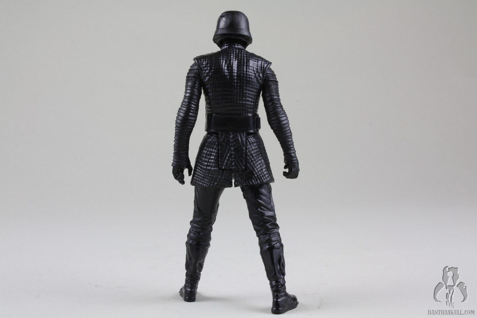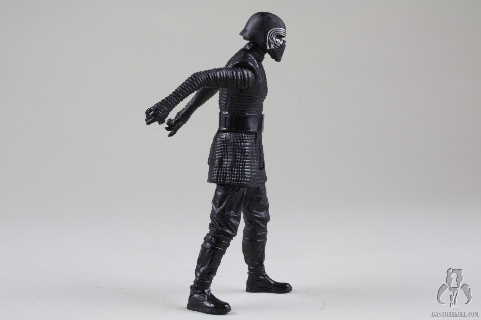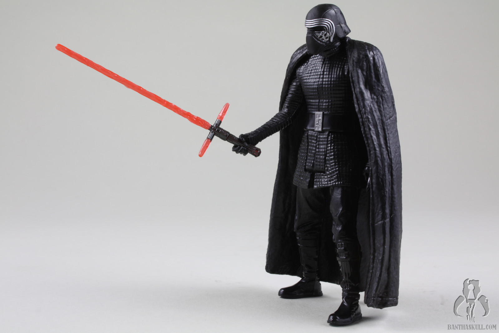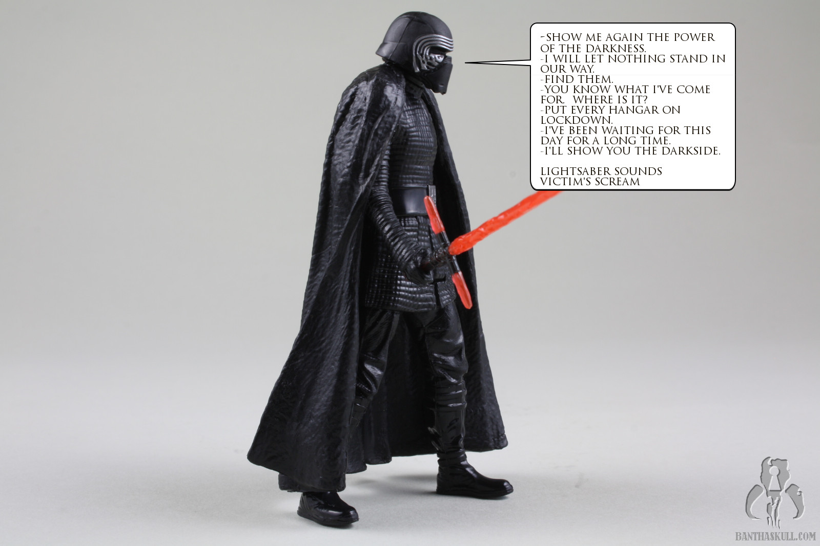 I should mention the figure a bit (even though most have quit reading by now). The starter set includes the only masked Kylo Ren figure released for The Last Jedi to date. The figure is 5POA, so it’s primary job is to stand assuredly and look good while doing so. It does. With the wide stance and prodigious clodhoppers, it stands securely. Due to the nature of the costume, it has only two sets of paint applications for the mask and the belt buckle, but they are cleanly applied. I really do want to call our readers’ attention to the paint applications on the mask. That is an intricate pattern, but it is applied cleanly and crisply. That should give collectors optimism about the quality we can hope to expect in the Vintage Collection. The figure succeeds at its job, but again, 5POA is what it is. One neat attention to detail is that all of the lines of dialog are obviously while Kylo Ren is wearing the helmet.