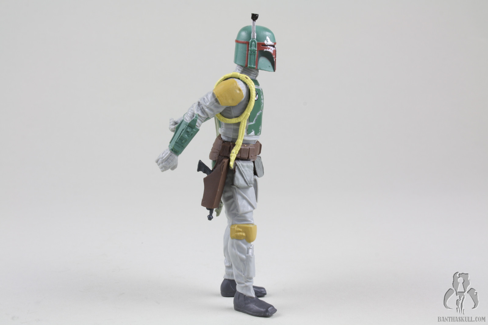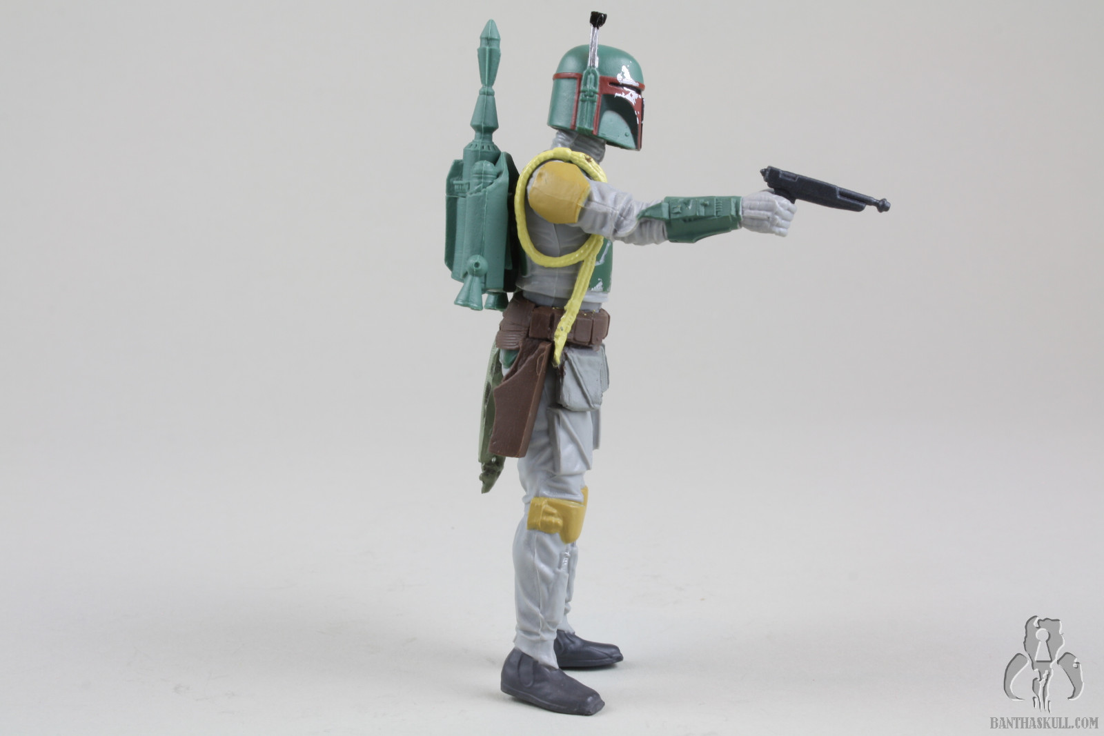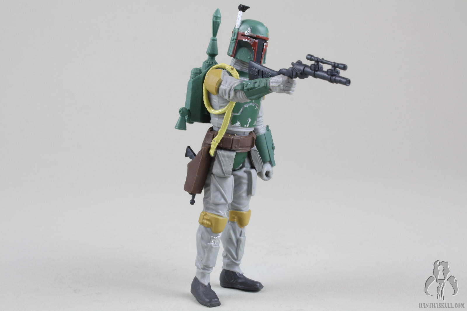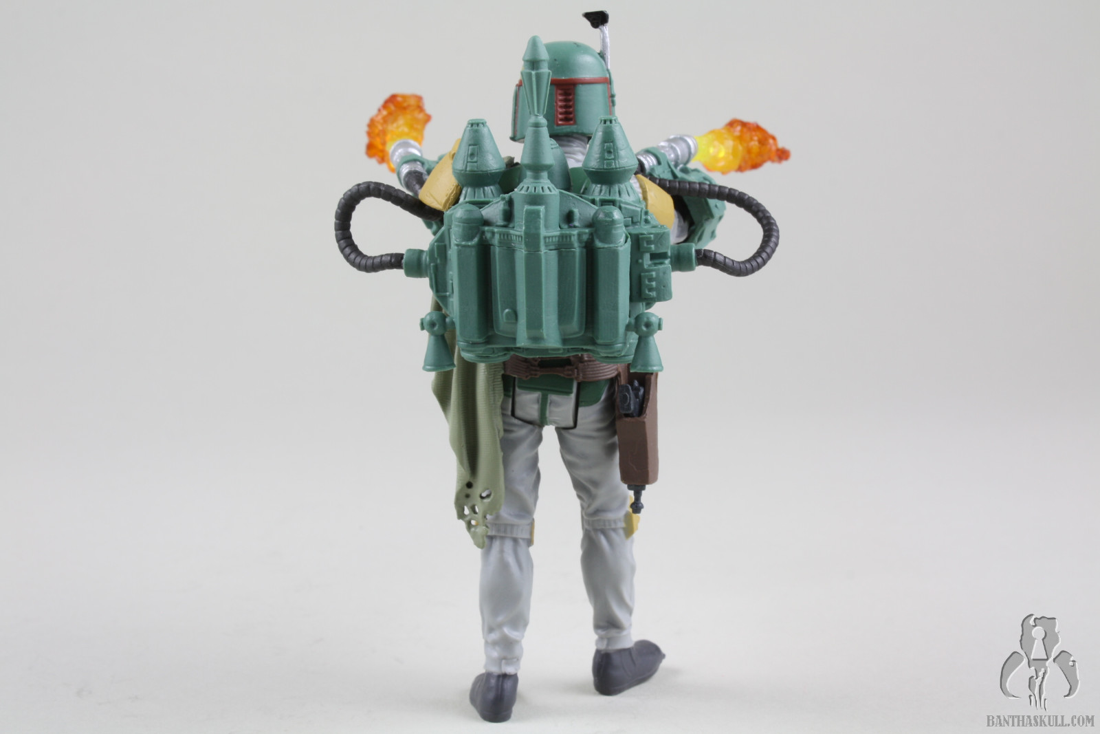 Still, the Fett figure has its issues beyond the limited articulation. I don’t know if this is endemic of the entire production run, or if it’s just my sample, but the figure’s right foot is wonky, to put it mildly. It’s turned inward and makes it difficult to stand the figure. That is why in most of the pictures above, the figure is listing to port. Or starboard. I’m not sure which is which. Sailing is stupid. The figure also doesn’t interact well with the BlasTech EE-3 carbine. It doesn’t seat well into the hand and is always in a somewhat twisted position. Finally there is the flame throwing backpack contraption. If you’ve read any of my reviews, you might have gathered that I have a low frustration tolerance. Action figures should interact naturally and easily with their accessories. This Fett figure and the flame thrower go together like fingers in a glove. There was zero frustration experienced (which surely disappoints nomadscout as he proofreads this). The figure’s hands curl around the flame thrower grips like they were made to go together. That’s probably because they were made to go together. At the risk of the losing my He-Man Play-Feature-Haters Club card, I kinda like this accessory. It’s neat. Also, we’ve been talking a lot about pliable plastics lately on the heels of Hasbro’s HASCON Star Wars panel. The pouches on the belt are another example of this. They easily move out of the way to allow the figure’s hip articulation to be engaged. In this respect, it’s another upgrade over the Evolutions figure.