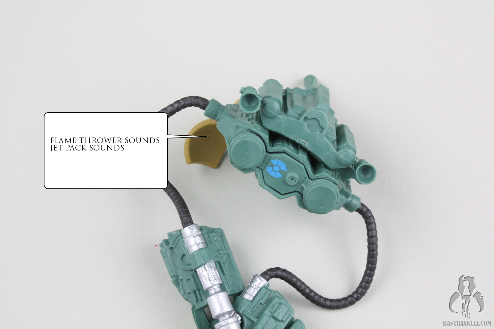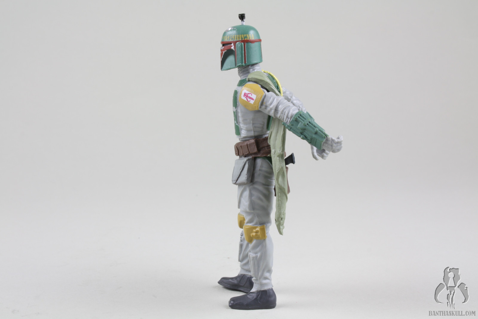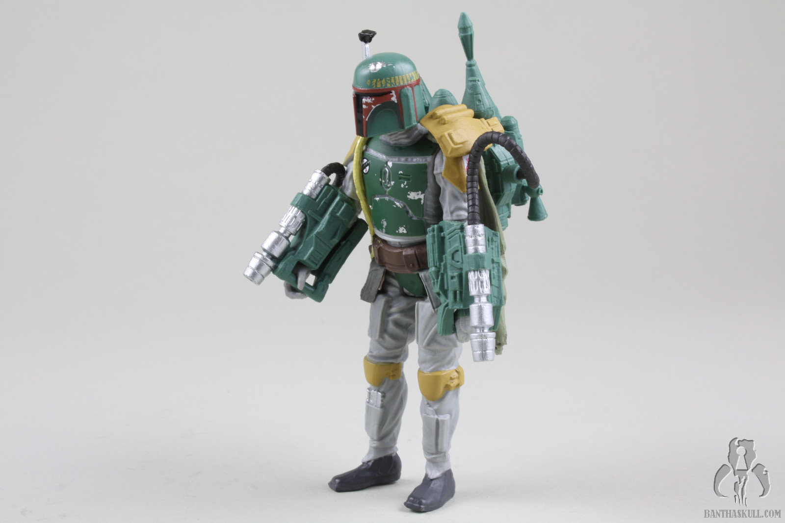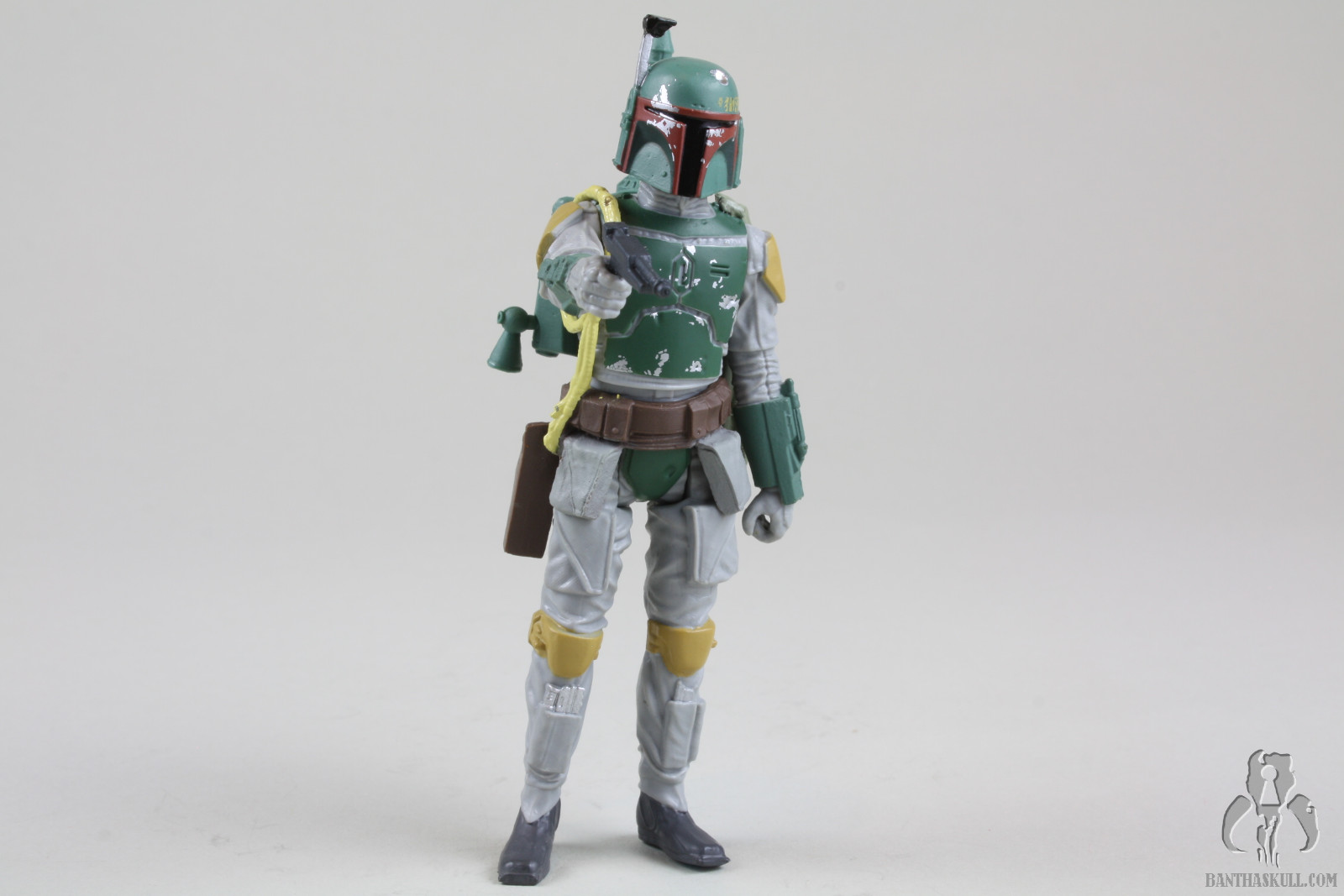 Still, the Fett figure has its issues beyond the limited articulation. I don’t know if this is endemic of the entire production run, or if it’s just my sample, but the figure’s right foot is wonky, to put it mildly. It’s turned inward and makes it difficult to stand the figure. That is why in most of the pictures above, the figure is listing to port. Or starboard. I’m not sure which is which. Sailing is stupid. The figure also doesn’t interact well with the BlasTech EE-3 carbine. It doesn’t seat well into the hand and is always in a somewhat twisted position. Finally there is the flame throwing backpack contraption. If you’ve read any of my reviews, you might have gathered that I have a low frustration tolerance. Action figures should interact naturally and easily with their accessories. This Fett figure and the flame thrower go together like fingers in a glove. There was zero frustration experienced (which surely disappoints nomadscout as he proofreads this). The figure’s hands curl around the flame thrower grips like they were made to go together. That’s probably because they were made to go together. At the risk of the losing my He-Man Play-Feature-Haters Club card, I kinda like this accessory. It’s neat. Also, we’ve been talking a lot about pliable plastics lately on the heels of Hasbro’s HASCON Star Wars panel. The pouches on the belt are another example of this. They easily move out of the way to allow the figure’s hip articulation to be engaged. In this respect, it’s another upgrade over the Evolutions figure.