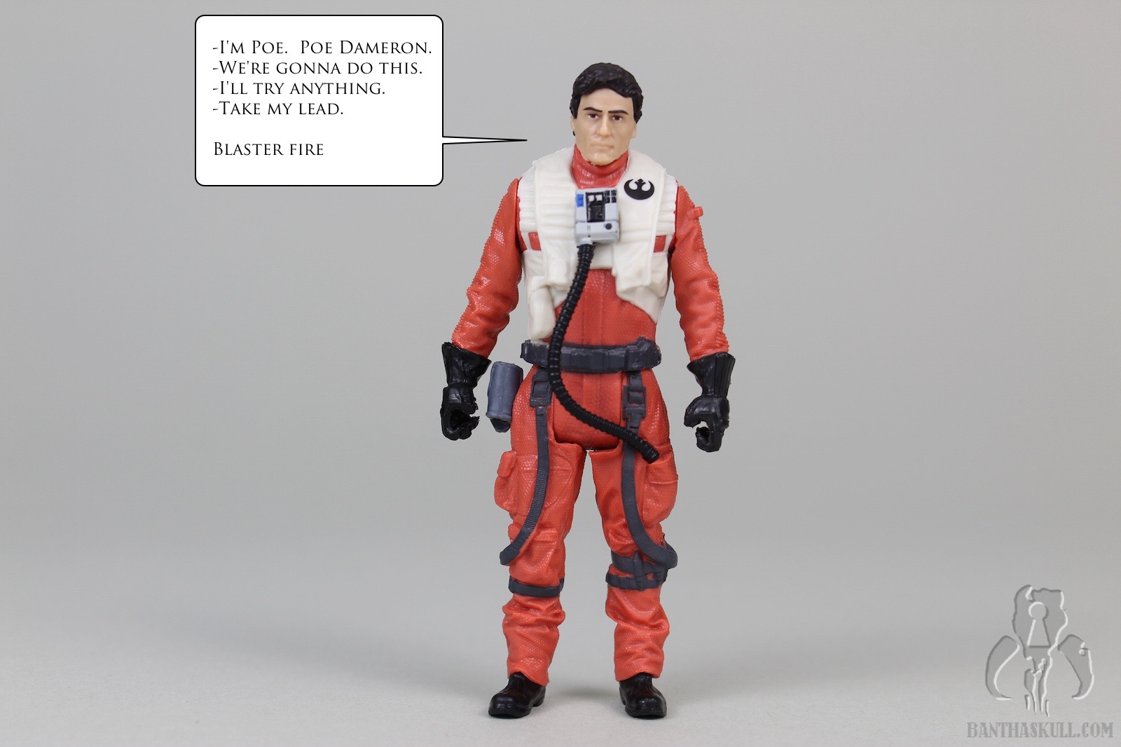 There are some improvements. The most absolutely necessary change was to give a removeable helmet to Poe. It isn’t exactly the spitting image of Oscar Isaac, but it can suffice. The helmet is good, and fits snugly. The “banana visor” concept was scrapped, for the love of all that is good and holy, and we now get the proper transparent visor. The pistol fits well in both the holster and hand. One surprise addition was articulated forearms. Facilitated by the long pilots’ gloves, the concealed articulation was added at the spot where the black glove meets the flight suit forearm. And finally, as with all figures so far in this line, Poe interacts with the Force Link Activator.