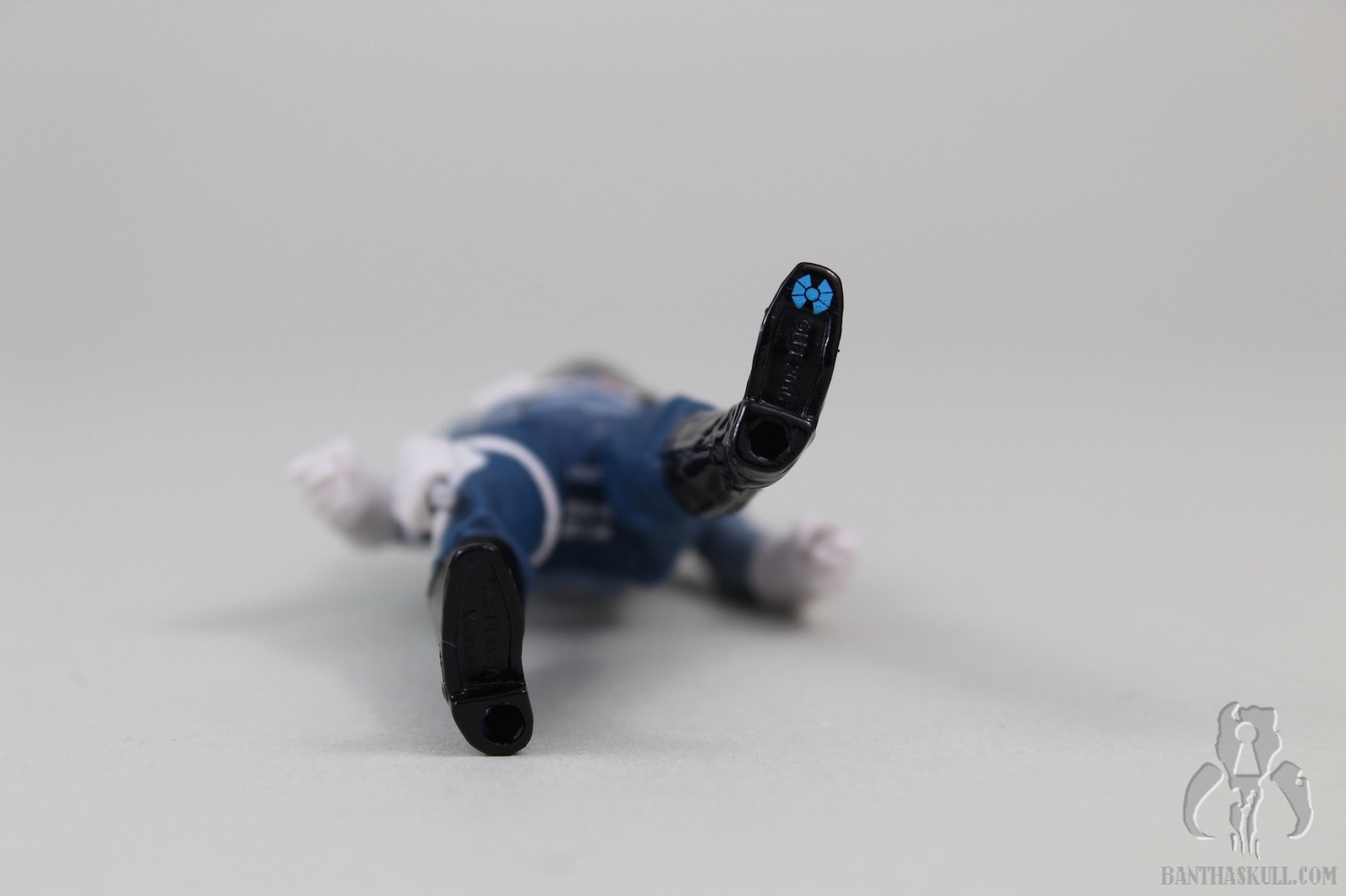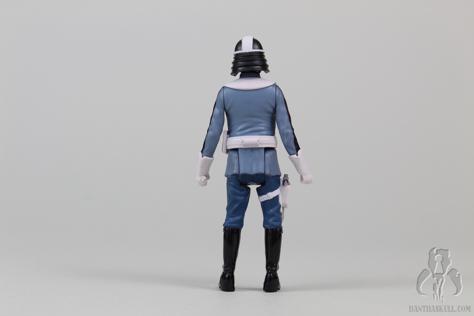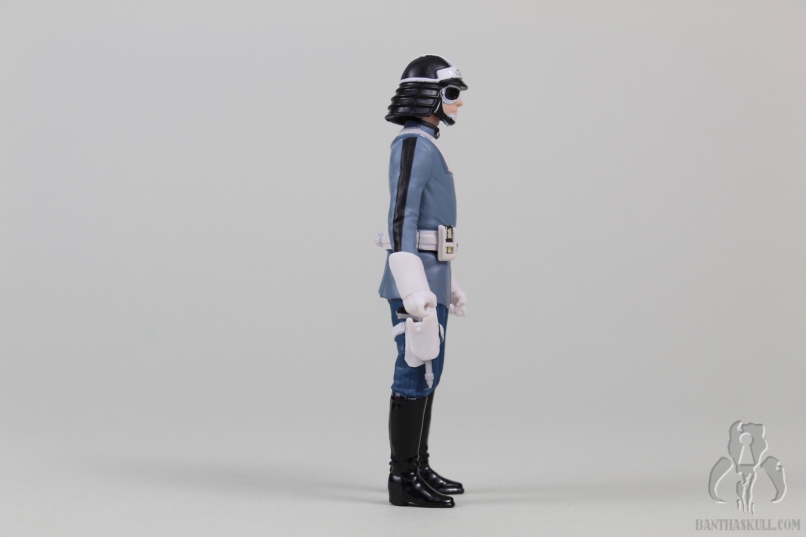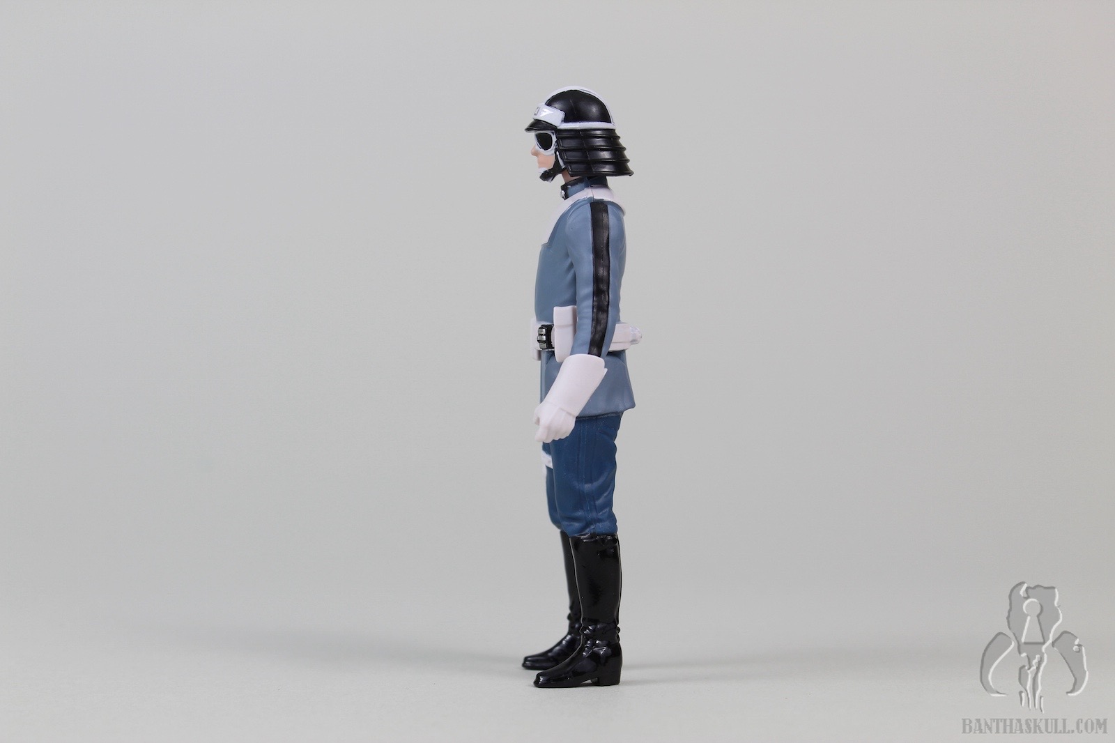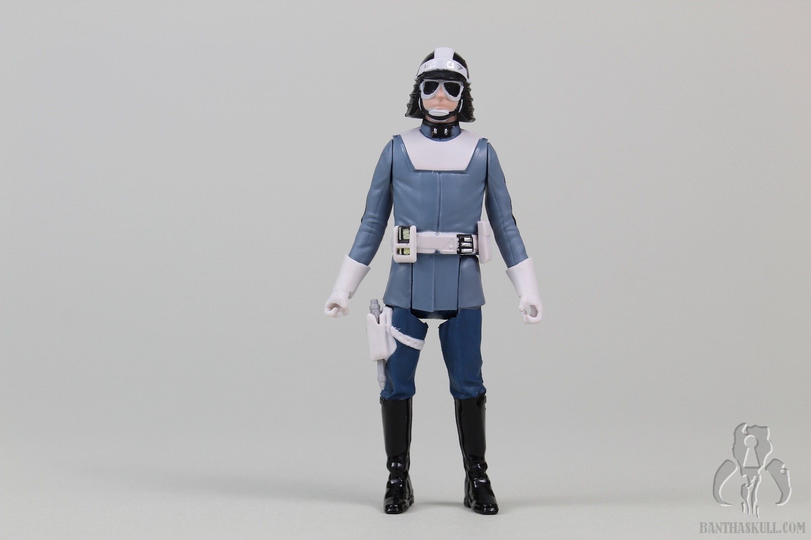 The pilot has an interesting look. I suppose it’s what a Star Warsy police officer should look like. He has Aurebesh writing on his helmet that says “CBPD”, in case you were wondering. The pilot can hold his pistol firmly, and it otherwise fits snugly in the holster. When seated in the cockpit of the Speeder, it’s a better fit than a lot of other 5POA pilots in their corresponding vehicles. It’s not perfect, despite the various articulated cockpit parts.
