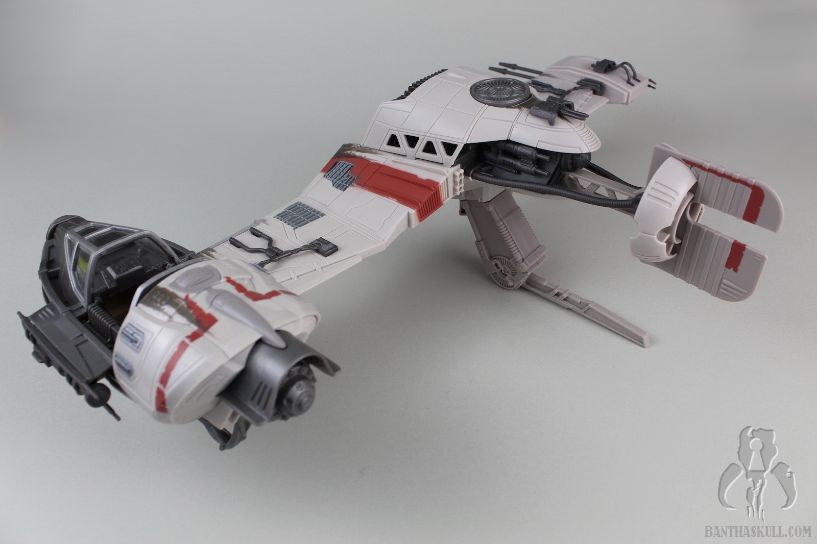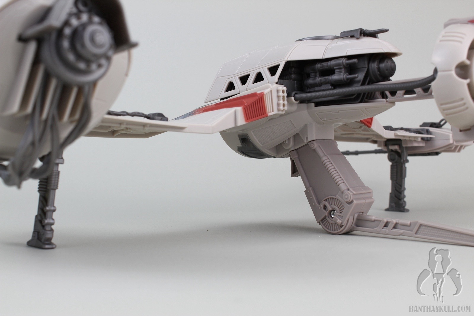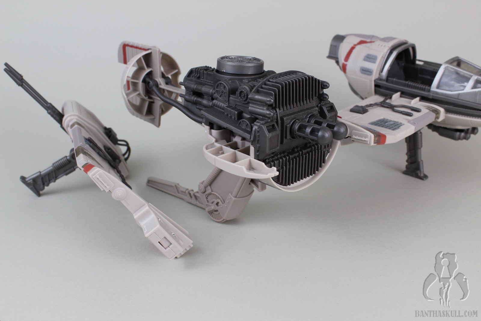 The speeder has 2 battle damage features. The cowl to the central engine is removable, which exposes the engine itself. Additionally, there is a large button on top of the engine that ejects the right wing.