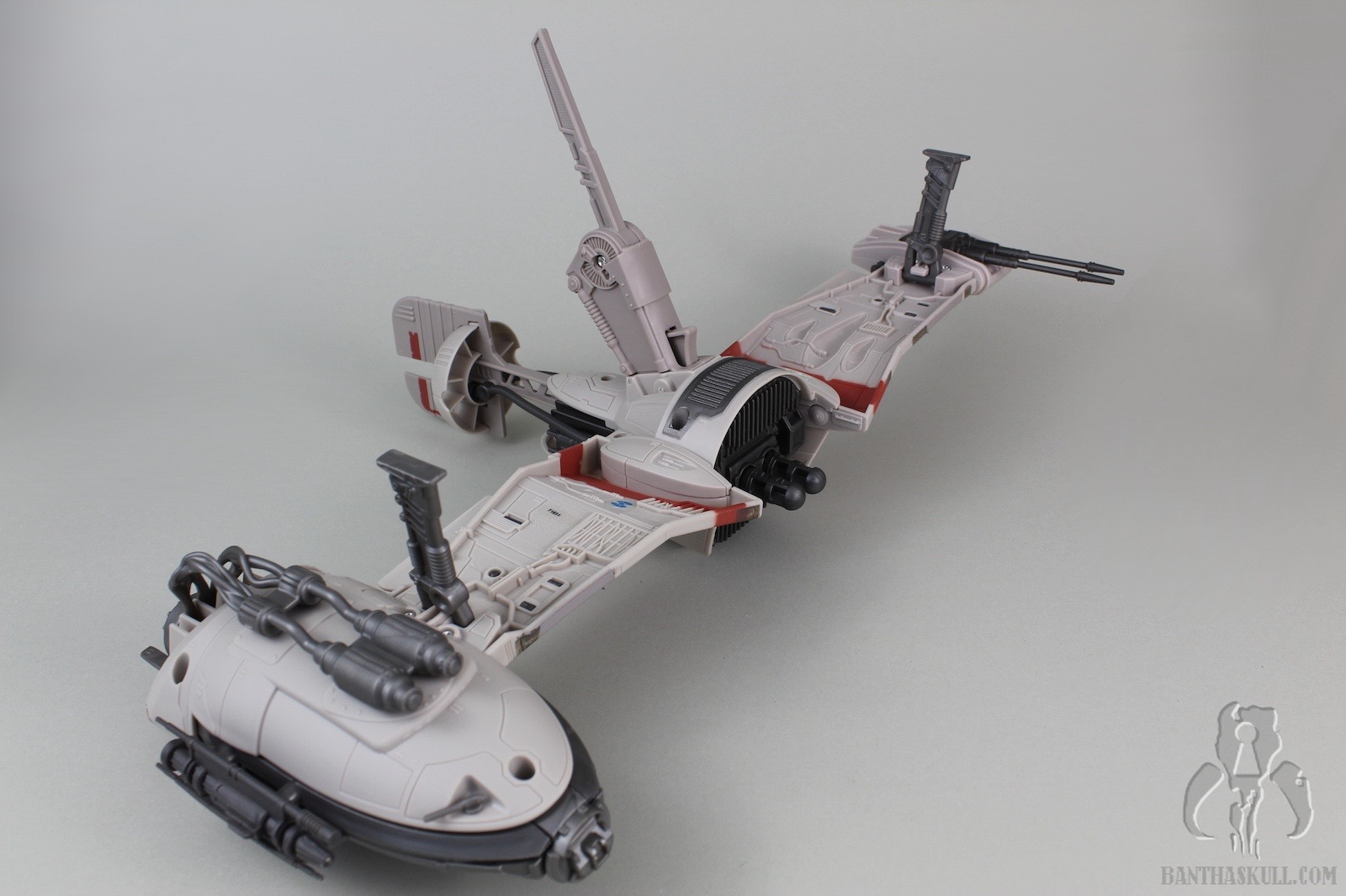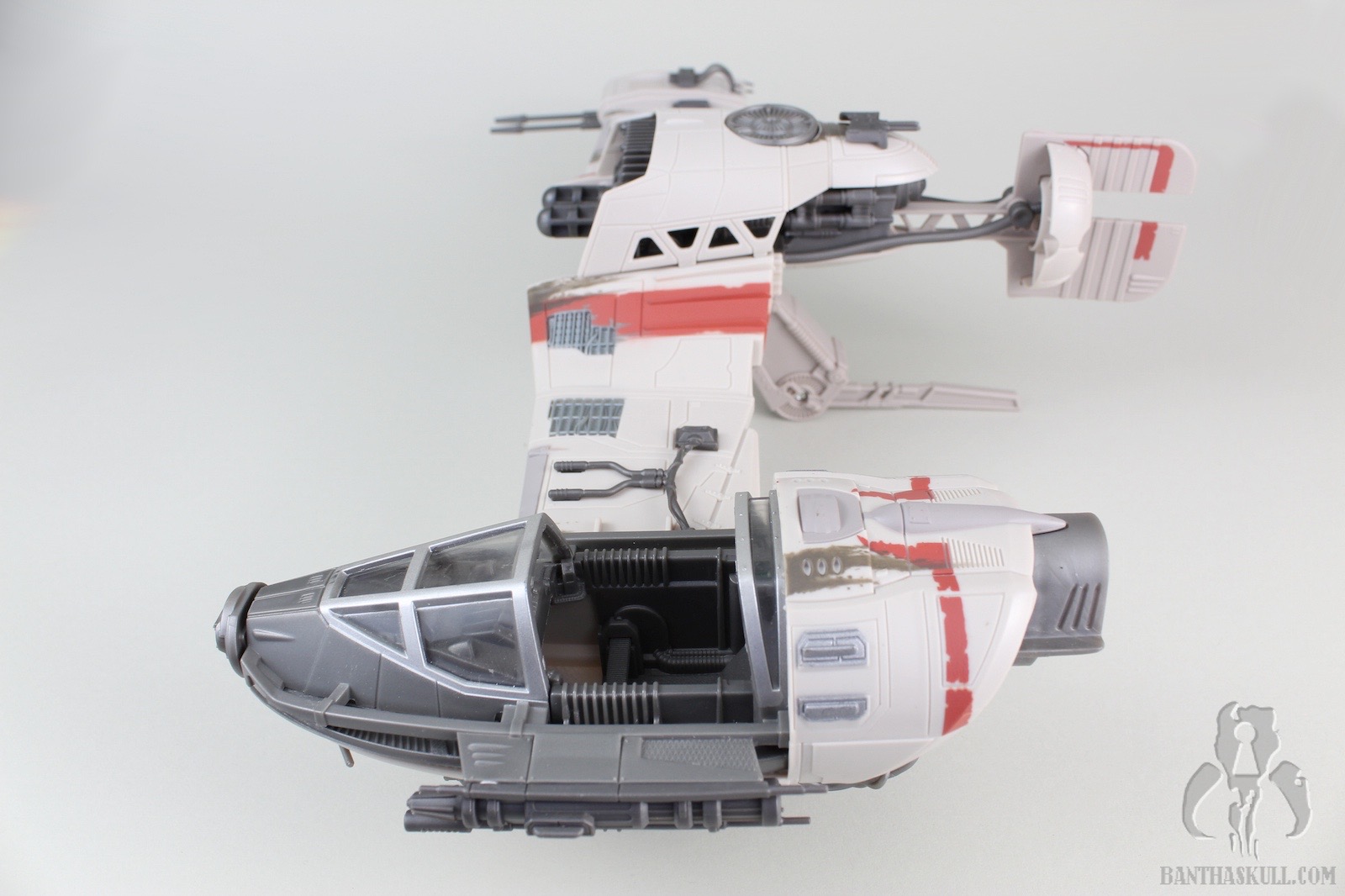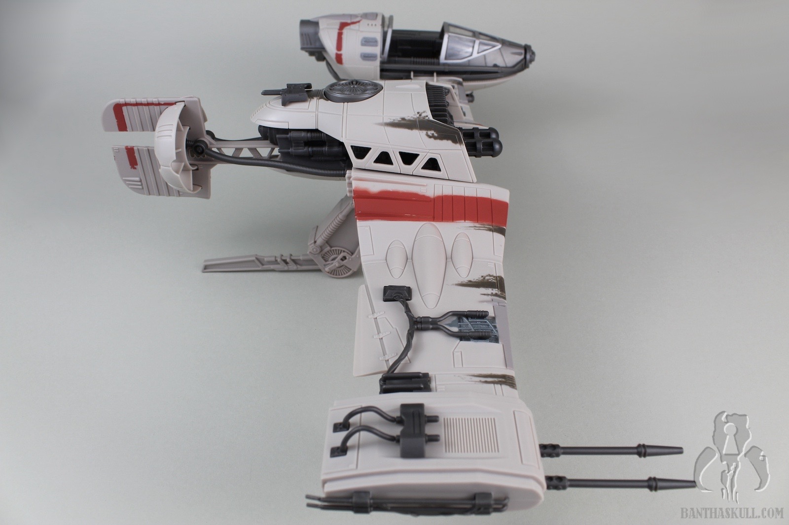 The speeder has 2 battle damage features. The cowl to the central engine is removable, which exposes the engine itself. Additionally, there is a large button on top of the engine that ejects the right wing.