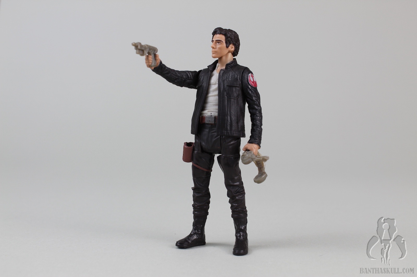 The Poe Dameron figure is 5POA, so there isn’t much to say. It serves its main purpose, which is to sit in the cockpit, although he does take a bit of maneuvering to get him to sit properly. He has a blaster which he can hold tightly, and also (thankfully) a holster, which also holds the blaster snugly. He has a headset which fits okay, but unfortunately is too loose. It’s hard to get the figure into the cockpit without the headset falling off repeatedly, which you have to try because getting the headset on after the figure is fully seated is hard unless you have pixie fingers. The paint on his face and hands is a bit sloppy, although it’s possible they’re going for some kind of battle damage look with cuts and scratches. Who knows at this point. The likeness to Oscar Isaac isn’t too bad, a decent effort at this scale. Overall, the figure looks good. He obviously lacks the desired super-articulation, but if he’s just sitting in the pilot’s seat, it doesn’t matter much. It is what it is.