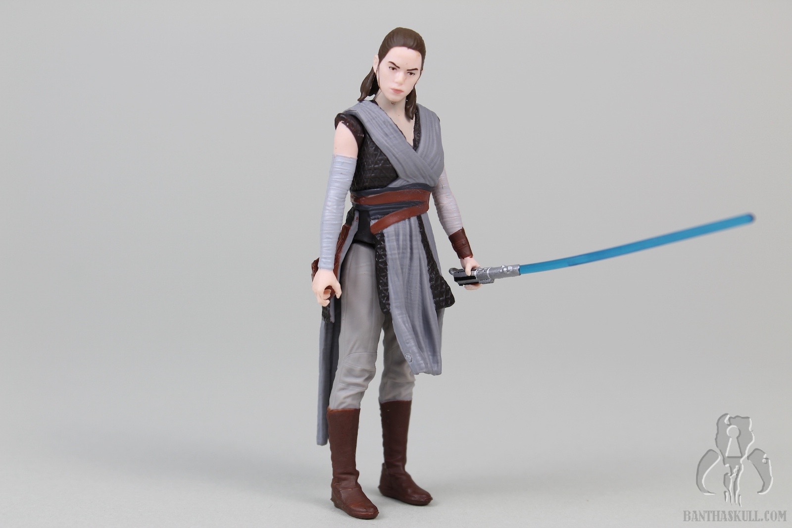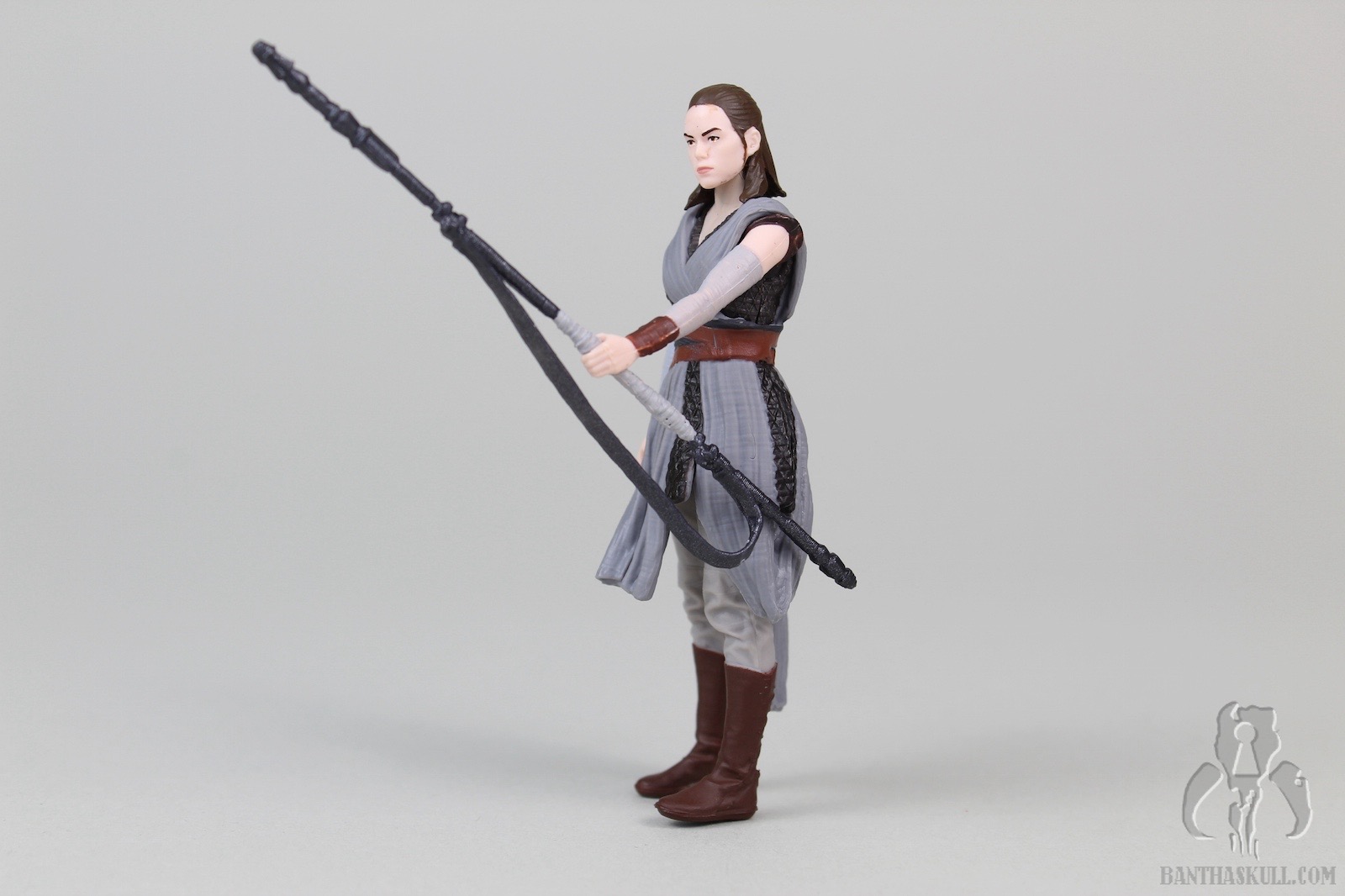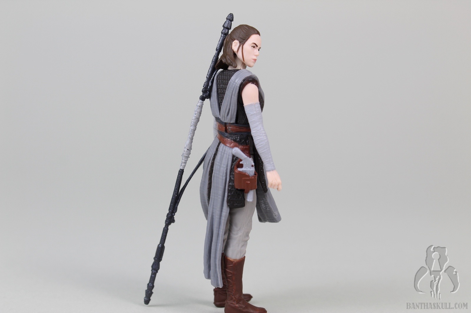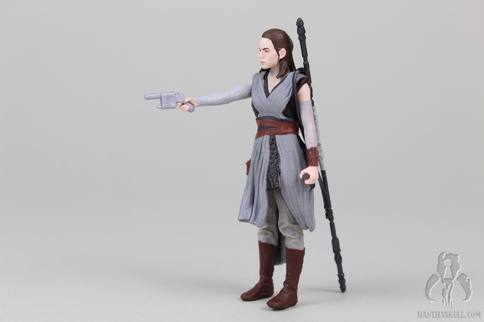 The pros: Rey has a reasonably complex design, with her mostly separately sculpted (non removeable) cross-body robes and belt. The different fabric textures are well done. The various colors don’t exactly “pop”, but are way more appealing than many of the other characters we’ve seen in the sequels. Paint is applied well, although my sample has some stray marks around the head and neck. The likeness isn’t terrible; she has a stern look on her face that seems suitable given the few short bits of promotional media we’ve seen so far. Three accessories are included. Rey tightly grips her magic pistol, and it fits snugly in the holster. Her staff has two colors and she can grip it in either hand. Her lightsaber can be held tightly, and it includes a sculpted loop at the base of the hilt.